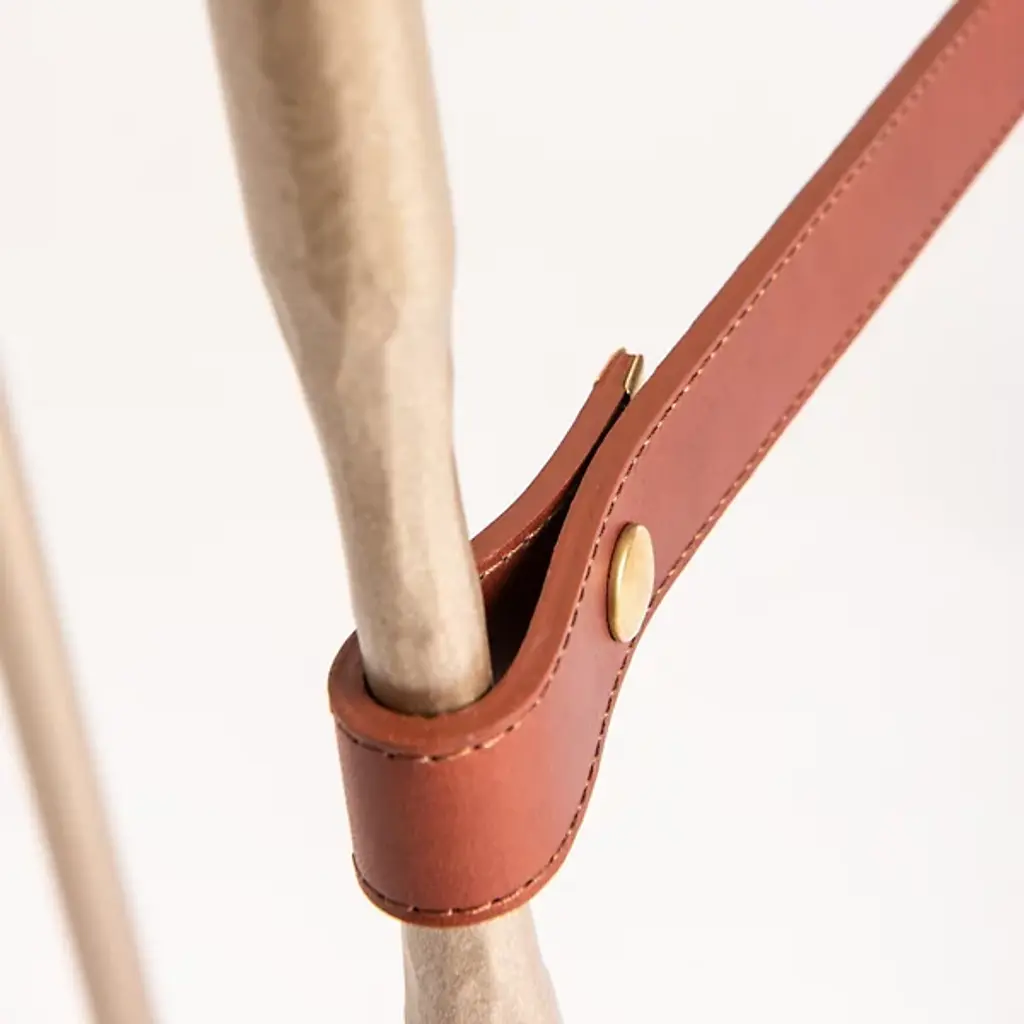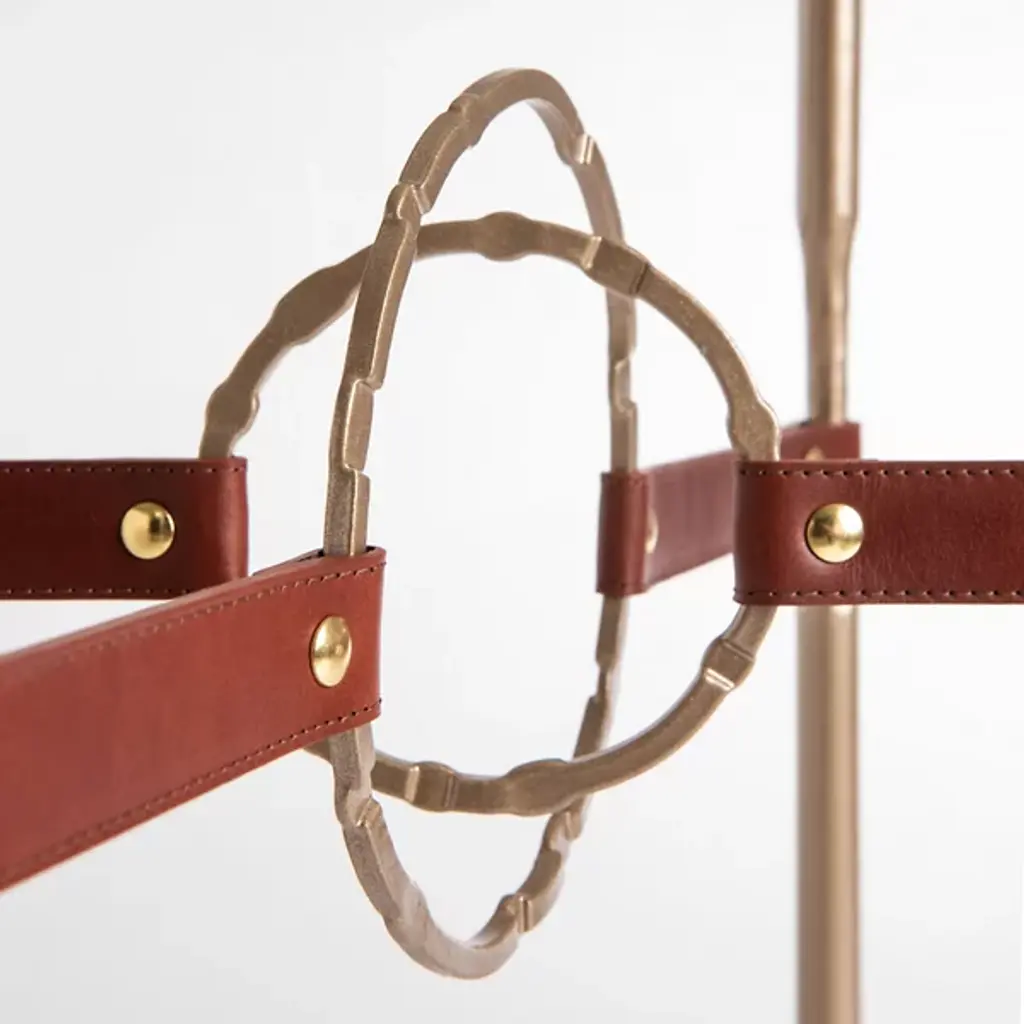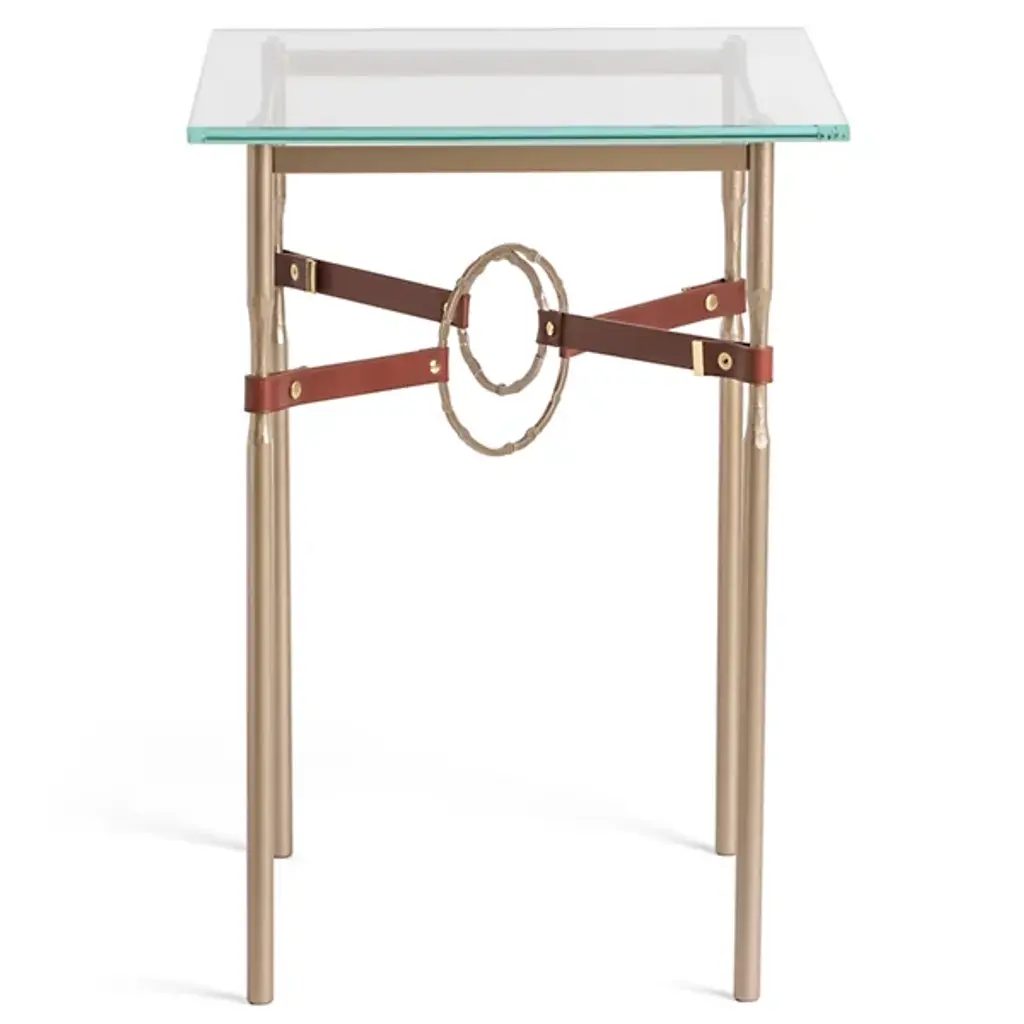 Equestrian-inspired furniture design for modern living spaces. The Equus Glass Top Side Table by Hubbardton Forge is a sturdy yet elegant piece, with a hand-forged steel frame topped by a thick square of tempered glass. The legs feature narrow, hand-fullered sections accented with straps of artisanal leather. In the center of the side table’s frame, hand-forged and hammered steel accent rings overlap to hold the leather straps taut. With a look evocative of horse martingales, this distinctive detailing provides unexpected—yet undeniable—decorative interest.
