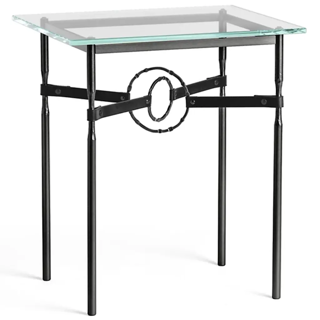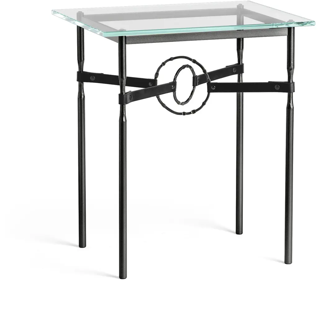 Equestrian-inspired furniture design for modern living spaces. The Equus Glass Top Side Table by Hubbardton Forge is a sturdy yet elegant piece, with a hand-forged steel frame topped by a thick square of tempered glass. The legs feature narrow, hand-fullered sections accented with straps of artisanal leather. In the center of the side table’s frame, hand-forged and hammered steel accent rings overlap to hold the leather straps taut. With a look evocative of horse martingales, this distinctive detailing provides unexpected—yet undeniable—decorative interest.