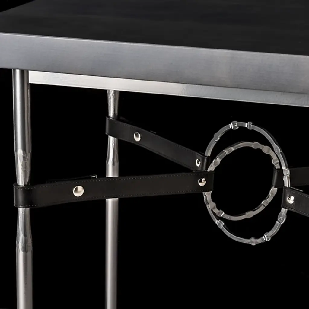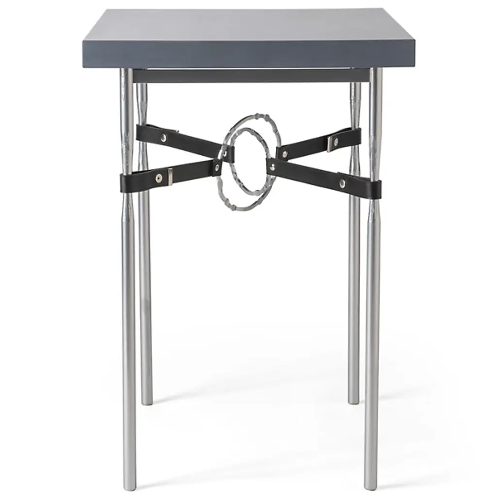 The Equus Wood Top Rectangular Side Table by Hubbardton Forge is designed with a remarkable industrial inspiration to give an edgy character to its softer, natural minimalism. This piece is crafted as a statement piece using the finest artisan-crafted materials, from its selection of Vermont maple to its fullered legs and accent leather straps. The centerpiece of the table is its set of hand-forged and hammered rings that are suspended by the straps to add to its structural character and bring out the full unique vision of the piece. This must-have piece is an elegant accent to designer sofas and armchairs, not to mention dining rooms and other centerpiece social spaces.