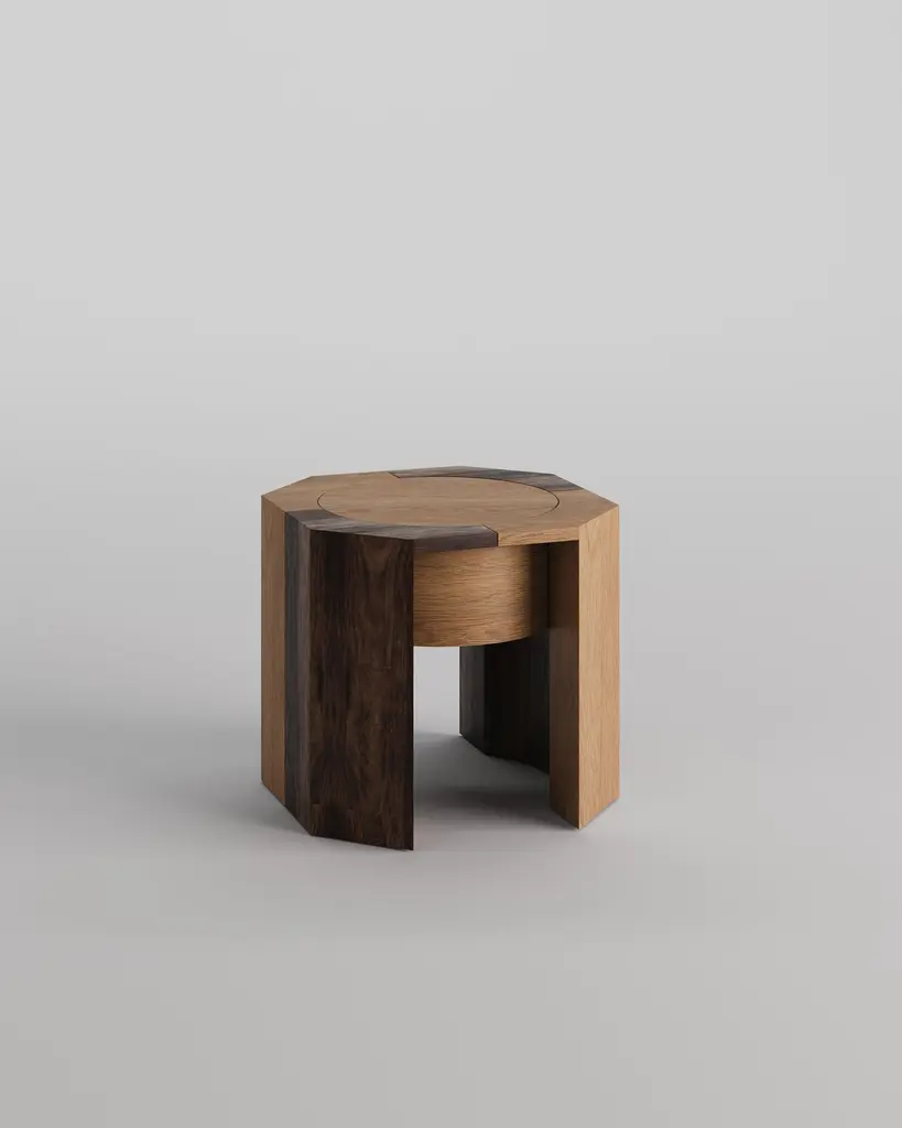 Era Side Table by Tuğçe GeyikDimensions: D 45 x W 45 x H 50 cm.Materials: Wood and cast iron.Tuğçe Geyik is an architect and designer based in Istanbul. She studied at Yildiz Technical University, Department of Architecture. She began her career by participating in interior design projects and continued to cultivate her interest in this field. She finds great joy in working across different mediums and aesthetics with an approach that is united by the same principles such as furniture and lighting design, interior design, 3D architectural visualization, interior styling, and creative direction. She handles colors, textures, and forms with a holistic approach as if creating a composition from the parts of a collage. She also blends her archive of materials and techniques from the past with forms from the future to create contemporary objects that bring awareness to inanimate beings.