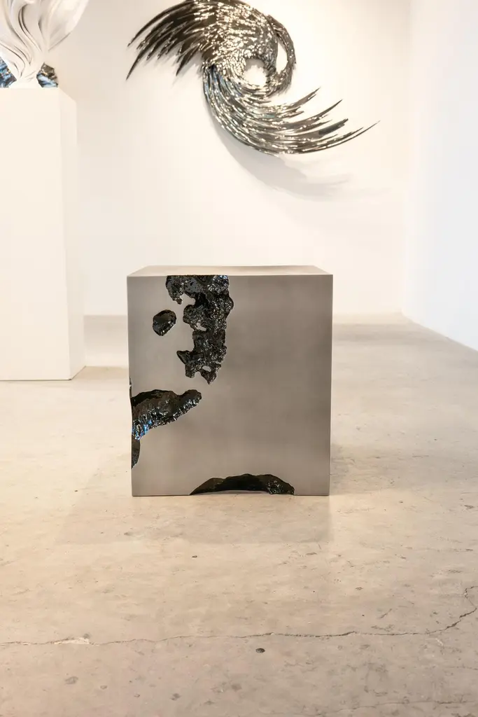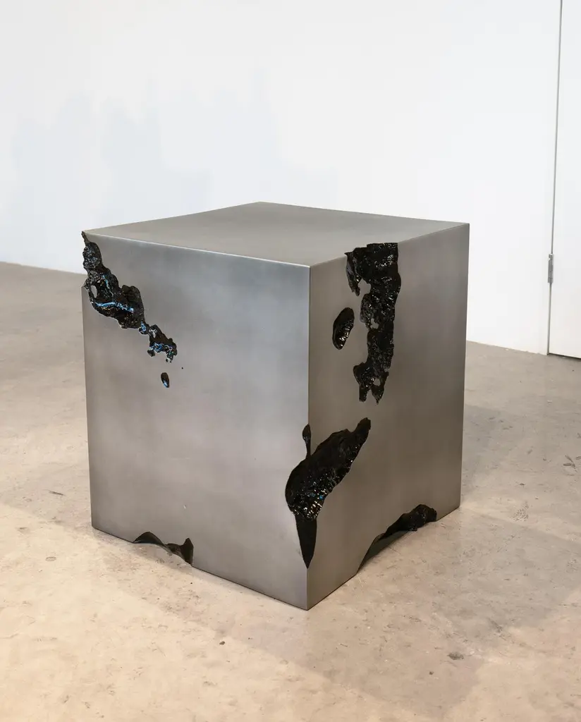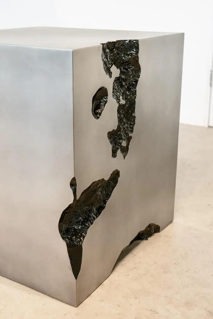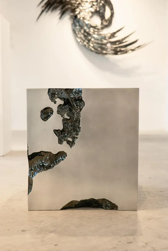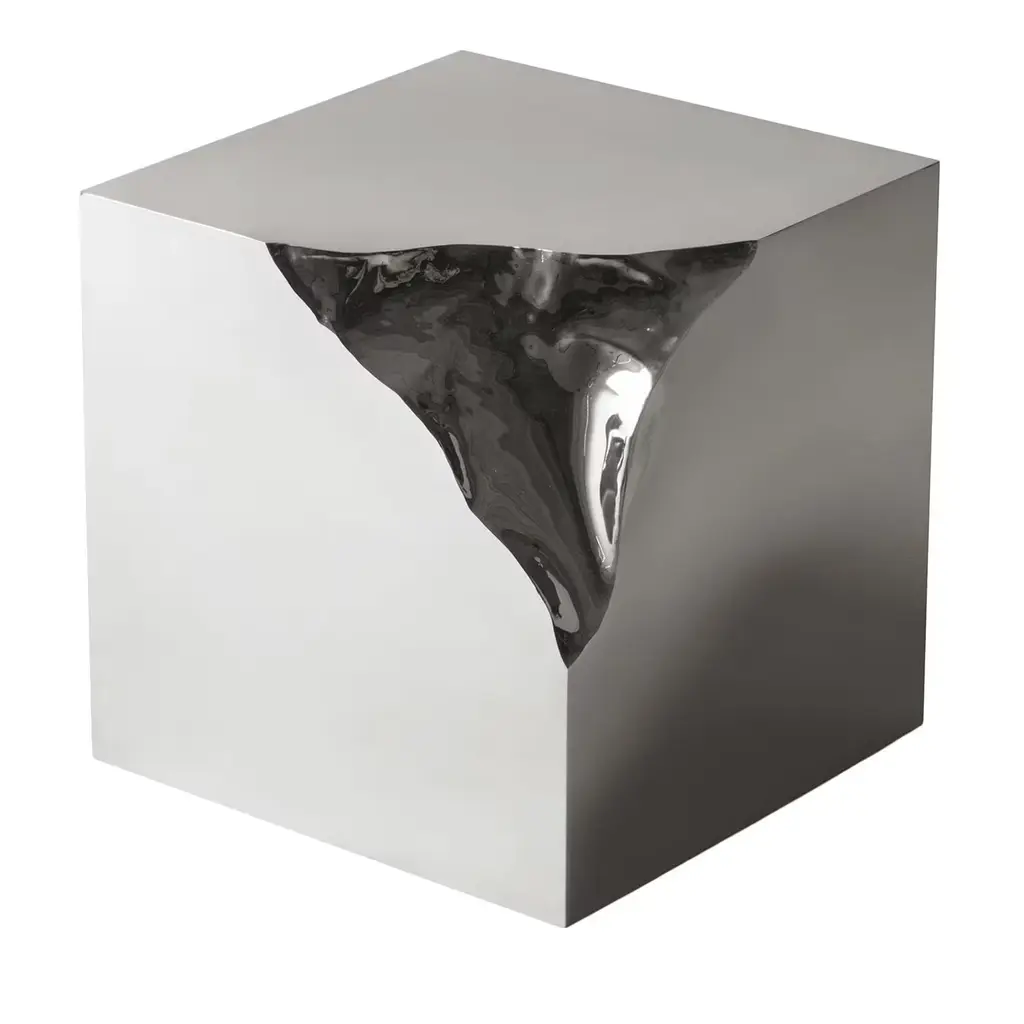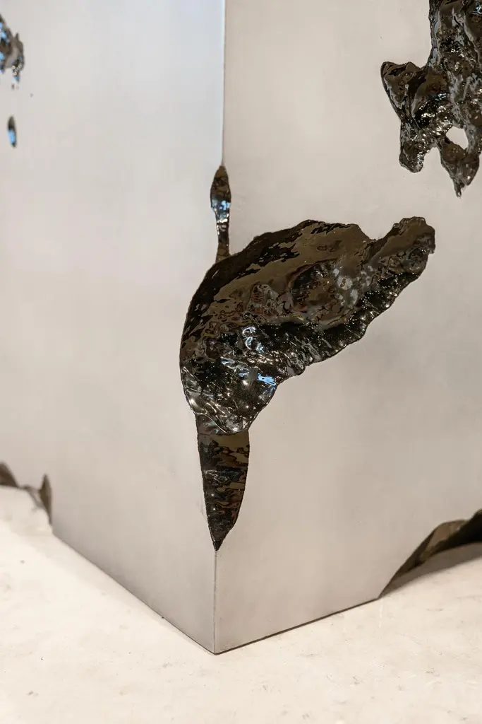A stark volume interrupted by time, the Erosia Side Table (Cube) explores the quiet drama of form undone. Its crisp, minimal geometry gives way to voids that feel neither accidental nor decorative, but elemental—openings shaped by imagined forces over an unspecified age. These cavities are not imposed; they are revealed, the result of a conceptual erosion rather than rupture.Clad in Katz Studio’s signature Velvet Chrome finish, this version elevates the form to a luminous, sculptural object. The soft metallic sheen shifts with the light, veiling the piece in a subtle radiance that contrasts sharply with the deep black gloss of its fissures. It is a play of absence and light, silence and reflection—an object both ancient and futuristic, as though excavated from some mythic archive of design.Made from hand-layered epoxy resin and fiberglass, each piece undergoes an intensive process of sanding, priming, lacquering, and polishing. The Velvet Chrome finish—developed in-house—requires multiple coats and curing stages to achieve its velvety depth, while the fissures are finished separately in high-gloss black for contrast. This is the most refined, labor-intensive expression of the Erosia series—one that transforms erosion into pure visual poetry.