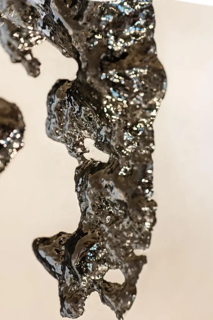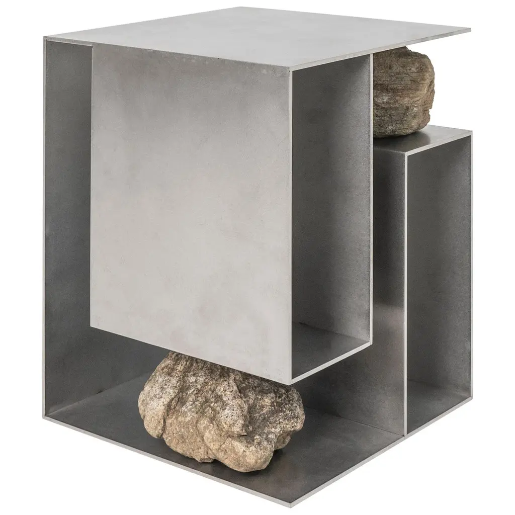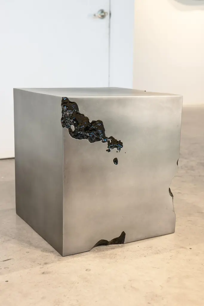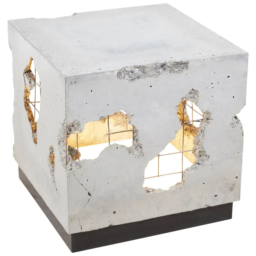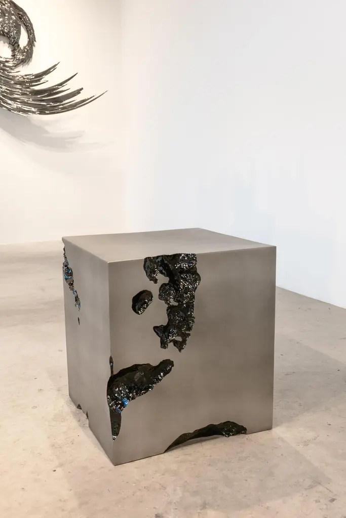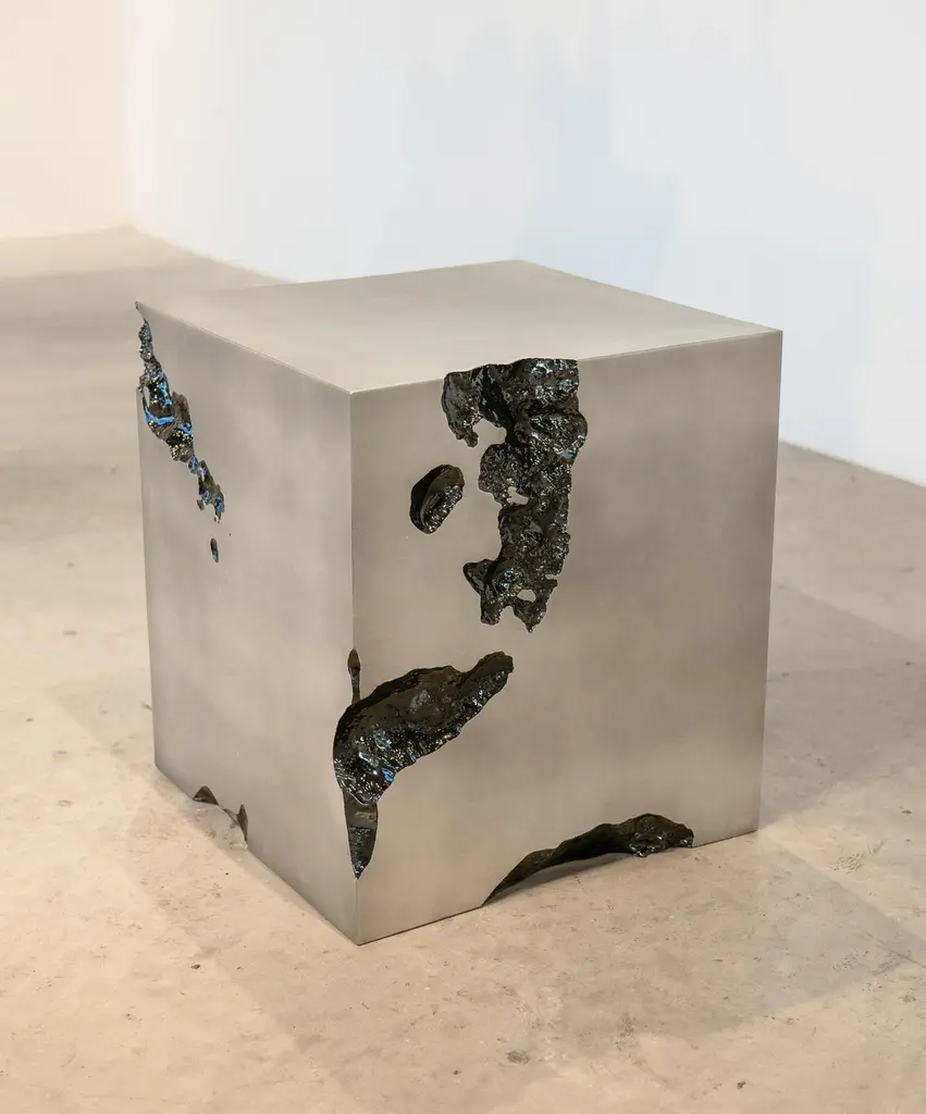 A stark volume interrupted by time, the Erosia Side Table (Cube) explores the quiet drama of form undone. Its crisp, minimal geometry gives way to voids that feel neither accidental nor decorative, but elemental—openings shaped by imagined forces over an unspecified age. These cavities are not imposed; they are revealed, the result of a conceptual erosion rather than rupture.Clad in Katz Studio’s signature Velvet Chrome finish, this version elevates the form to a luminous, sculptural object. The soft metallic sheen shifts with the light, veiling the piece in a subtle radiance that contrasts sharply with the deep black gloss of its fissures. It is a play of absence and light, silence and reflection—an object both ancient and futuristic, as though excavated from some mythic archive of design.Made from hand-layered epoxy resin and fiberglass, each piece undergoes an intensive process of sanding, priming, lacquering, and polishing. The Velvet Chrome finish—developed in-house—requires multiple coats and curing stages to achieve its velvety depth, while the fissures are finished separately in high-gloss black for contrast. This is the most refined, labor-intensive expression of the Erosia series—one that transforms erosion into pure visual poetry.
