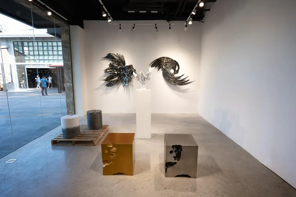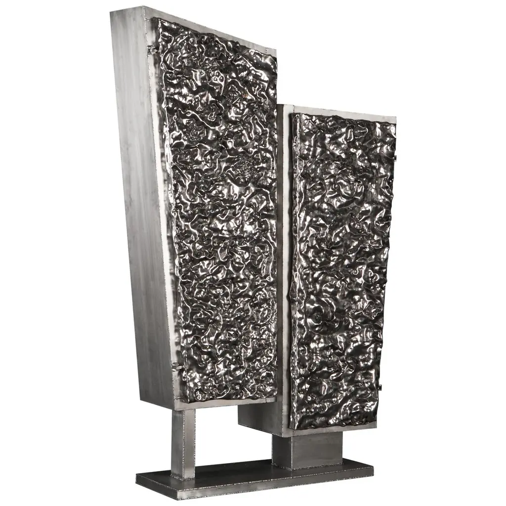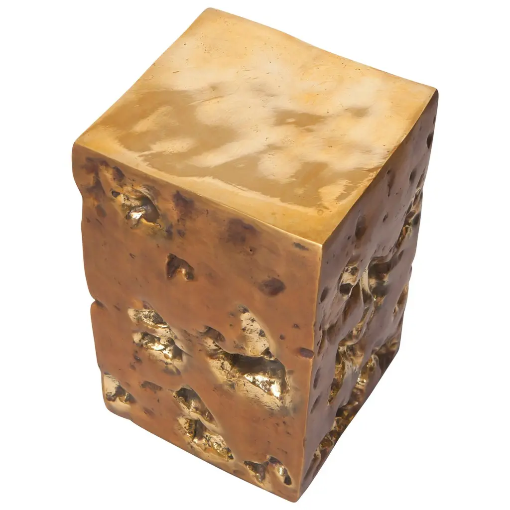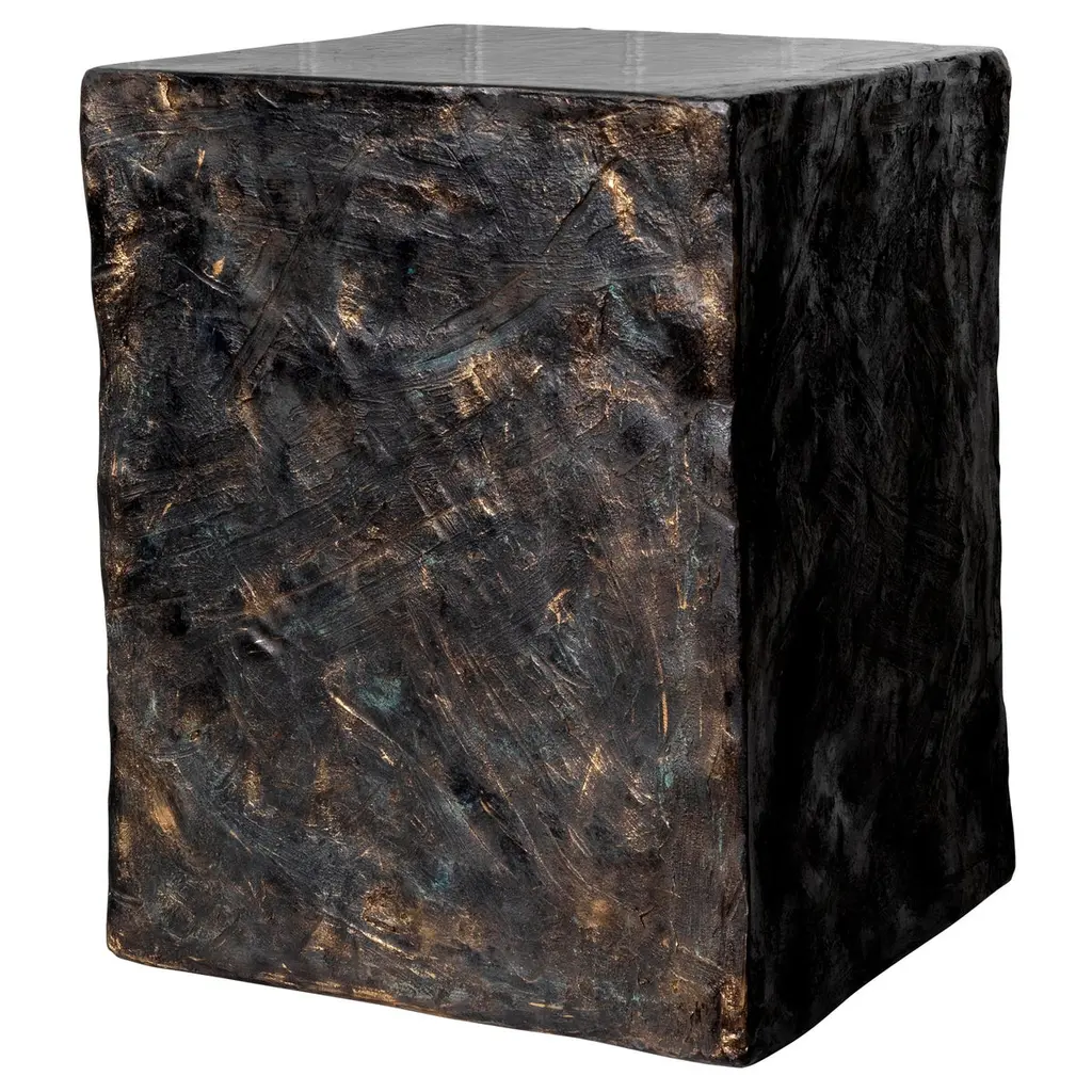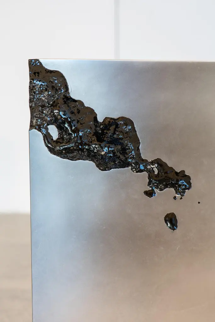 A stark volume interrupted by time, the Erosia Side Table (Cube) explores the quiet drama of form undone. Its crisp, minimal geometry gives way to voids that feel neither accidental nor decorative, but elemental—openings shaped by imagined forces over an unspecified age. These cavities are not imposed; they are revealed, the result of a conceptual erosion rather than rupture.Clad in Katz Studio’s signature Velvet Chrome finish, this version elevates the form to a luminous, sculptural object. The soft metallic sheen shifts with the light, veiling the piece in a subtle radiance that contrasts sharply with the deep black gloss of its fissures. It is a play of absence and light, silence and reflection—an object both ancient and futuristic, as though excavated from some mythic archive of design.Made from hand-layered epoxy resin and fiberglass, each piece undergoes an intensive process of sanding, priming, lacquering, and polishing. The Velvet Chrome finish—developed in-house—requires multiple coats and curing stages to achieve its velvety depth, while the fissures are finished separately in high-gloss black for contrast. This is the most refined, labor-intensive expression of the Erosia series—one that transforms erosion into pure visual poetry.