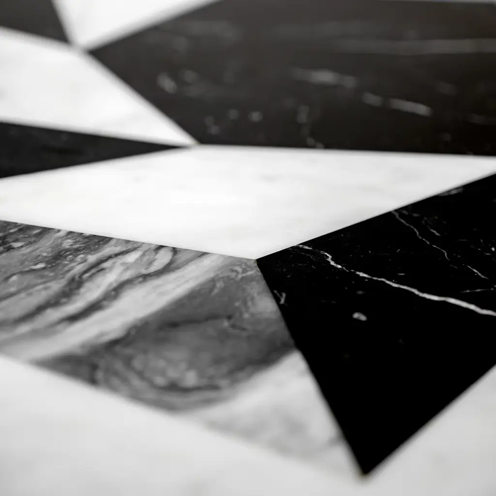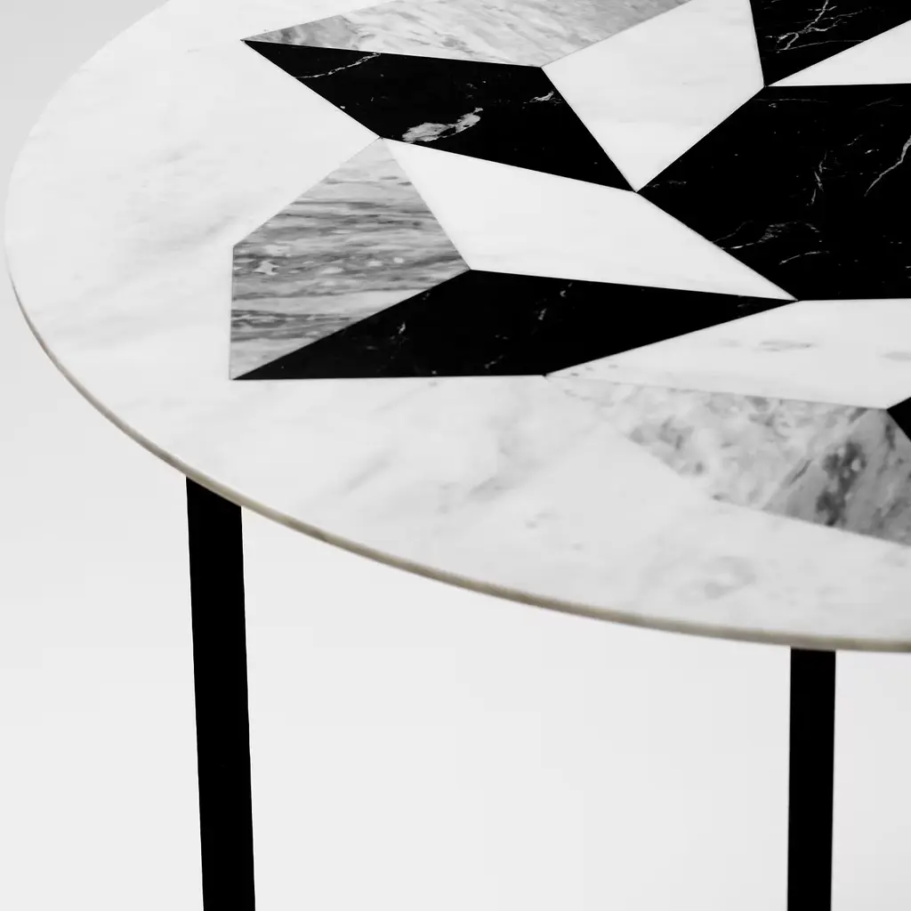 Part of a refined Collection named after Greek fabulist Aesop, this precious design by Antonio Saporito is an elegant side table that will effortlessly adorn any contemporary or classic interior alike. The distinctive feature of this piece is the striking marble top, showcasing a geometric wheel decoration that combines different forms in white, gray, and black hues. The top rests on a sturdy yet captivating iron base. Please ask the Concierge for further details.