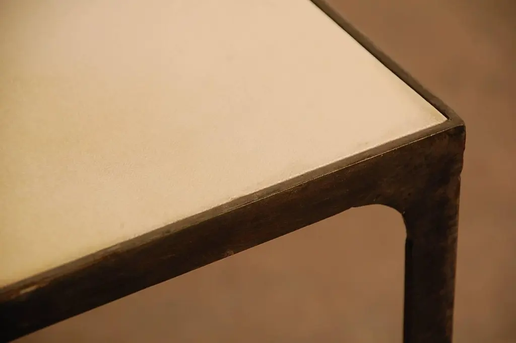 'Esquisse' parchment and blackened wrought iron side tables by DESIGN FRÈRES.The smooth, natural cream parchment top is matched with an elegant contrasting blackened wrought iron base to create this sophisticated, yet simple design.Chic and understated.