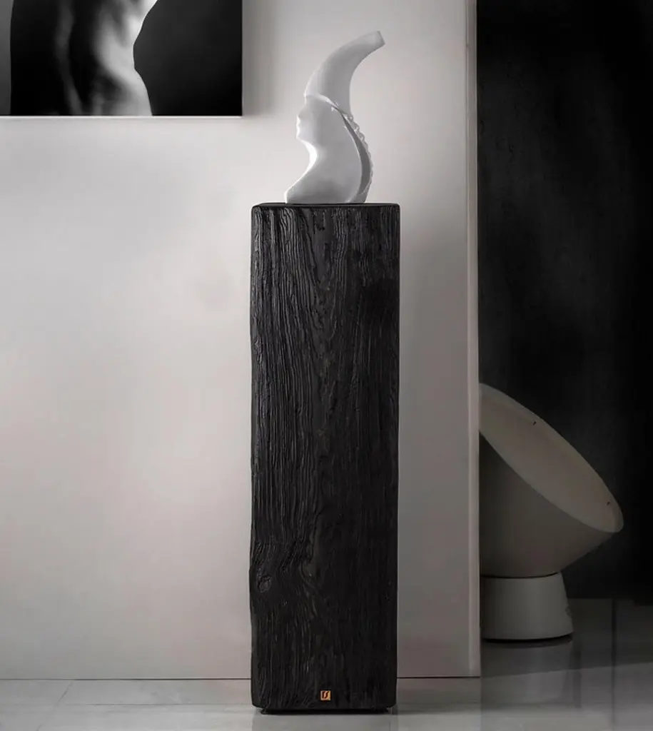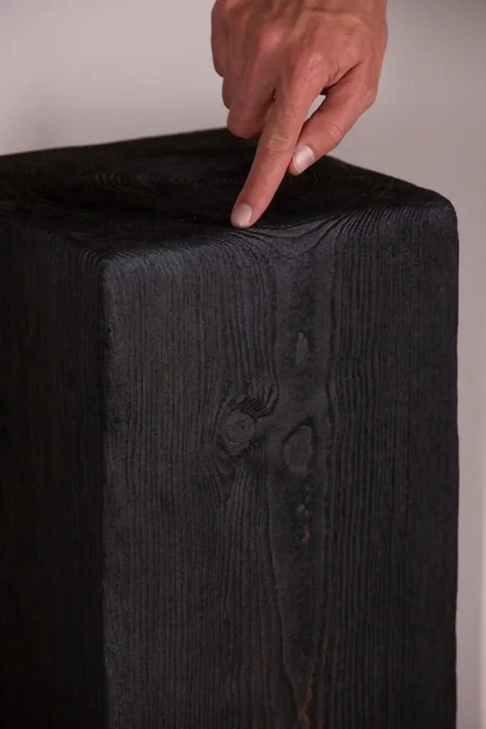 Essence L by Rectangle StudioDimensions: 25x25x90 cmMaterials: Solid Pine, Natural Black Wood oil Kabuk is an alternative product with sculptural appearance which can be used as a coffee table and a bedside table with its modern structure.Kabuk is shaped and crafted by its designer. Because it has a sculptural appearance and crafted by hand, every product may vary with small details. The table or bedside is suitable for use as a bedside table. Because of the use of natural massive materials in products, the color tones and grains may vary.wipe with damp cloth.Rectangle Studio is a collective Design Brand created by Interior Architect and Designer Tarik KORKMAZ and Photographer Derya ATICI.Sculptural Furniture has a collective structure with its Interior Design, Professional Photography and Video works,Rectangle Studio is a design studio that works on different disciplines and materials and produces.While Rectangle Studio shapes its works in its own hands, it produces its works in cooperation with international and senior, industrial or artisanal partners.In interior design works; prioritizes the sense of sensitivity, dedication and excellence.In the photo works; In the relationships he established with his partners; is to produce works that are respected in the art of photography with an honest, creative and humanistic perspective.