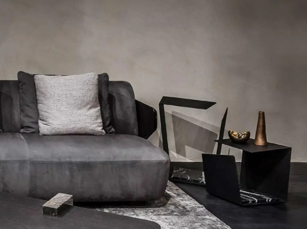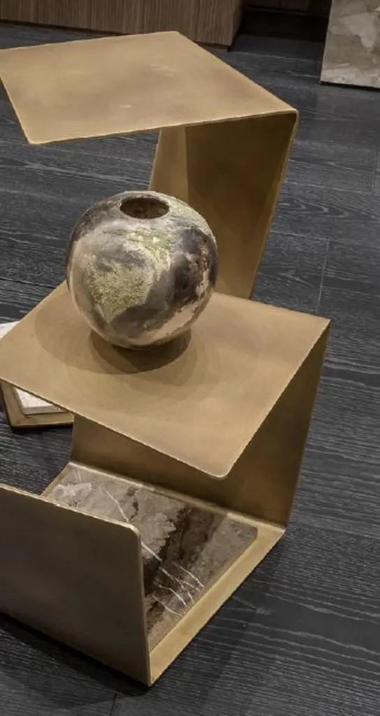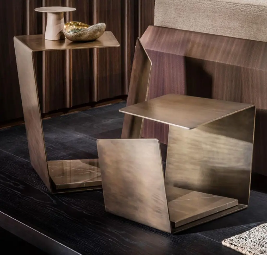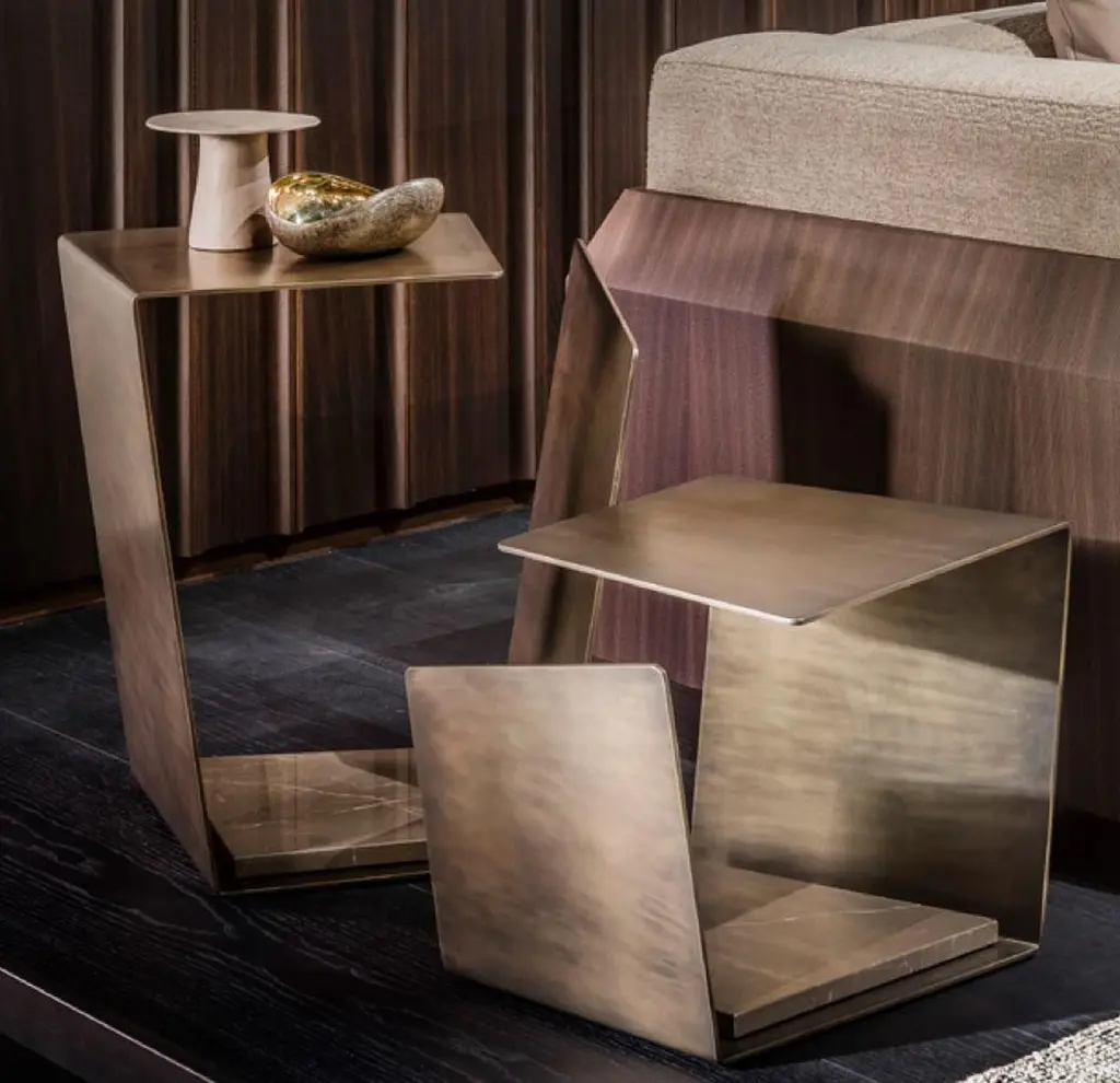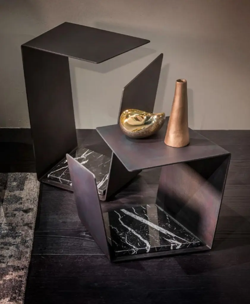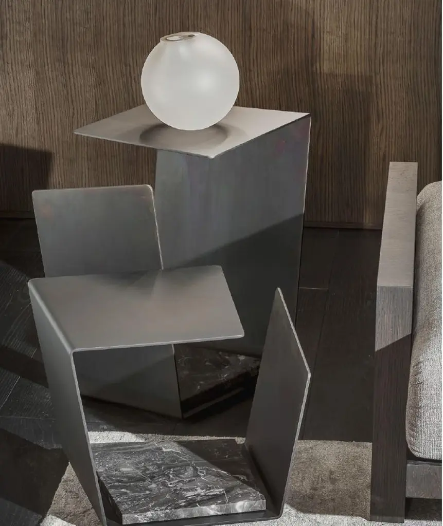 ESSENTIAL by Adele MartelliA sculptural side table defined by minimalism and refined elegance.English Description:Design Concept: ESSENTIAL is a small table whose striking simplicity surprises the viewer. Despite its austere form, it holds a rich sculptural volume that is neither flashy nor trivial.Structure: Crafted from a single bent sheet of brass or lacquered metal, it embodies purity of form.Base: The marble base acts like a precious stone set into a ring, creating a luxurious contrast reminiscent of fine jewelry.Materials:Metal: Black-varnished or brass.Marble options: Bronze Amani, Arabescato Orobico, or Travertino Ostuni.Size (with standard pricing):Only listed for size W52 cm x D36 cm x H56 cm in black-varnished metal.For other marble types or configurations, the feasibility and price must be confirmed with Emmemobili.