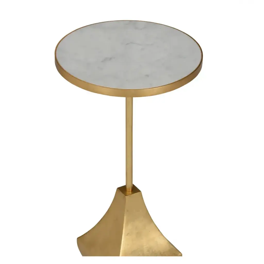 Essex Side Table, a statement piece that combines luxurious material with contemporary elegance. Topping the base is a luxurious white marble top, crafted marble with exquisite veining and natural variations. The marble top adds a touch of sophistication and opulence to the aged brass base table, creating a stunning focal point that elevates any room.