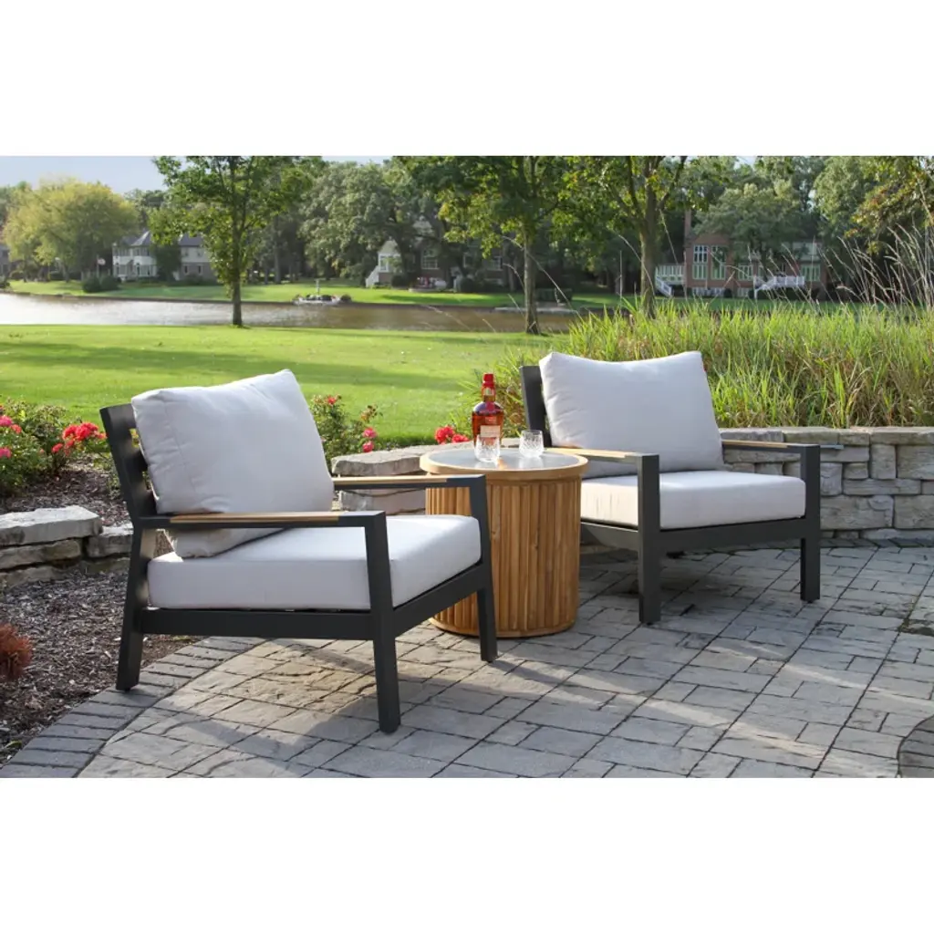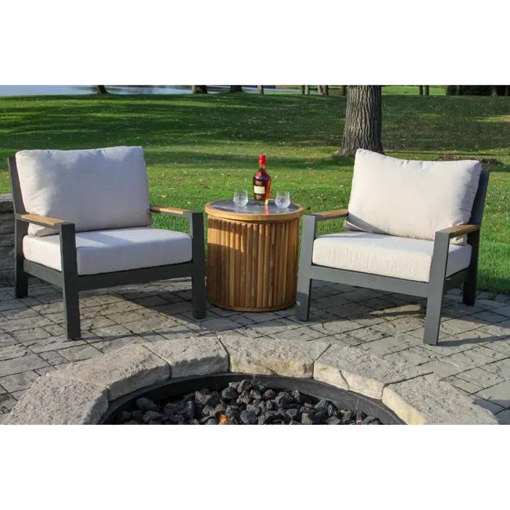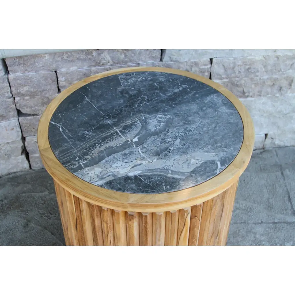 The Teak & Sintered Stone Accent Table uses the perfect blend of natural hardwood with the stunning appeal of manufactured sintered stone. Sintered Stone is known for its exceptional durability, heat, and UV resistance. Overall, sintered stone combines the aesthetic appeal of natural stone with modern technological enhancements, resulting in a versatile and long-lasting material especially suitable for outdoor furniture. The table's teak pedestal adds natural strength and weather resistance.