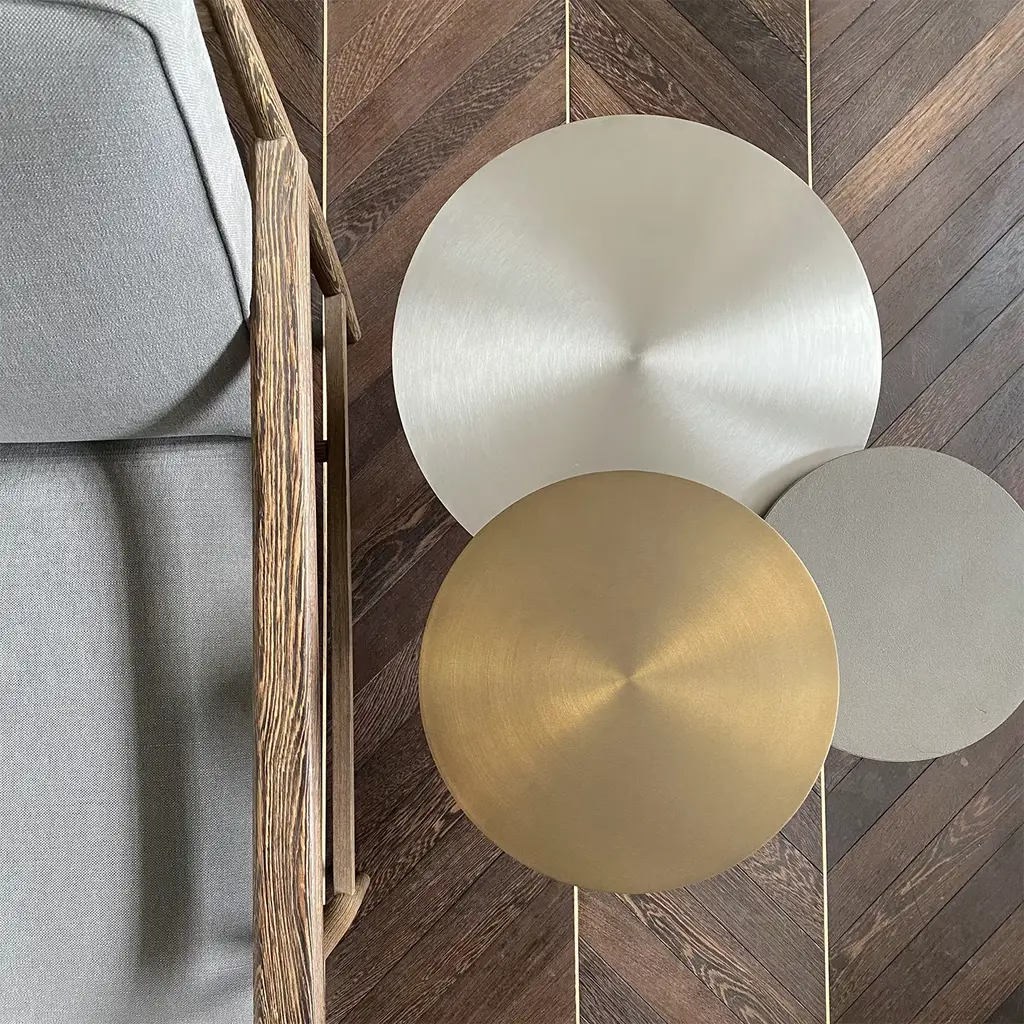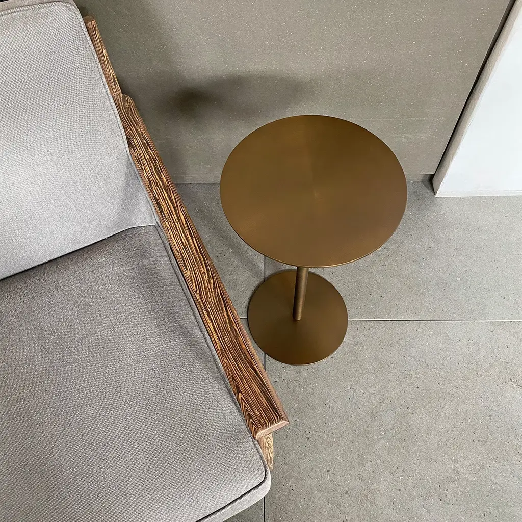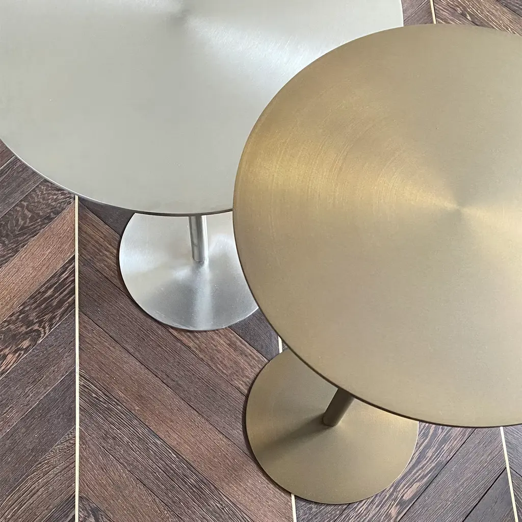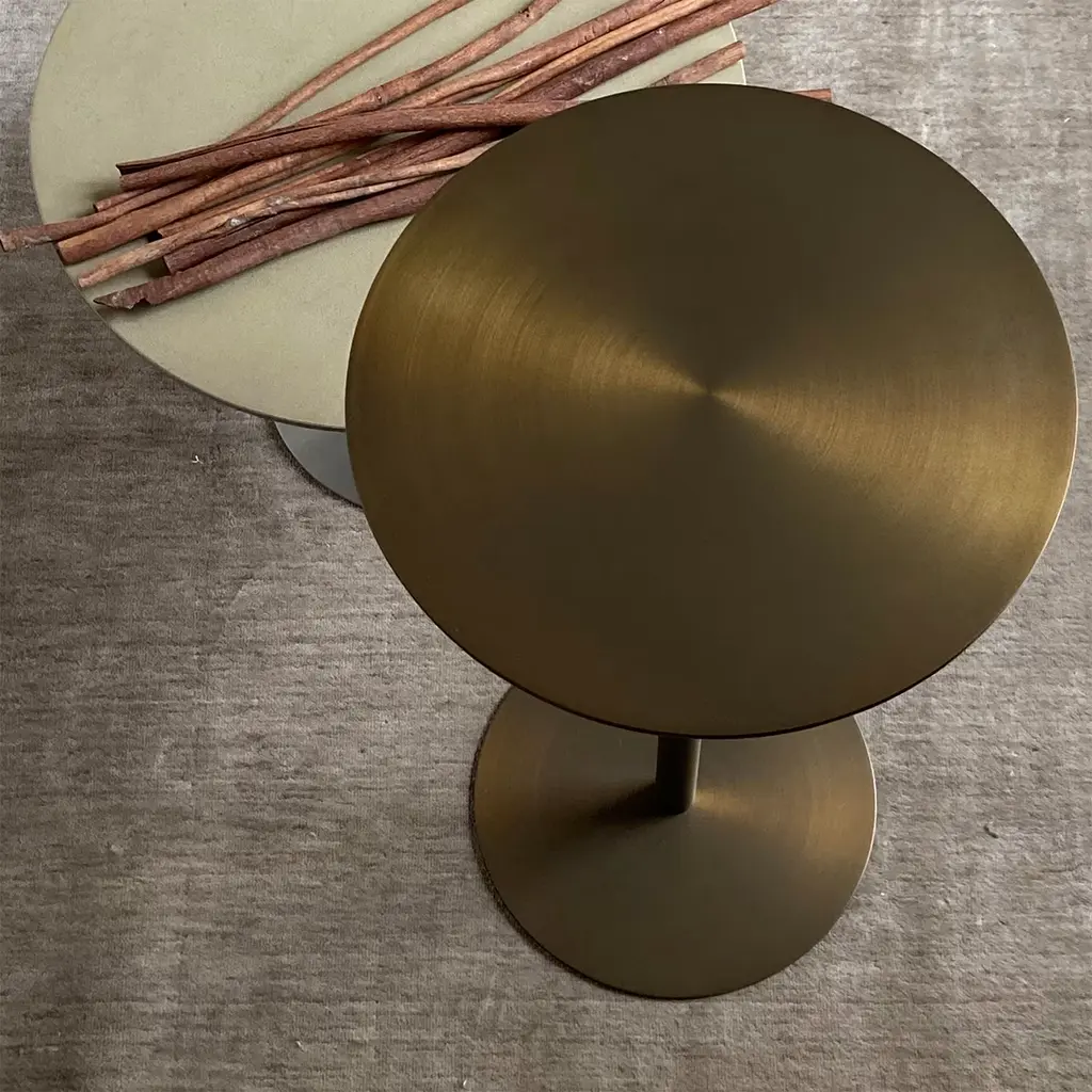 Add a touch of modern flair to living room or lounge decors with this minimalist side table. Designed to enhance any space with its clean lines and understated elegance, the sleek silhouette features a thin top and base with a support rod boasting a brushed bronzed finish. Customizable upon request, available sizes are: Ø25 H54, Ø25 H45, Ø30 H54, Ø30 H45, Ø40 H45, and Ø40 H30.
