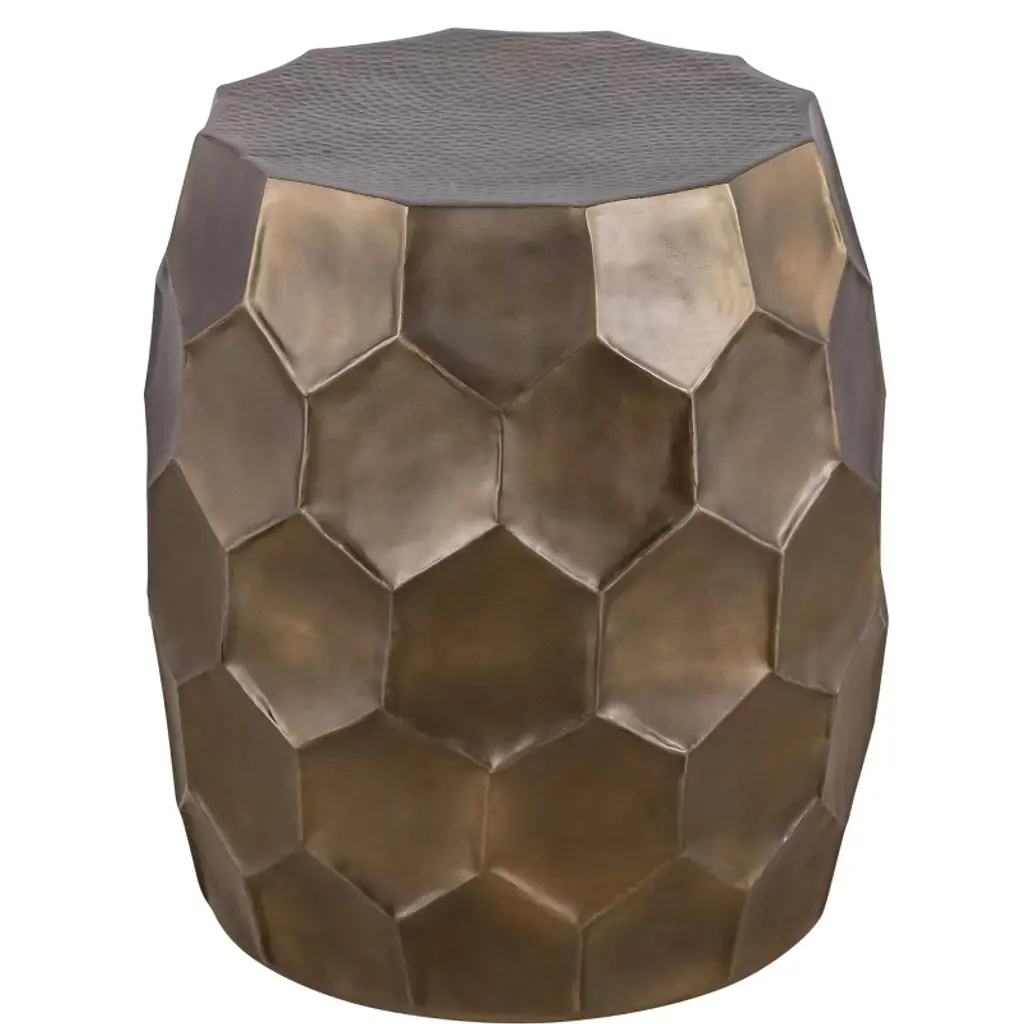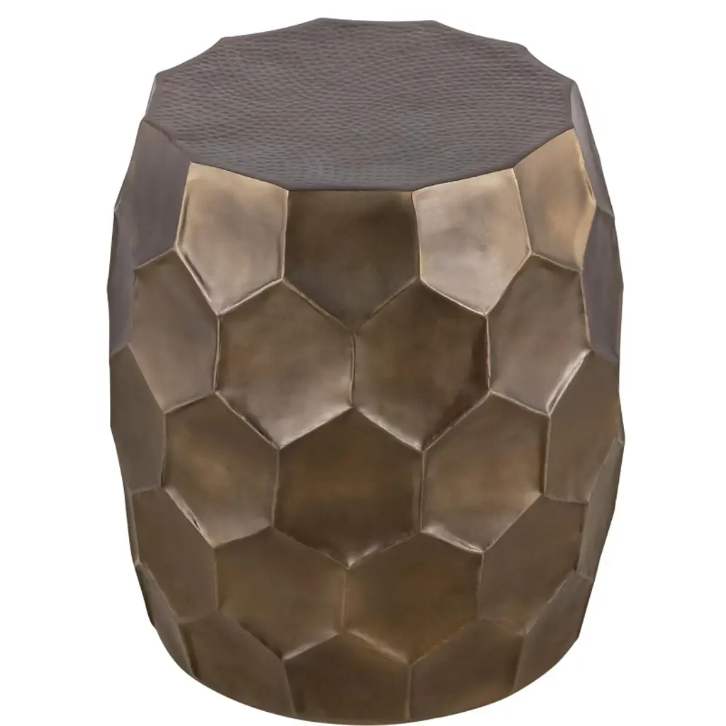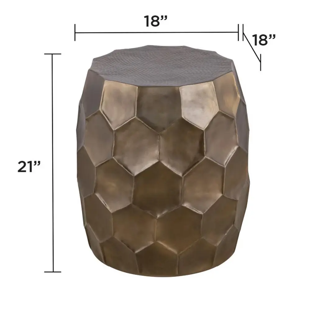 ET 101 Gold: This stylish end table combines a unique hand-hammered design with a choice of three elegant antique finishes¡ªantique copper, antique silver, or antique bronze. The hexagonal pattern and rounded shape add a touch of sophistication, making it a perfect accent piece for various interior styles. Crafted to blend seamlessly with modern, rustic, or industrial decor, this end table provides both functionality and artistic appeal. End Table Dimensions- 18inW * 18in L * 21inH