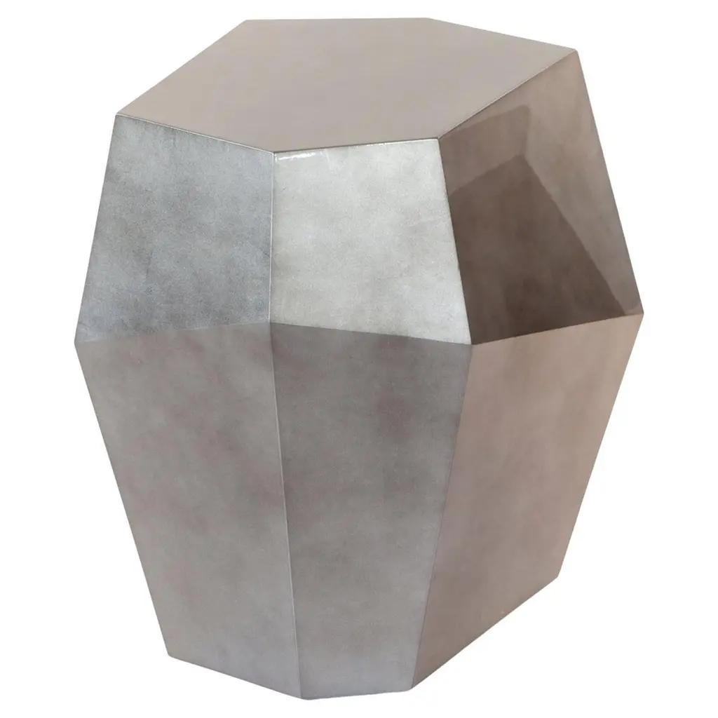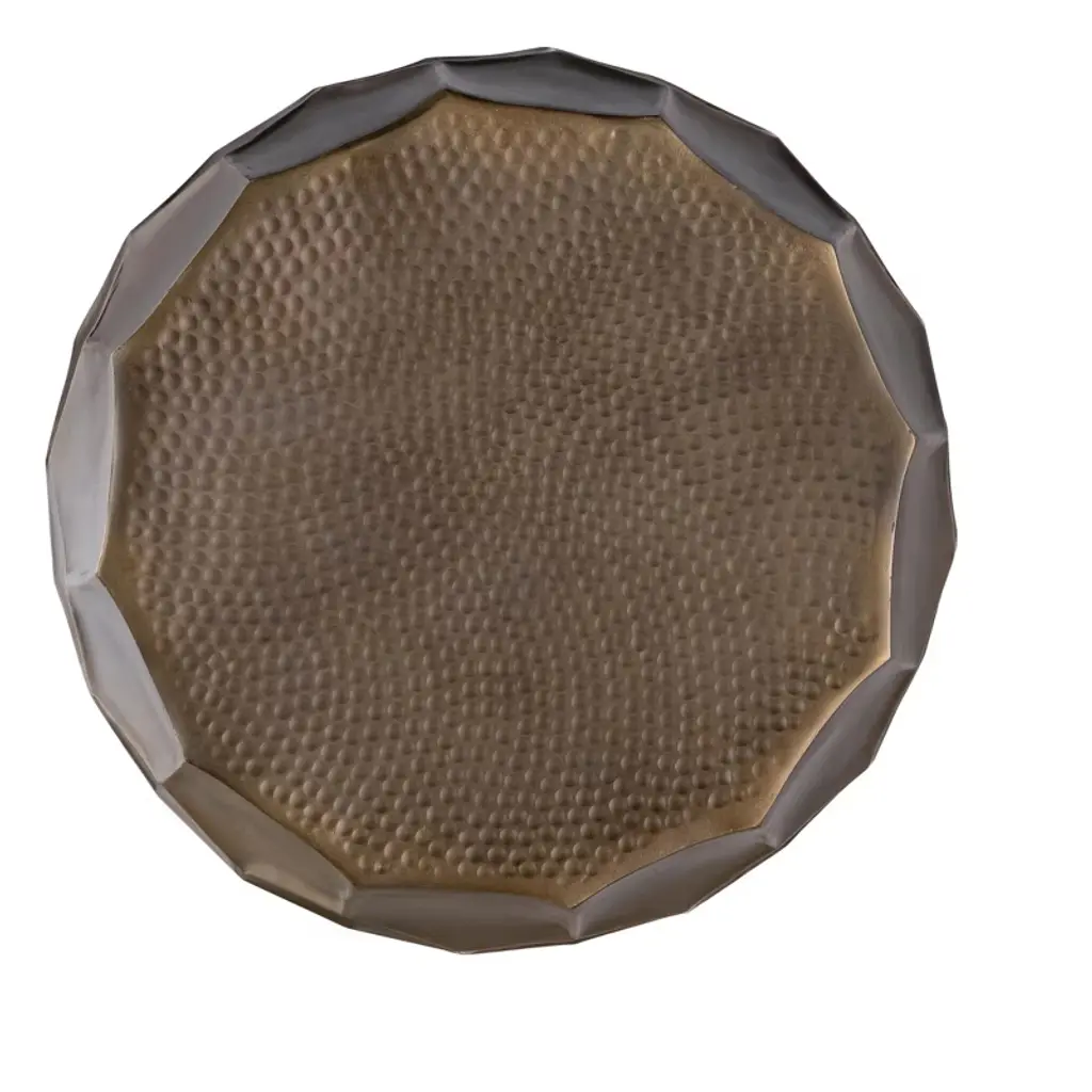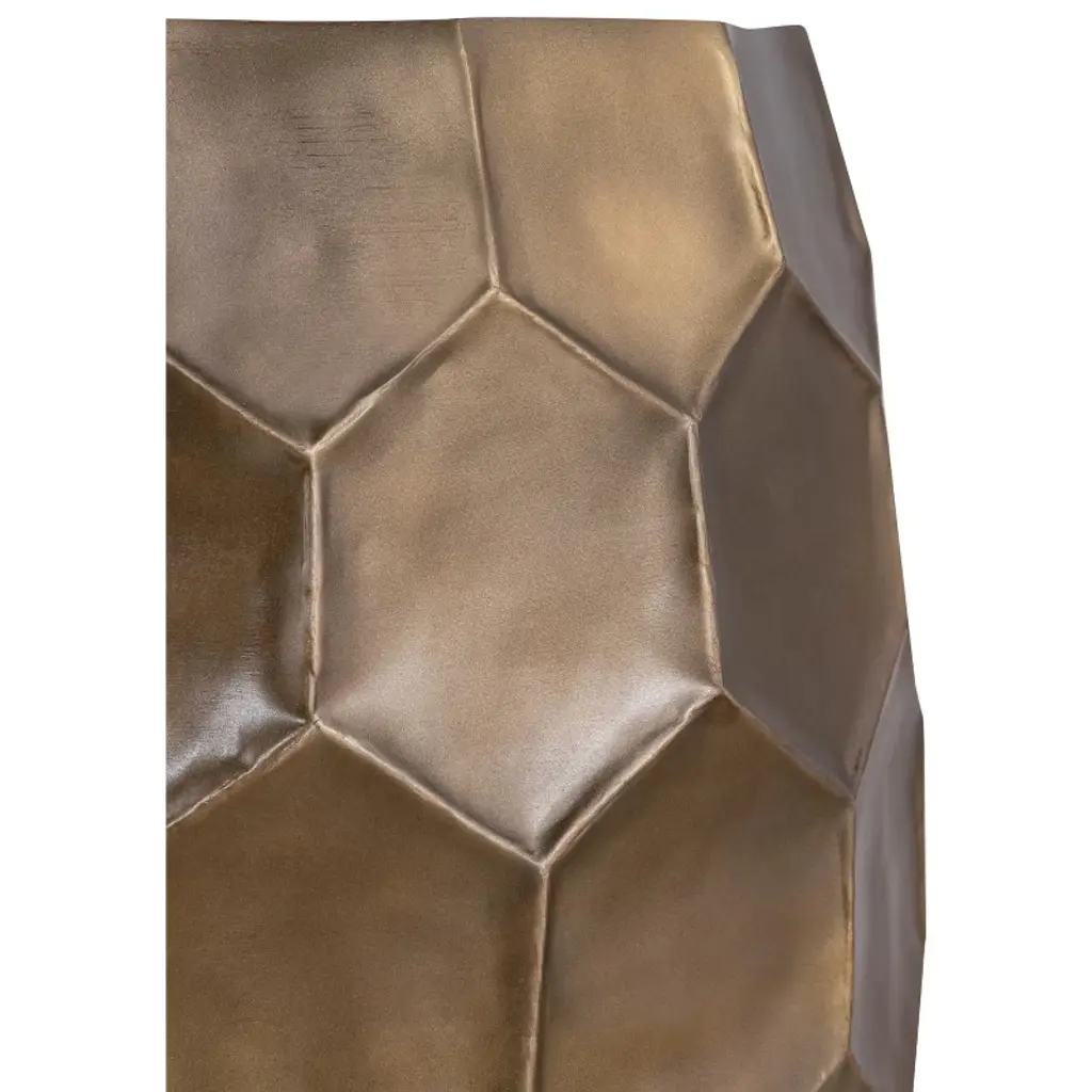 ET 101 Gold: This stylish end table combines a unique hand-hammered design with a choice of three elegant antique finishes¡ªantique copper, antique silver, or antique bronze. The hexagonal pattern and rounded shape add a touch of sophistication, making it a perfect accent piece for various interior styles. Crafted to blend seamlessly with modern, rustic, or industrial decor, this end table provides both functionality and artistic appeal. End Table Dimensions- 18inW * 18in L * 21inH