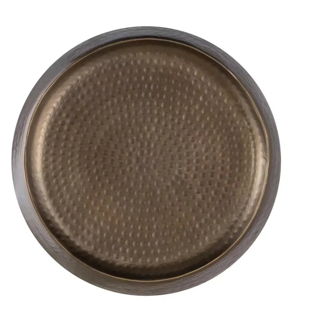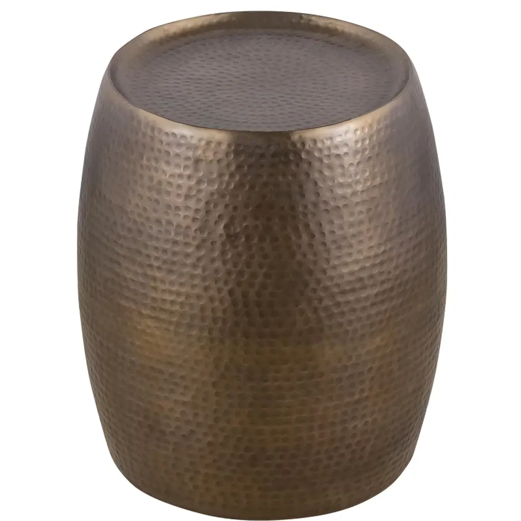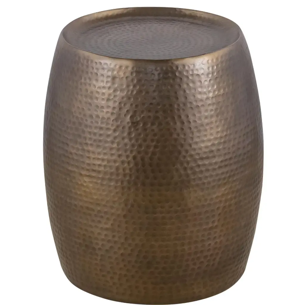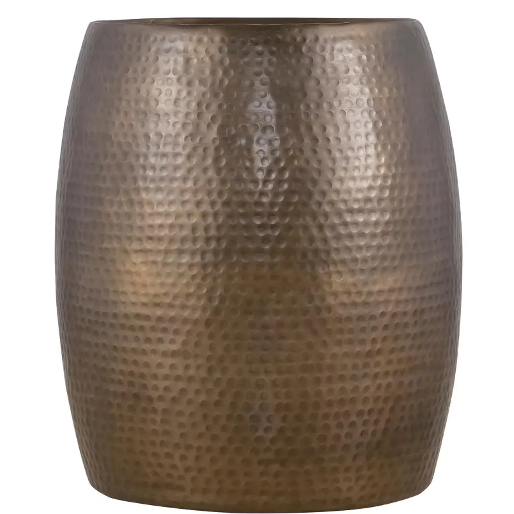 Color: Antique Gold. With its durable construction and no assembly required, this end table is a hassle-free way to bring a luxurious touch to your home. ET501 End Table: The ET 501 hand-hammered end table is a stunning blend of craftsmanship and functionality. Featuring a beautifully textured surface and a refined drum shape, this compact yet sturdy piece adds a touch of elegance to any space. Available in antique copper, antique silver, and antique gold, its rich finishes enhance its artisanal appeal. Perfect as a stylish side table, nightstand, or accent piece, it effortlessly complements both modern and traditional interiors. Dimensions: 18inW* 18inL *21inH