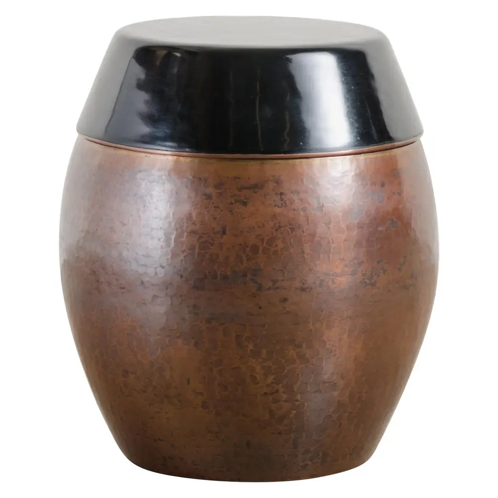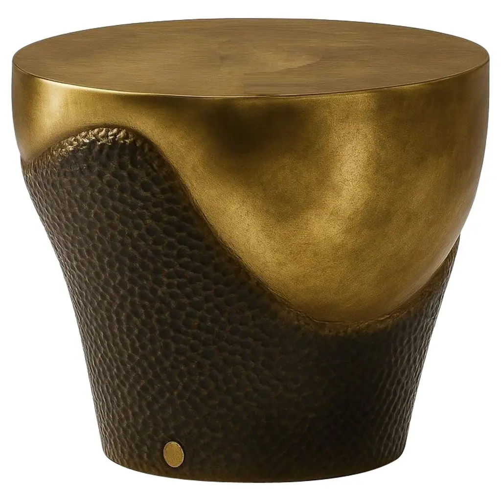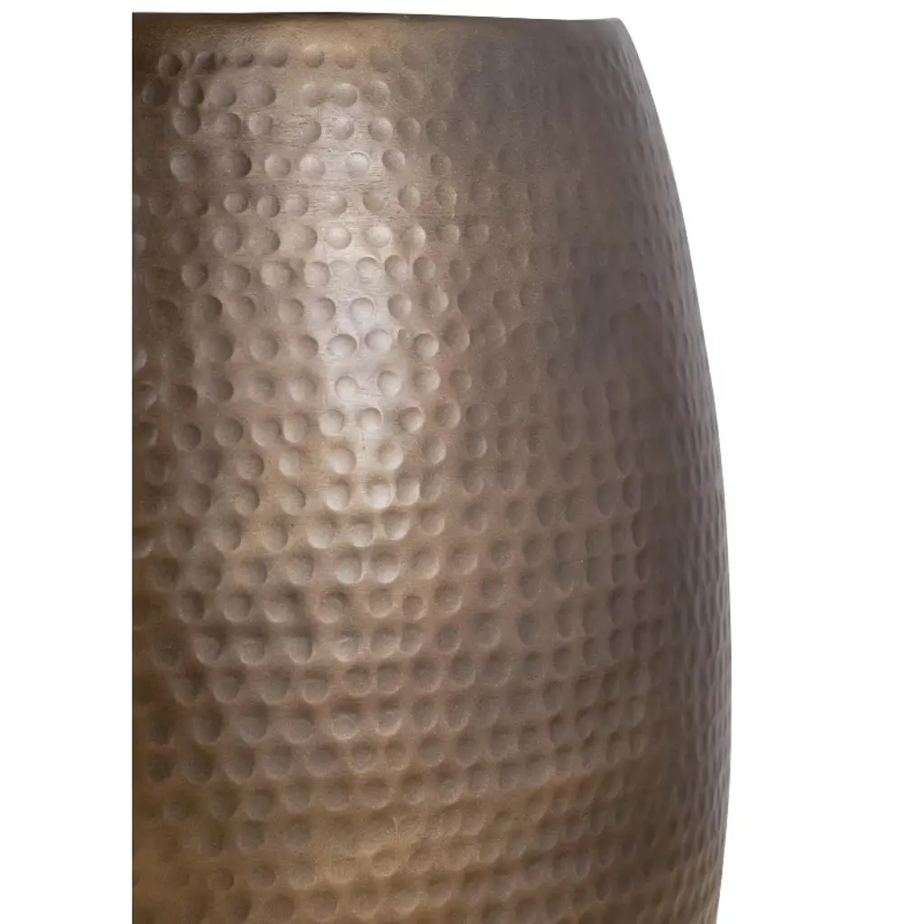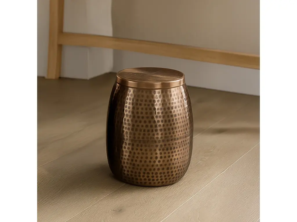 Color: Antique Gold. With its durable construction and no assembly required, this end table is a hassle-free way to bring a luxurious touch to your home. ET501 End Table: The ET 501 hand-hammered end table is a stunning blend of craftsmanship and functionality. Featuring a beautifully textured surface and a refined drum shape, this compact yet sturdy piece adds a touch of elegance to any space. Available in antique copper, antique silver, and antique gold, its rich finishes enhance its artisanal appeal. Perfect as a stylish side table, nightstand, or accent piece, it effortlessly complements both modern and traditional interiors. Dimensions: 18inW* 18inL *21inH