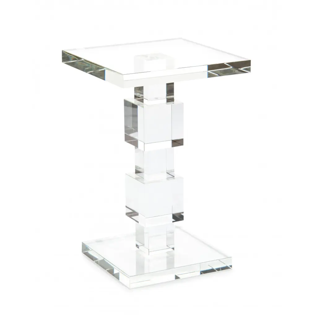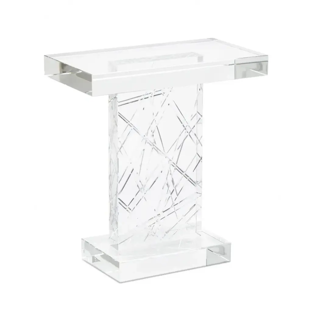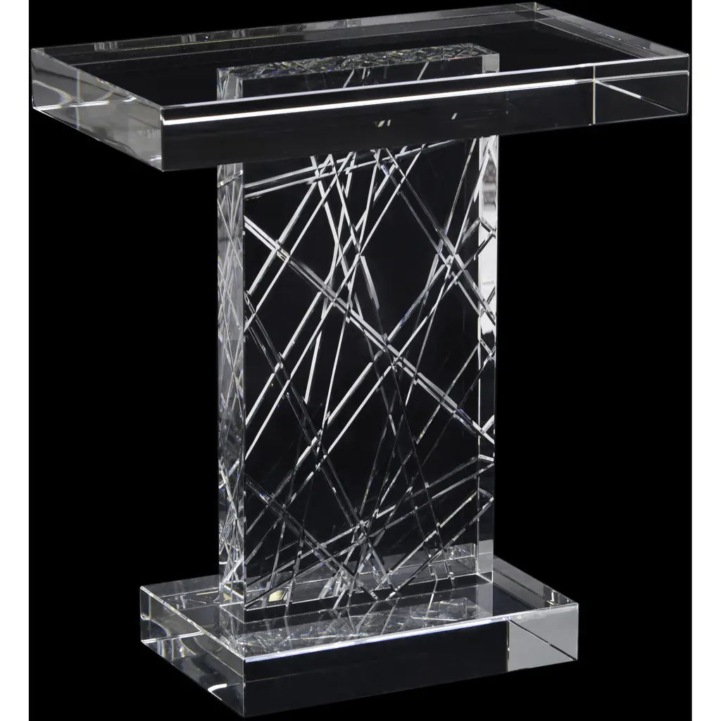 This solid crystal accent table features an etched geometric design.