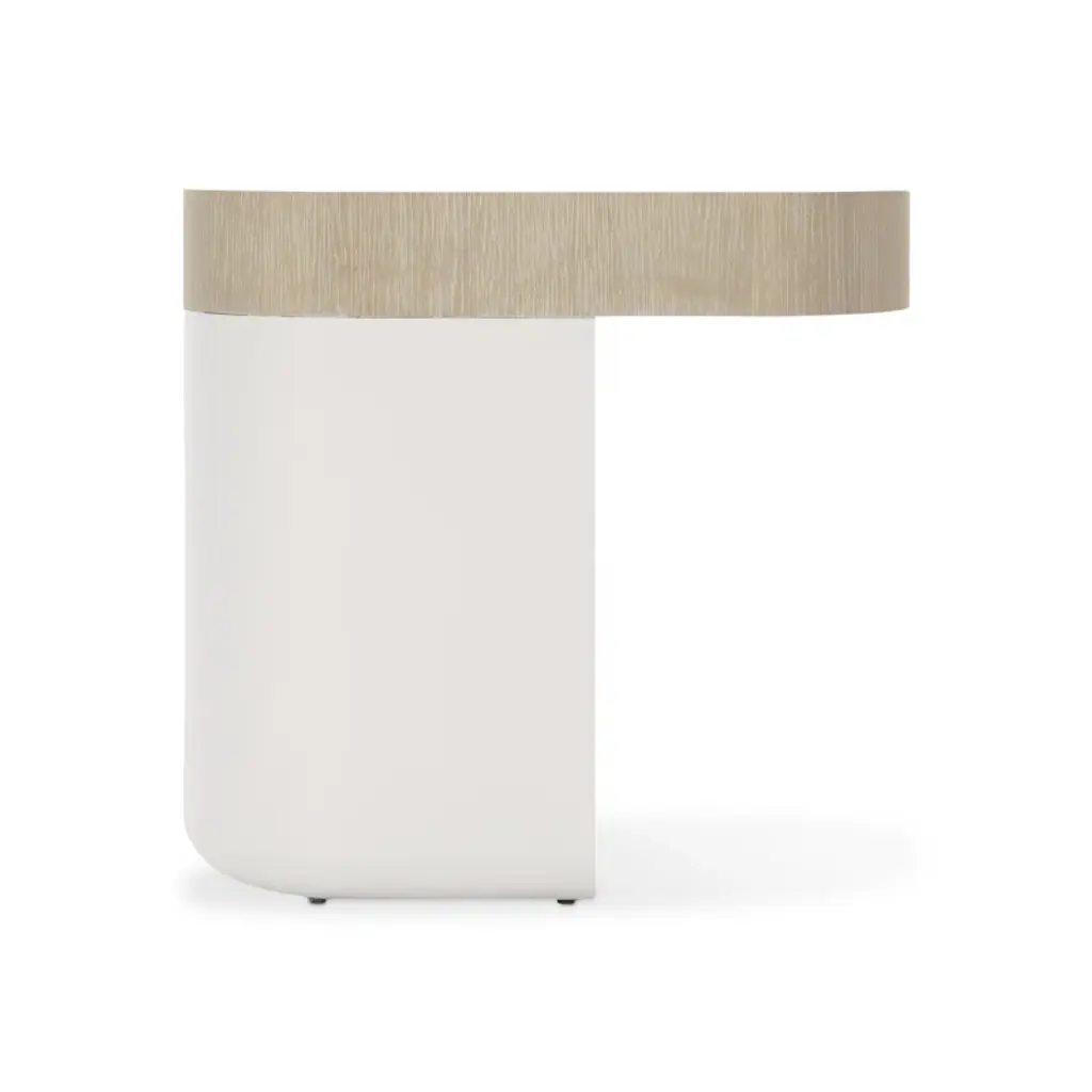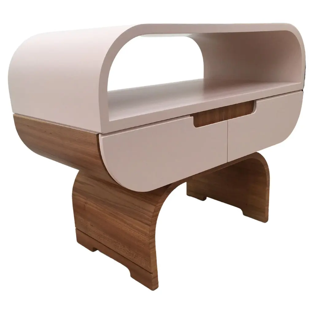 This stunning side table is an exercise in modernist sophistication. Its structure is entirely crafted of Canaletto walnut with a matte finish. It comprises a central cylindrical base on which the top curves, extending to the floor. These exquisite details are highlighted with a light gray matte color for a striking effect.