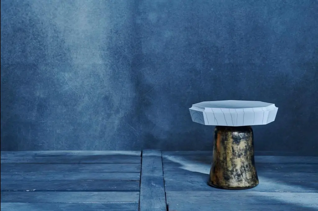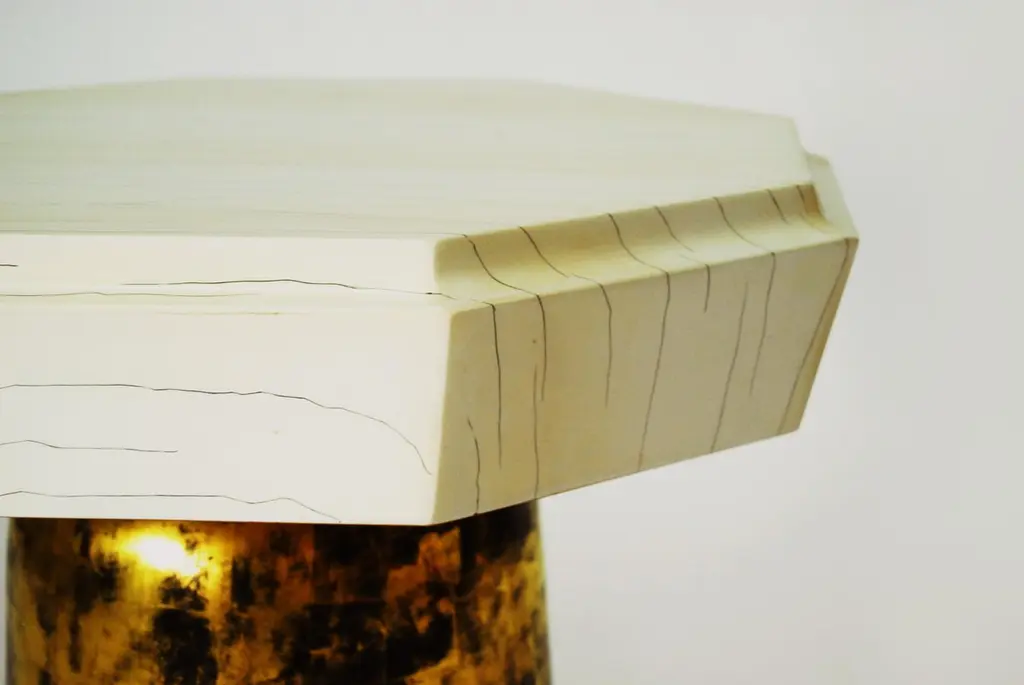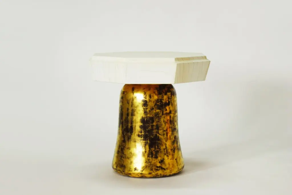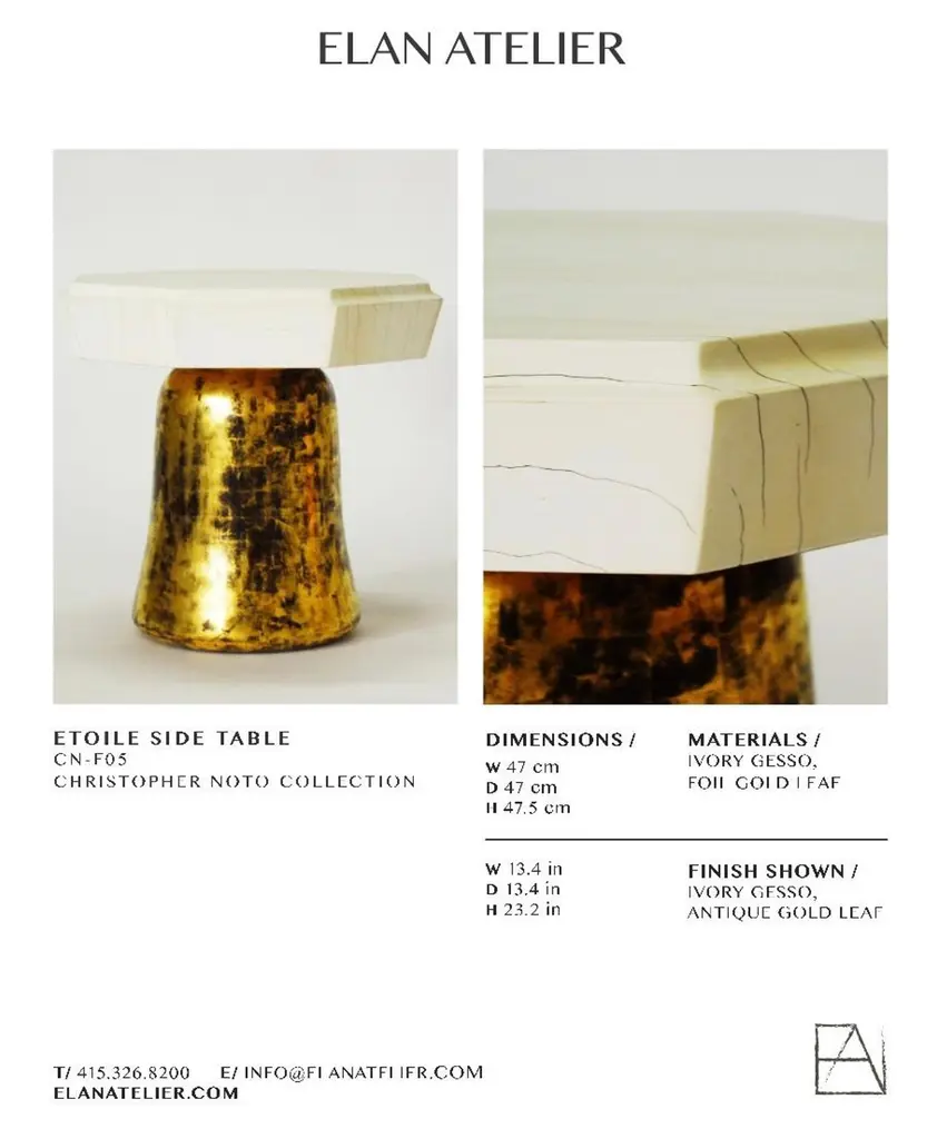Etoile Side Table in Gesso and Gilt Lacquer by Elan AtelierThe Etoile side table is formed by an elegant sloping base in silver or gold leaf on lacquer, topped by an elegantly faceted and tapered octagonal top in either gesso or parchment. Custom sizes and finishes are available. Shown here in gold leaf and gesso.Dimensions/w 13.4 x d 13.4 x h 23.2 inw 47 x d 47 x h 47.5 cm