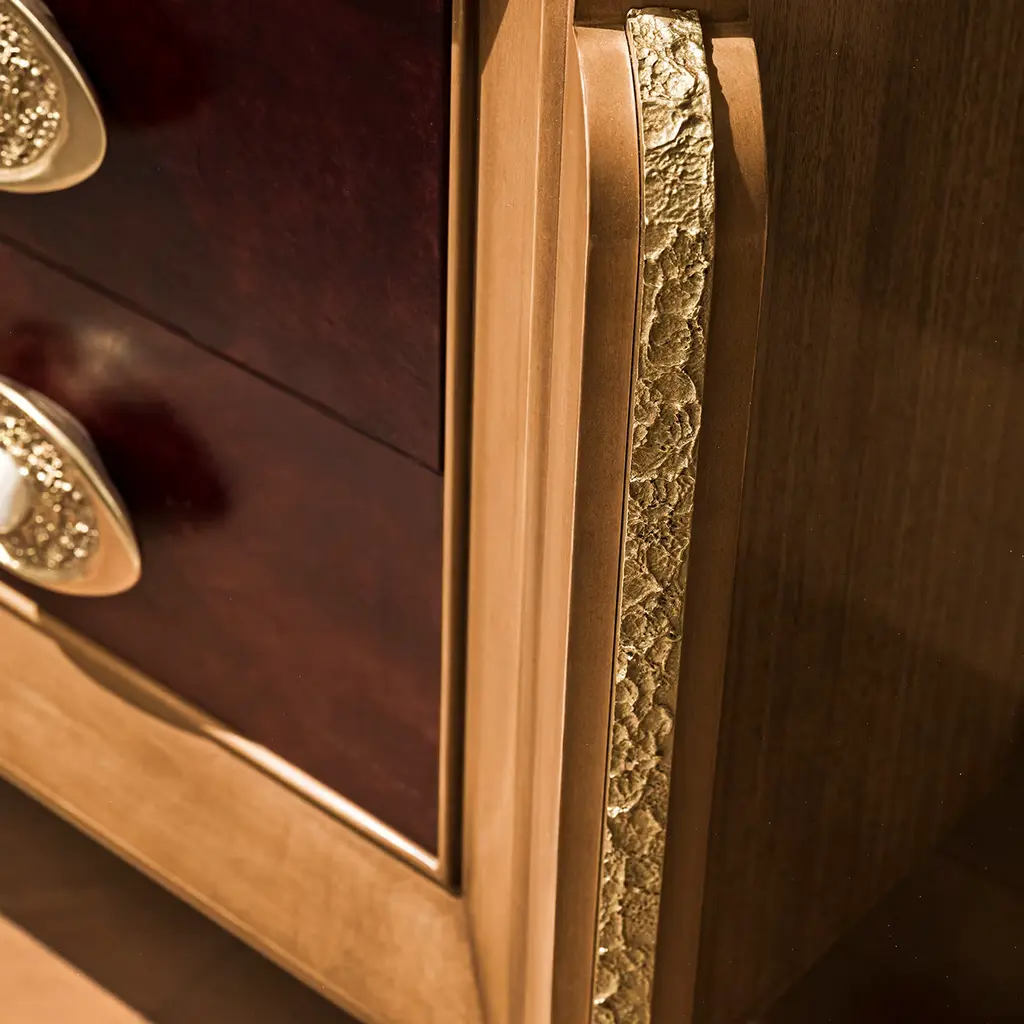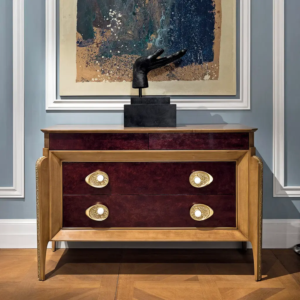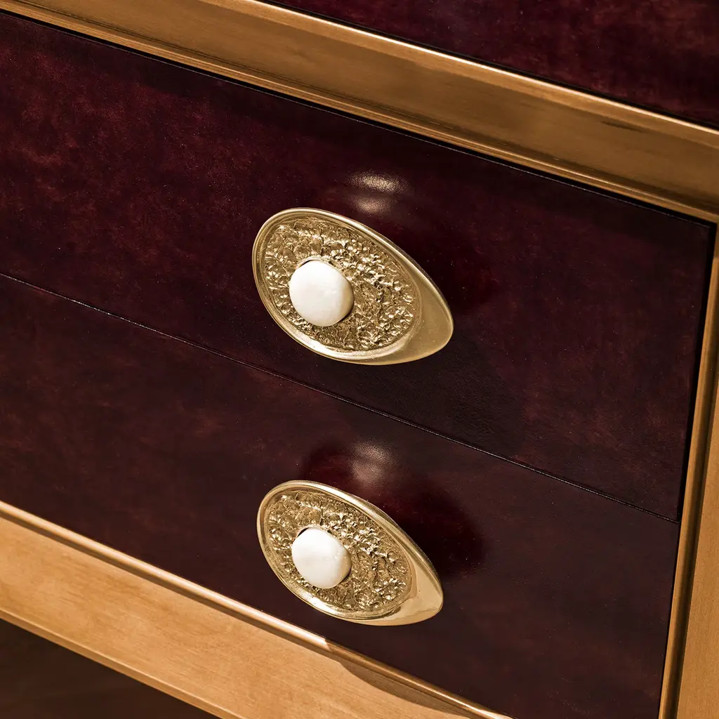 A sublime showcase of craftsmanship, this magnificent dresser is handmade of eucalyptus wood, enriched with parchment leather-upholstered details. Brass and mother-of-pearl handles adorn its two frontal drawers. A stately and iconic accent piece for a refined living room, it is ideally combined with the Eucalyptus bedside table for a cohesive ensemble.