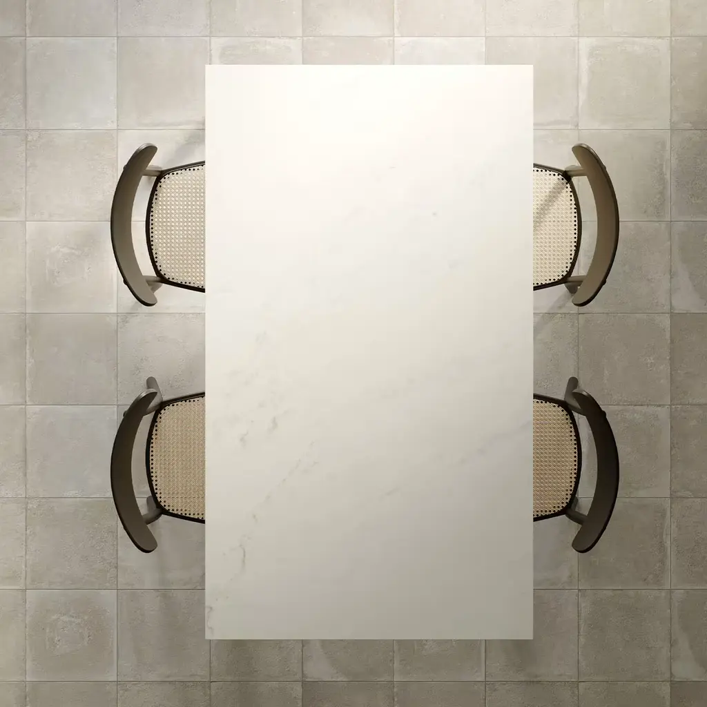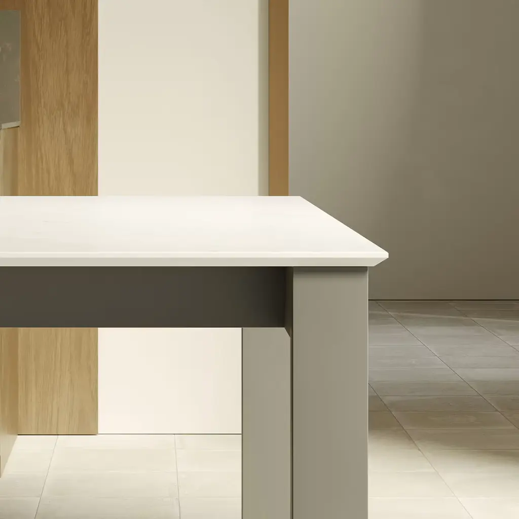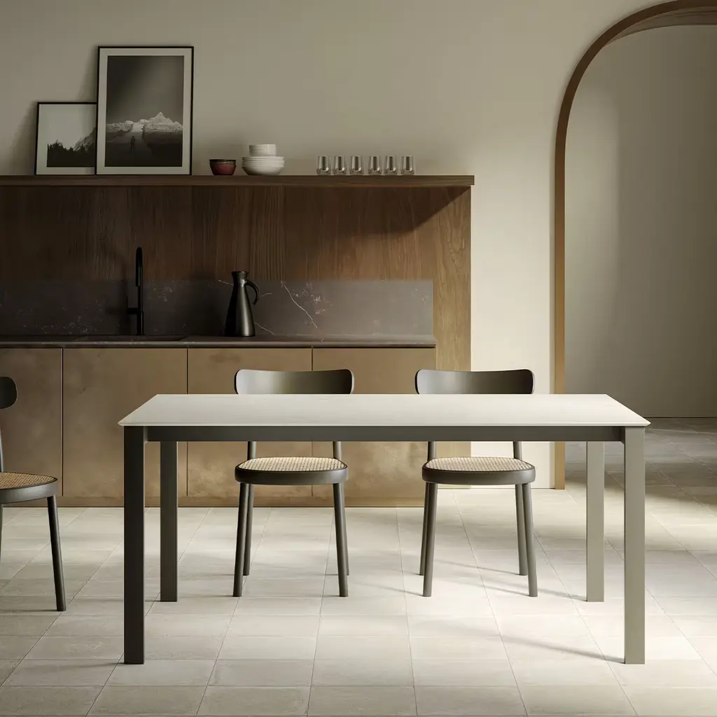 From game nights to candlelit dinners, this rectangular dining table from the Europe Collection epitomizes minimalist elegance. A rigorous lacquered iron base sustains the luminous stoneware top—here offered in a light version flaunting delicate veins—which can be extended up to 220 cm thanks to a rotating leaf. Please contact the Concierge for details on its smaller variant and the wide variety of available finishing options.