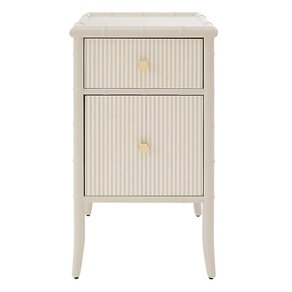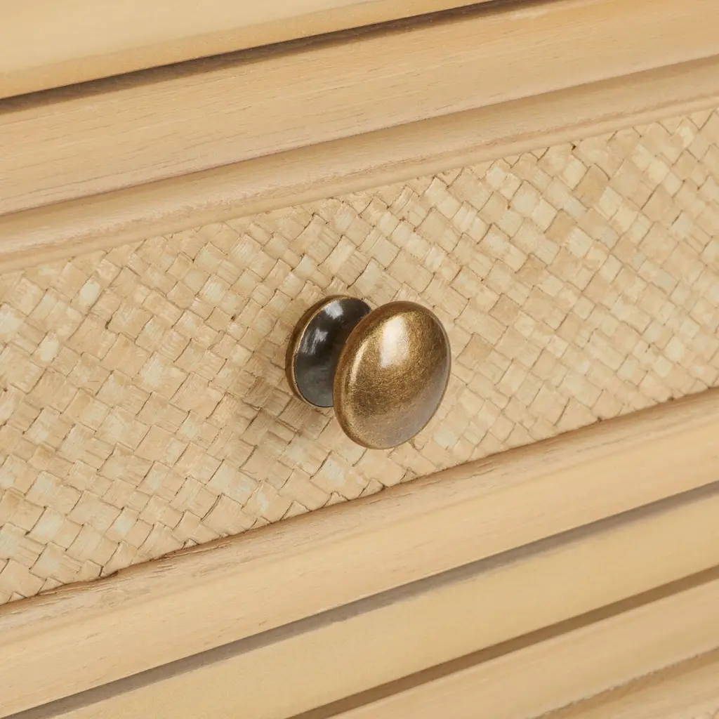 This side table's two drawer fronts and side panels have inserts textured to resemble woven rattan, which adds to the tropical elegance of the bamboo-style frame. Golden drawer pulls and ferrules are a graceful finishing touch.