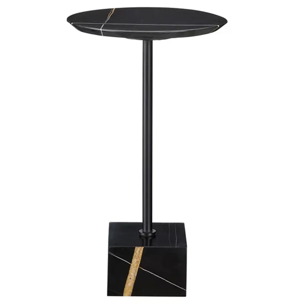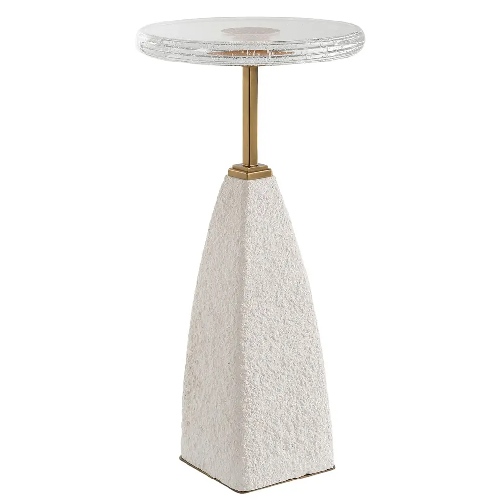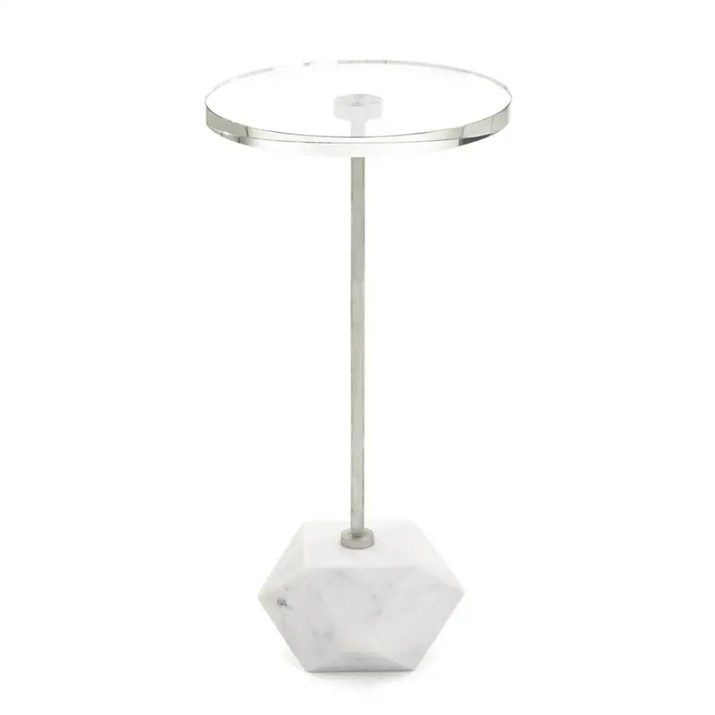 The Facet Martini Table is a contemporary design statement with a tastefully subtle silhouette. A geometric base crafted from white marble supports a slender steel rod adorned in Antique Silver Leaf. A clear, rounded crystal surface completes the look of this stylish accent table.