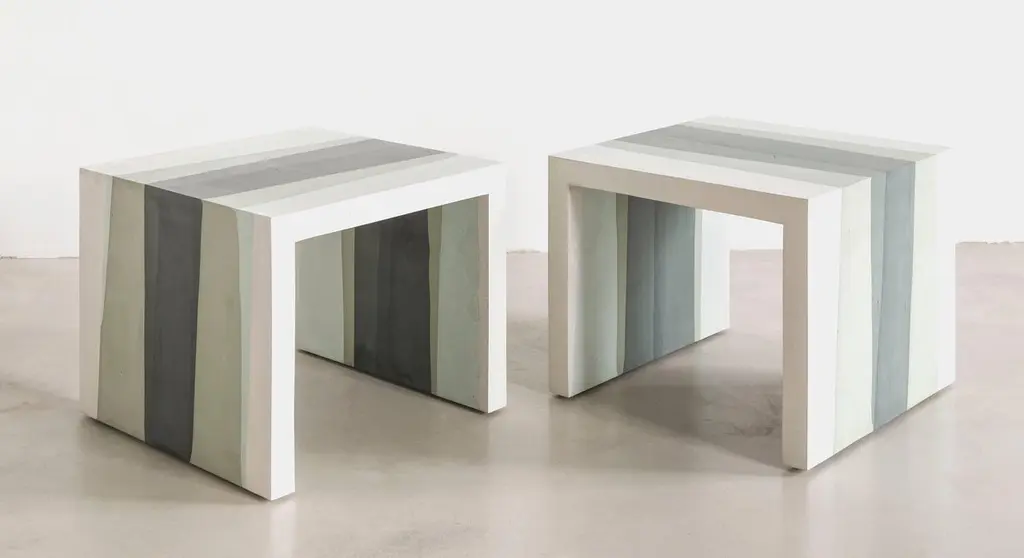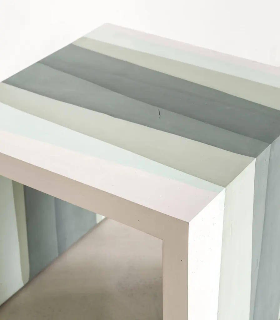 A contrast of softness and sharp angles, the made-to-order side table is cast entirely from hand-dyed cement. Poured in layers, the simple geometric form creates a light ombre effect reminiscent of watercolor. The piece weighs approximately 65lbs.