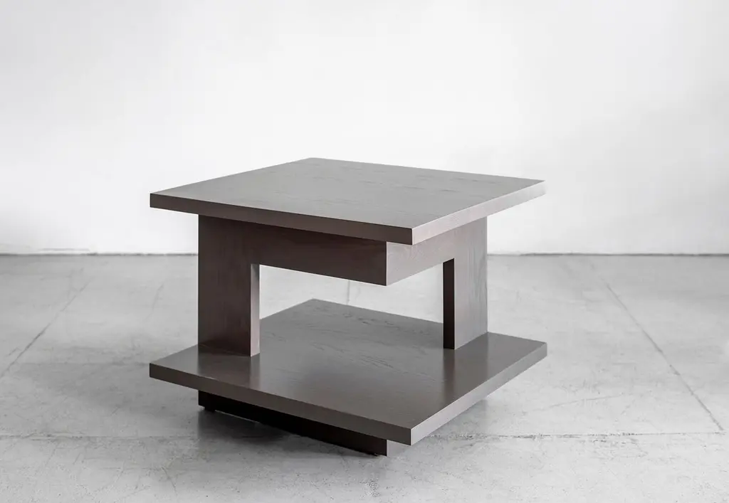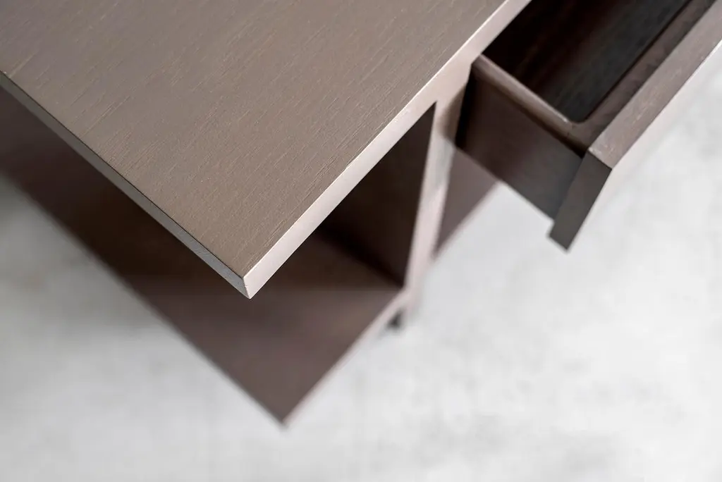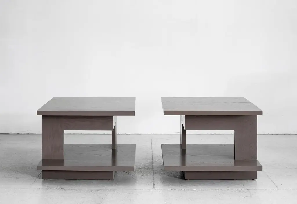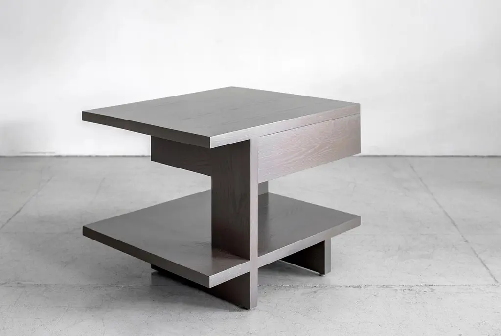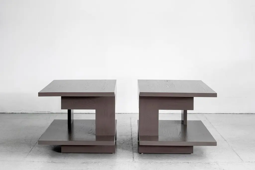 Pair of end tables with geometric shaped design and pull out / pull-out drawer. Great from all angles. Newly produced by Orange in oak with grey smoke stained finish.