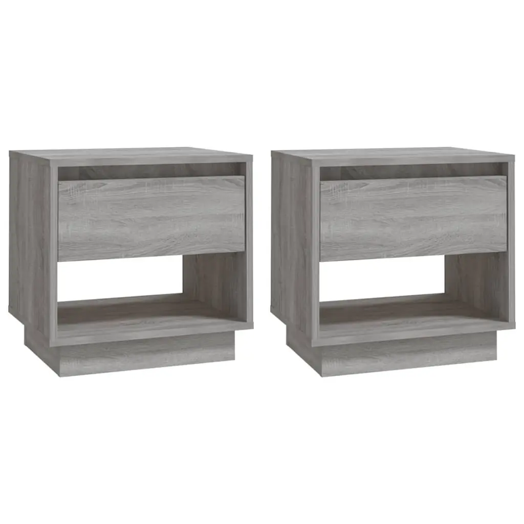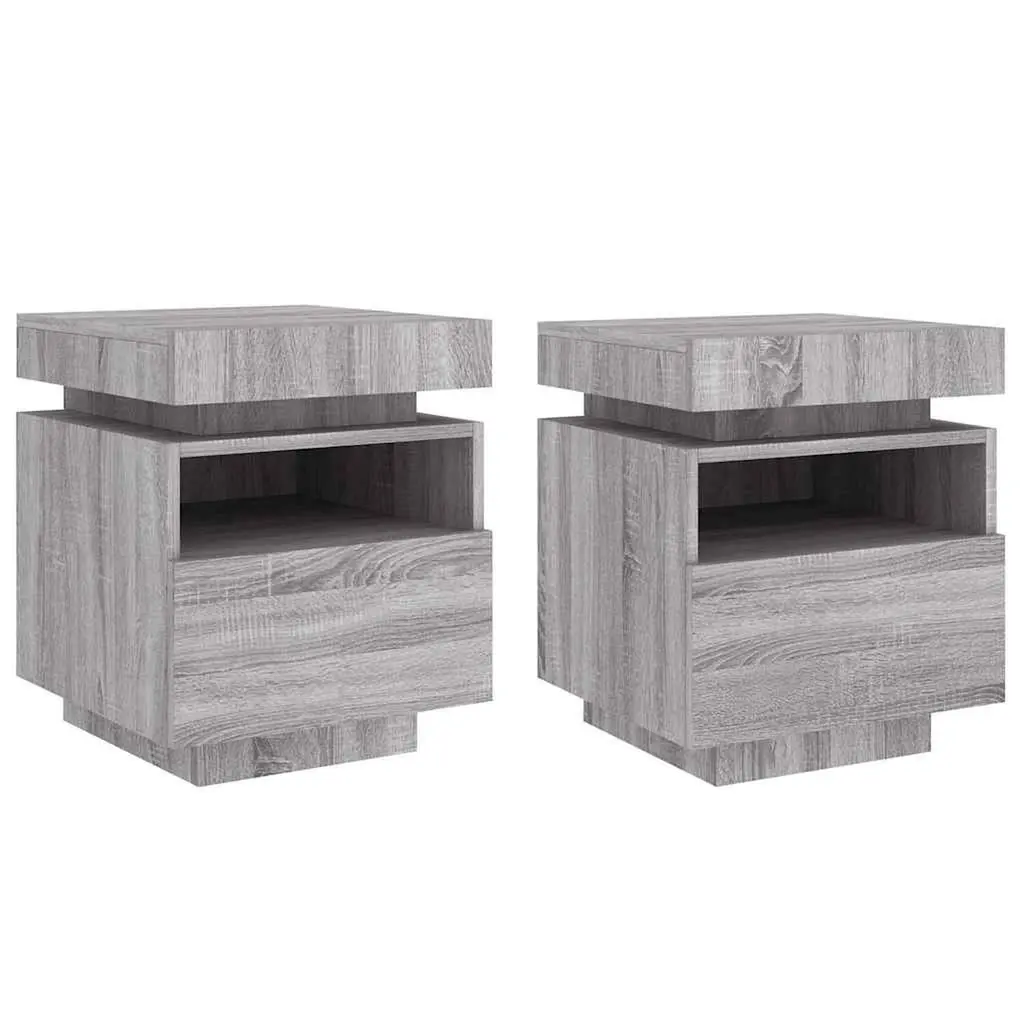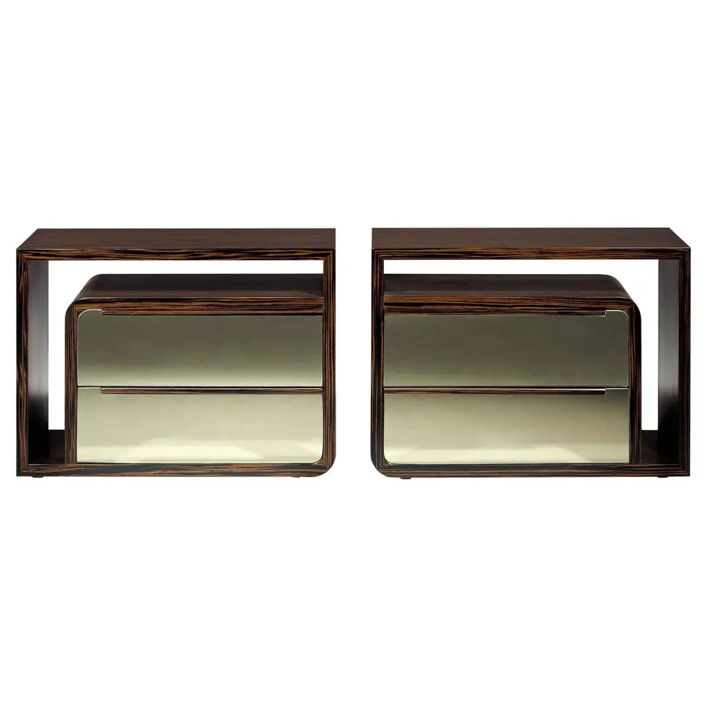 Pair of end tables with geometric shaped design and pull out / pull-out drawer. Great from all angles. Newly produced by Orange in oak with grey smoke stained finish.