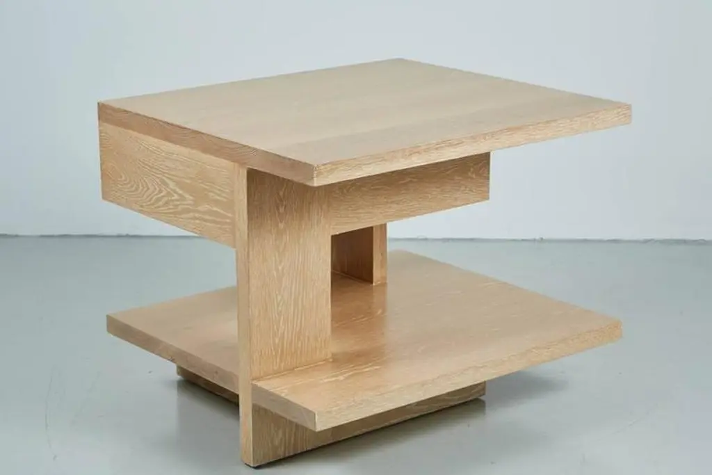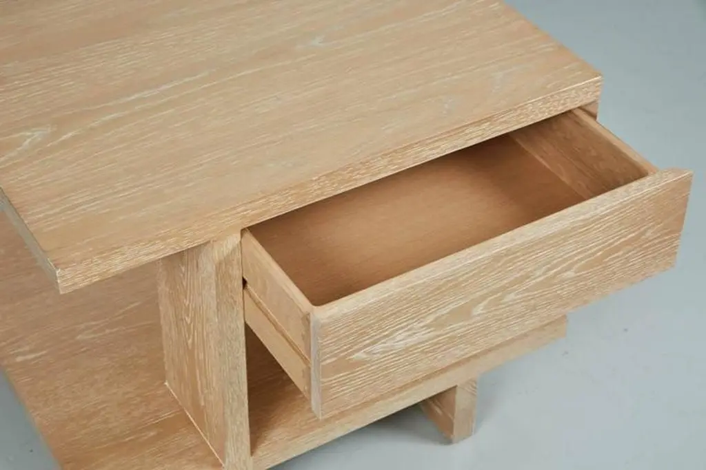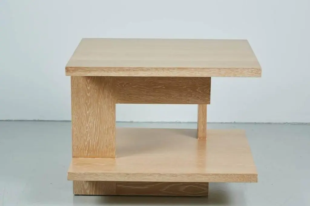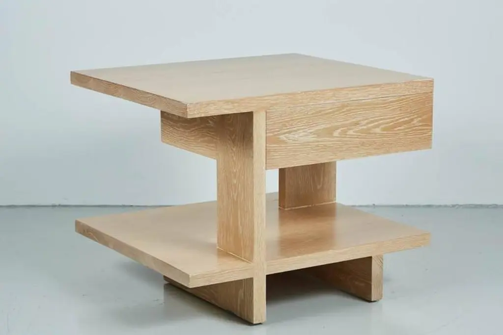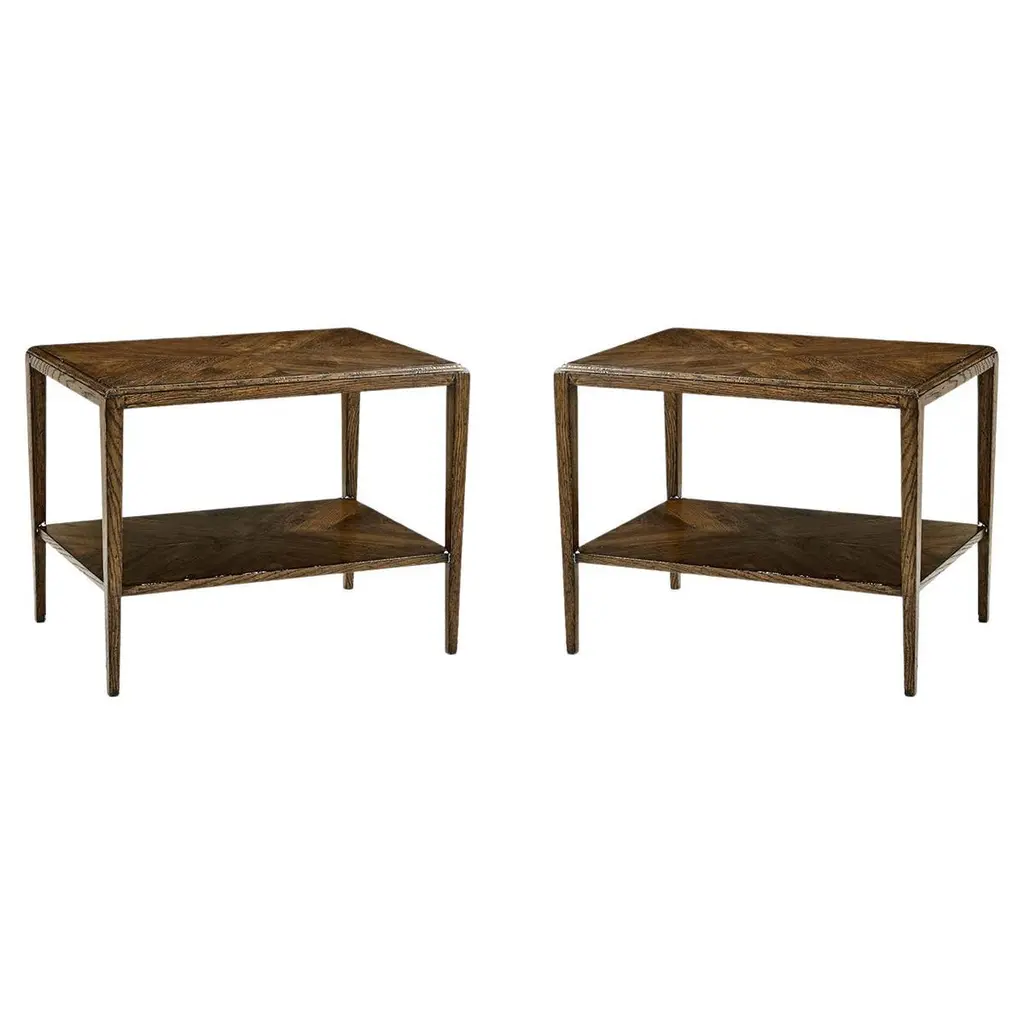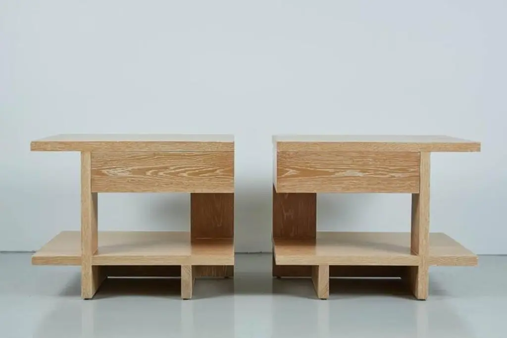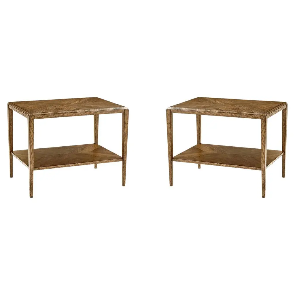 Pair end tables with geometric shaped design and pull out drawer. Great from all angles. Newly produced in oak with a cerused finish.