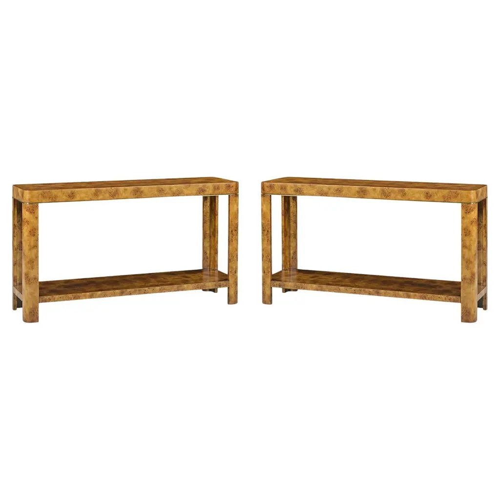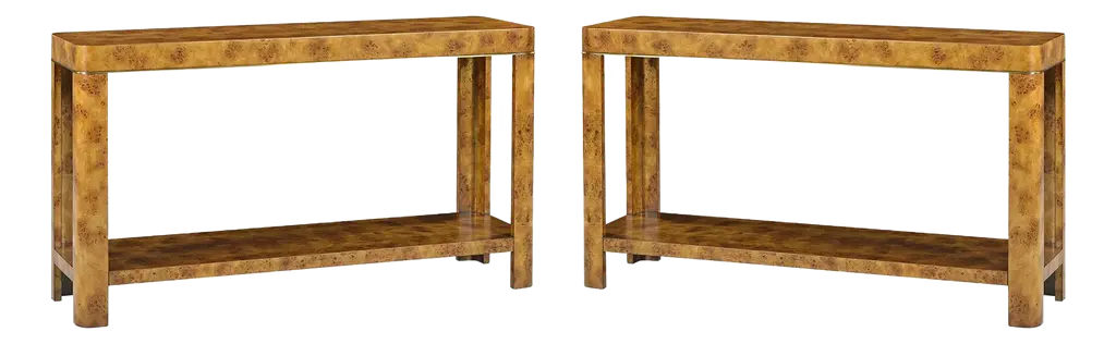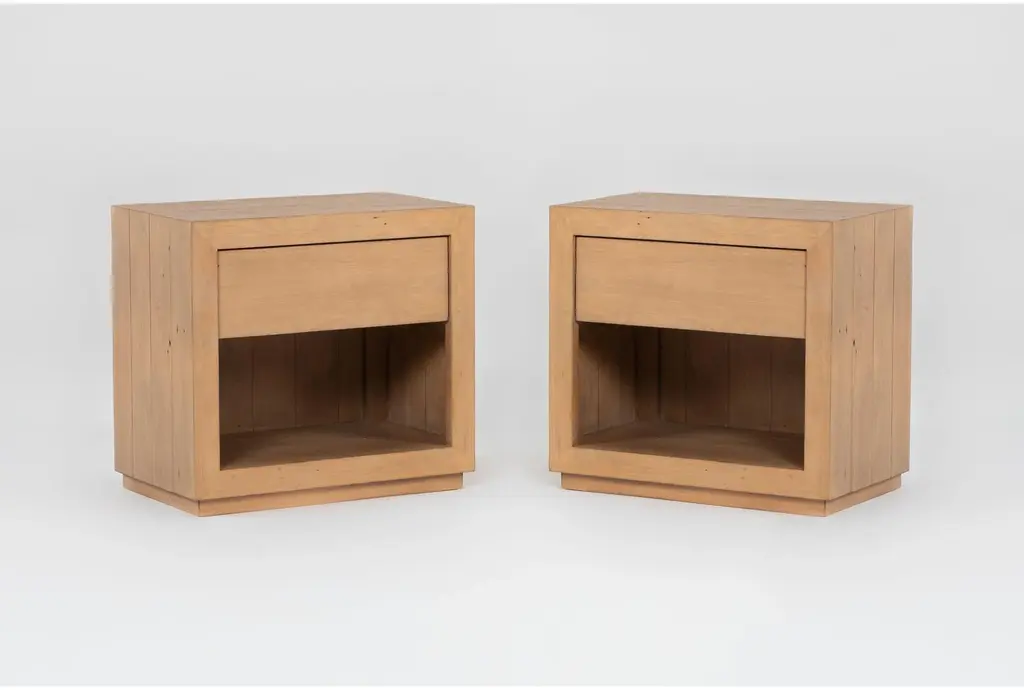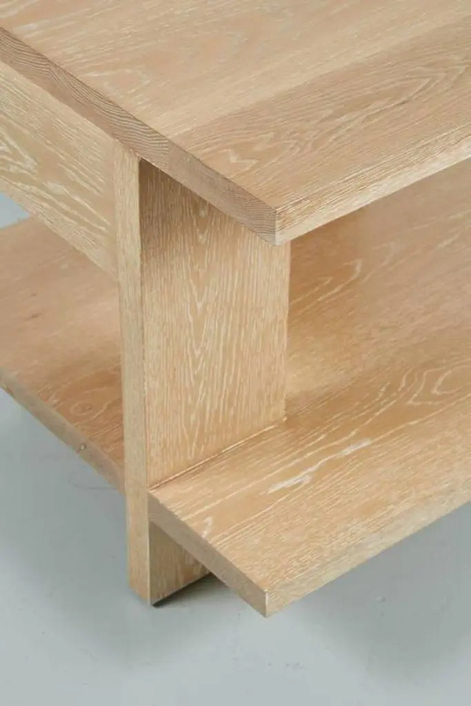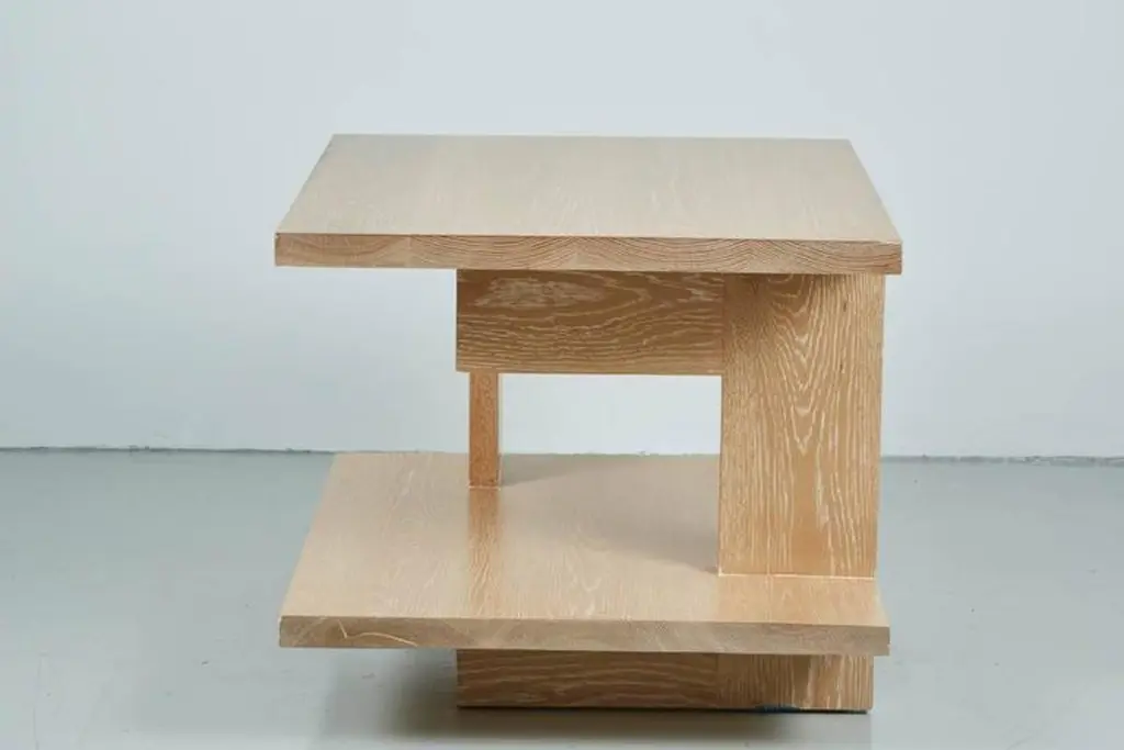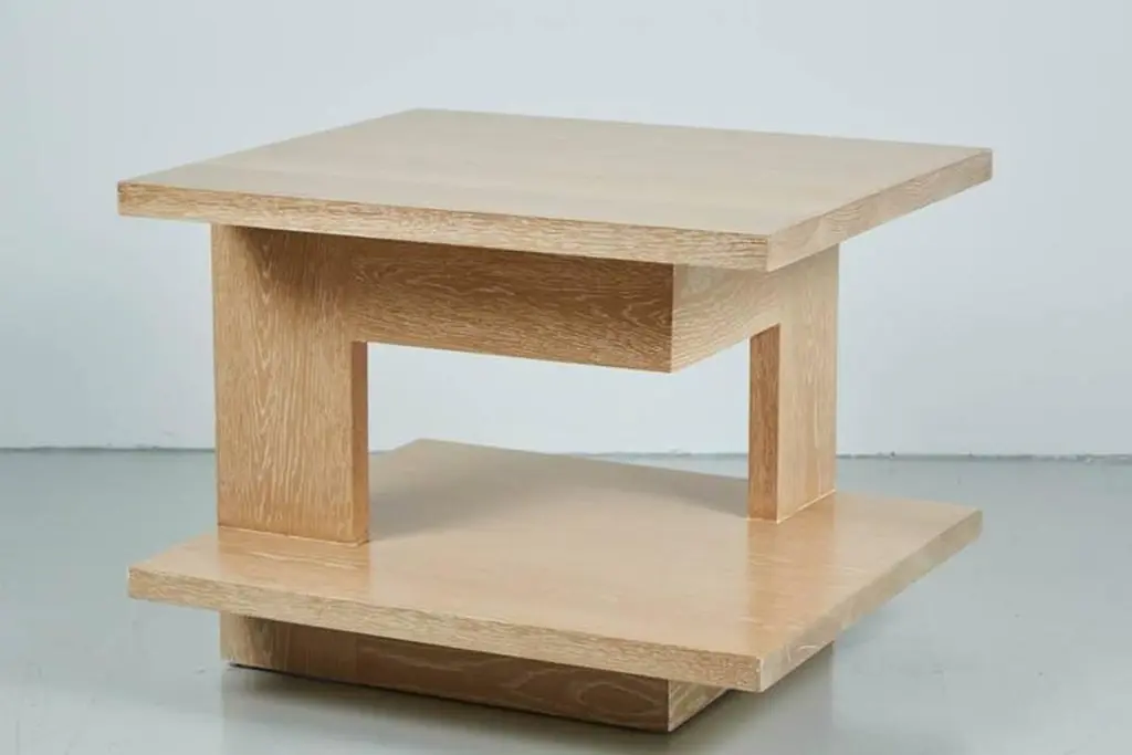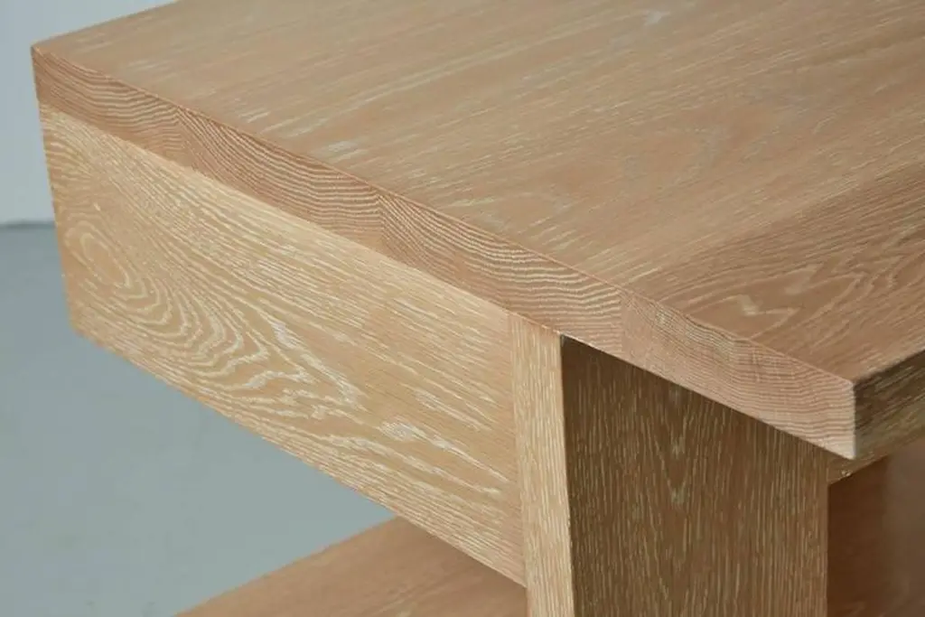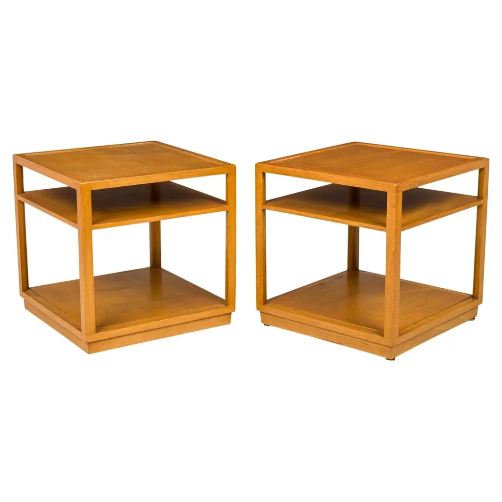 Pair end tables with geometric shaped design and pull out drawer. Great from all angles. Newly produced in oak with a cerused finish.