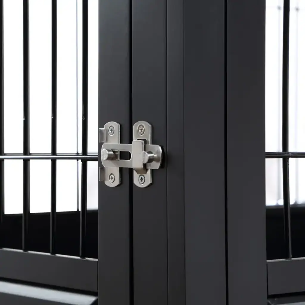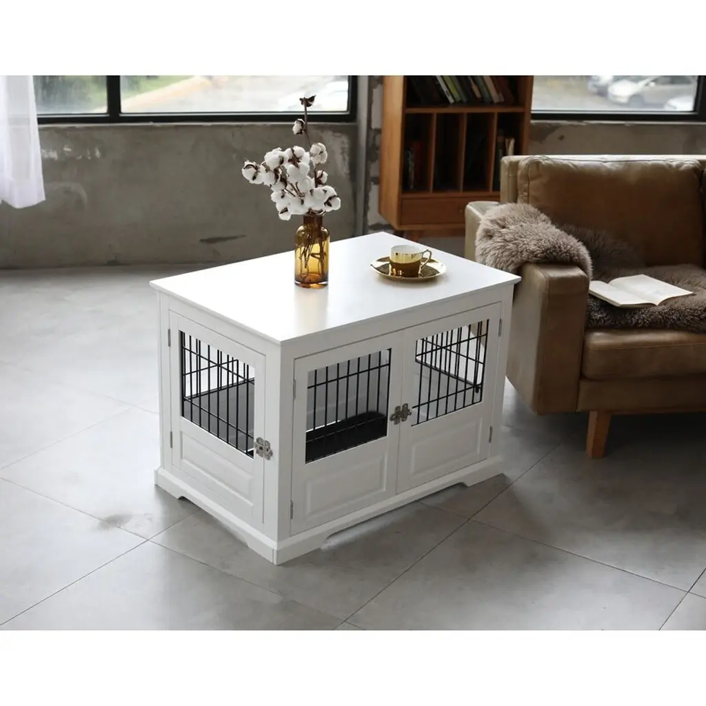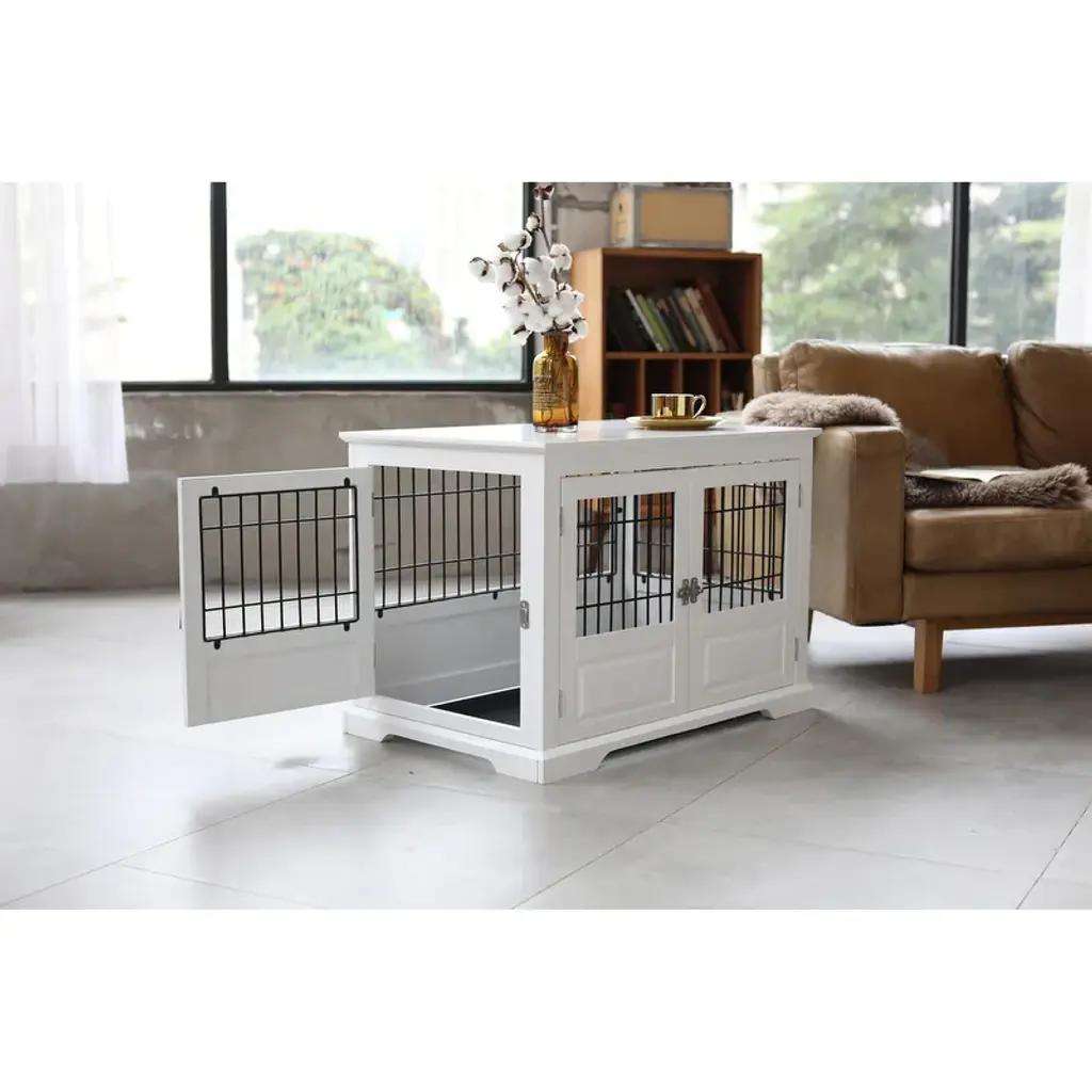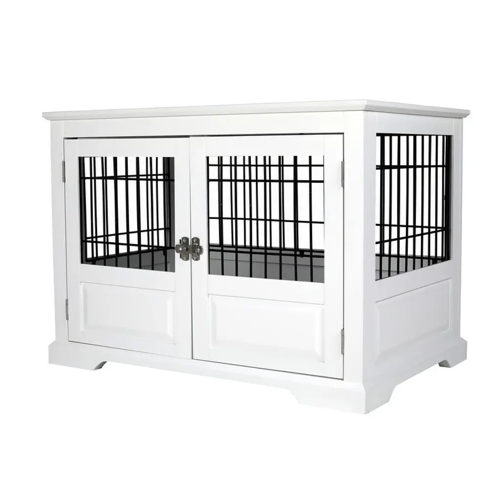 Treat your pet to this stylish indoor crate which also conveniently doubles as a side table. The create is available in white or black and includes a removable plastic tray. The framed panel design and metal bars are a classy look that will work with most interior décor styles.Features:Dimensions: