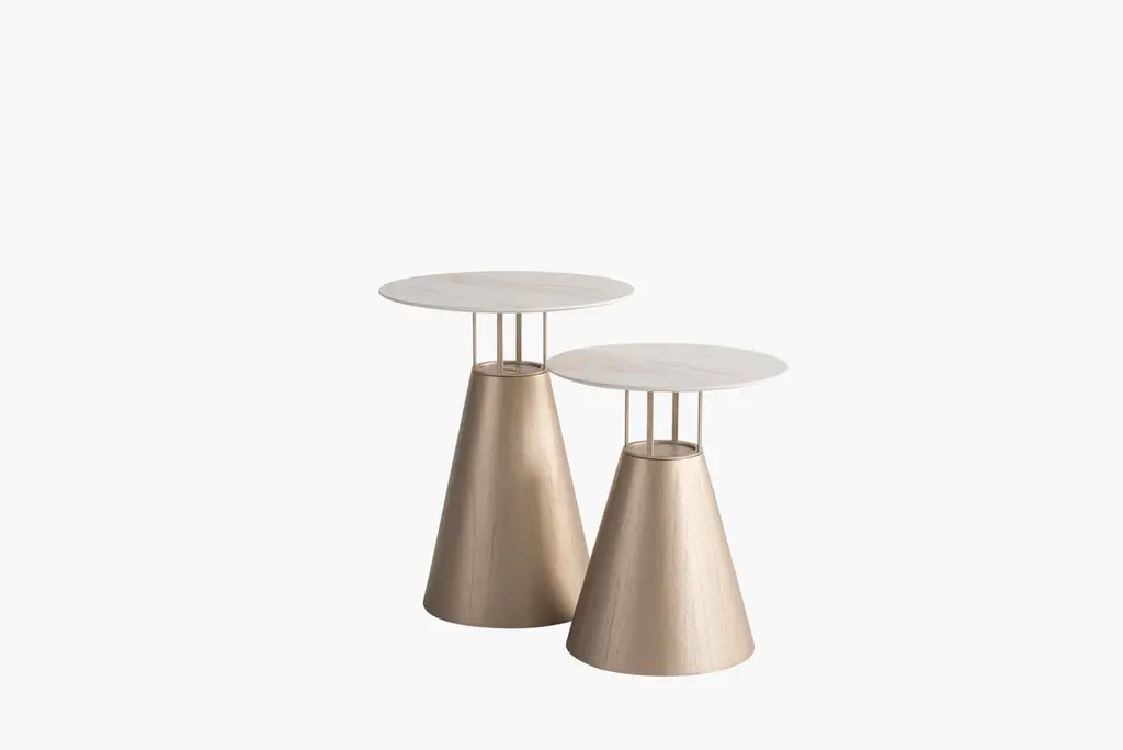 "Farol" Side Table Cone Base In Golden Wood Laminate Top In Laminatto Calacata