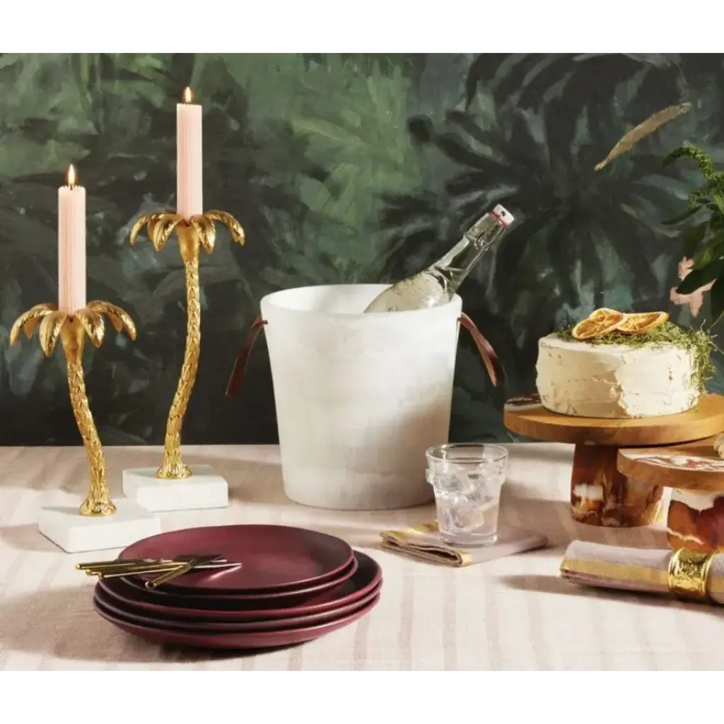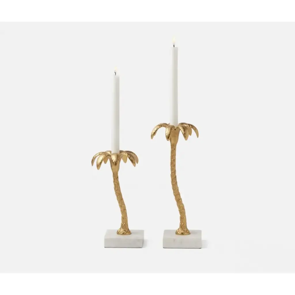 Finish: Gold/White Material: Aluminum/Marble Palm trees sway over the table with our Farrah candlesticks, two sculptural, slightly surreal pieces. Each curving aluminum palm tree is finished with gold and rests on a white marble base. Blue Pheasant's products are handmade with care by artisans using natural materials. They are not mass produced, so variation between products should be expected, and this is why we love them! It is these irregularities that makes Blue Pheasant what it is—a special brand whose collections are distinctly handmade, full of charm and originality you’ll never find in machine-made products.