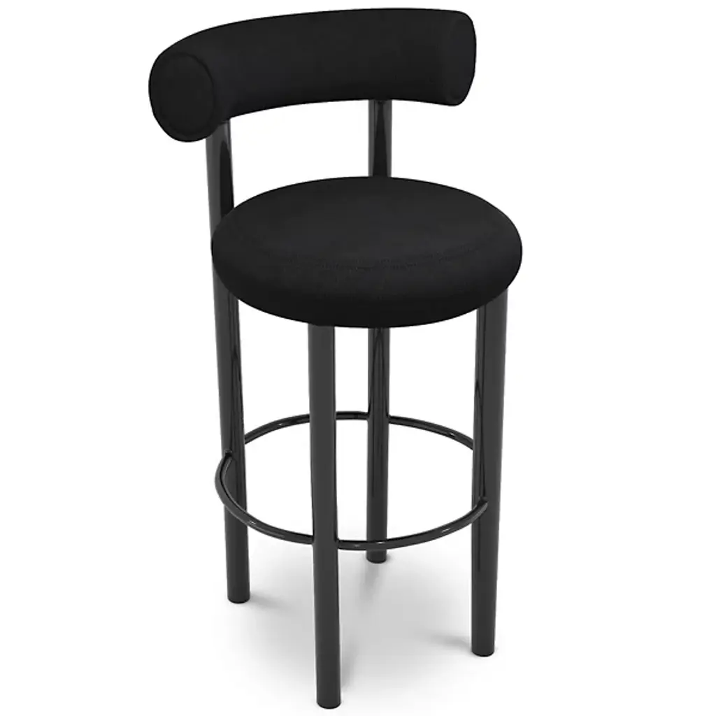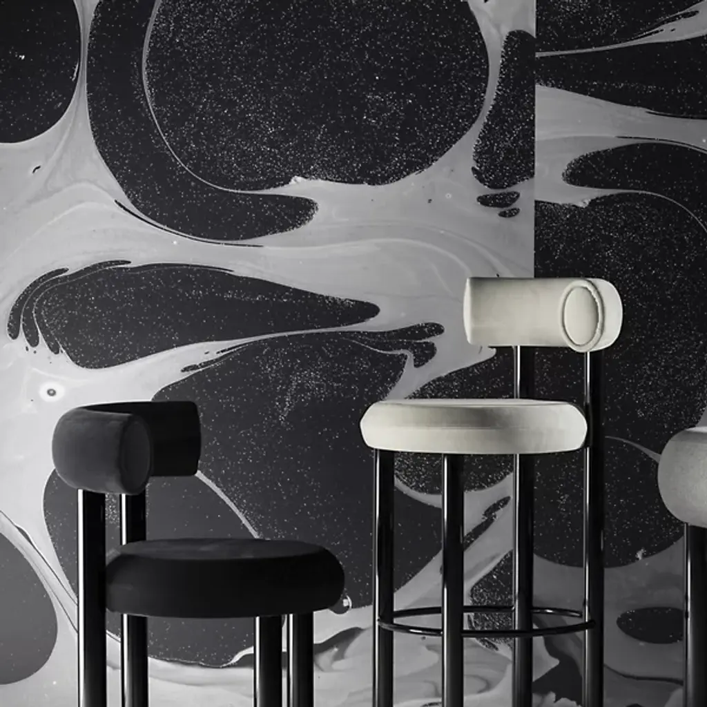 Make a stylish addition to café spaces, tall side tables, or breakfast bars alike with the upward-reaching and open design of the Fat Barstool from Tom Dixon. A well-upholstered construction braced by four tall metal legs, it places a plushly-padded seat and curving, padded back done in molded foam, and surfaced in soft woolen fabric. Excellent as a paired arrangement, this contrasts elegantly with the glossy metal surfaces below it, adding visual engagement to physical comfort.