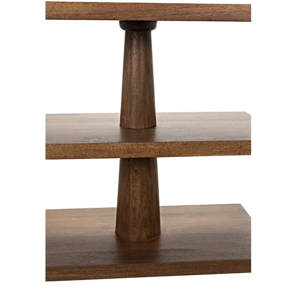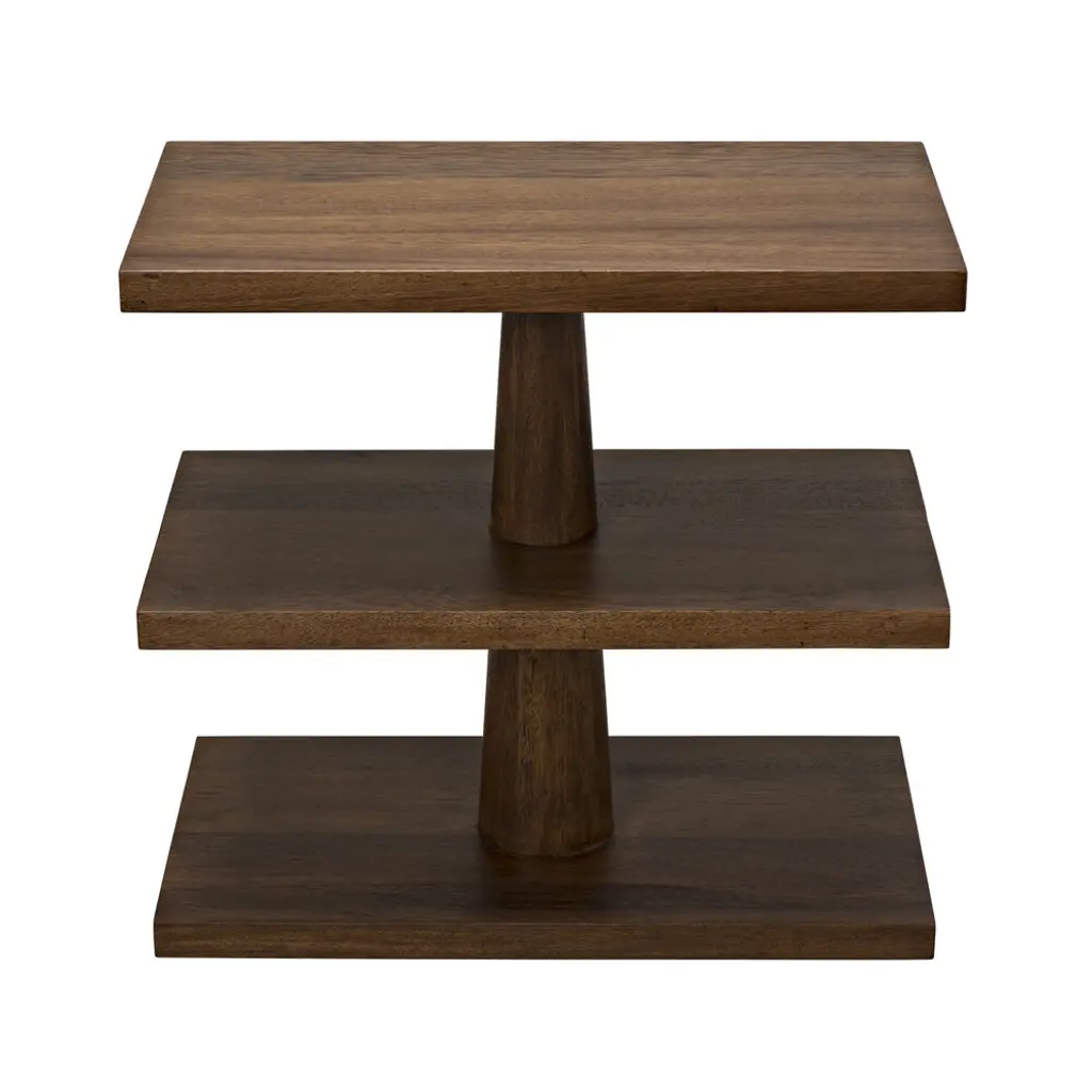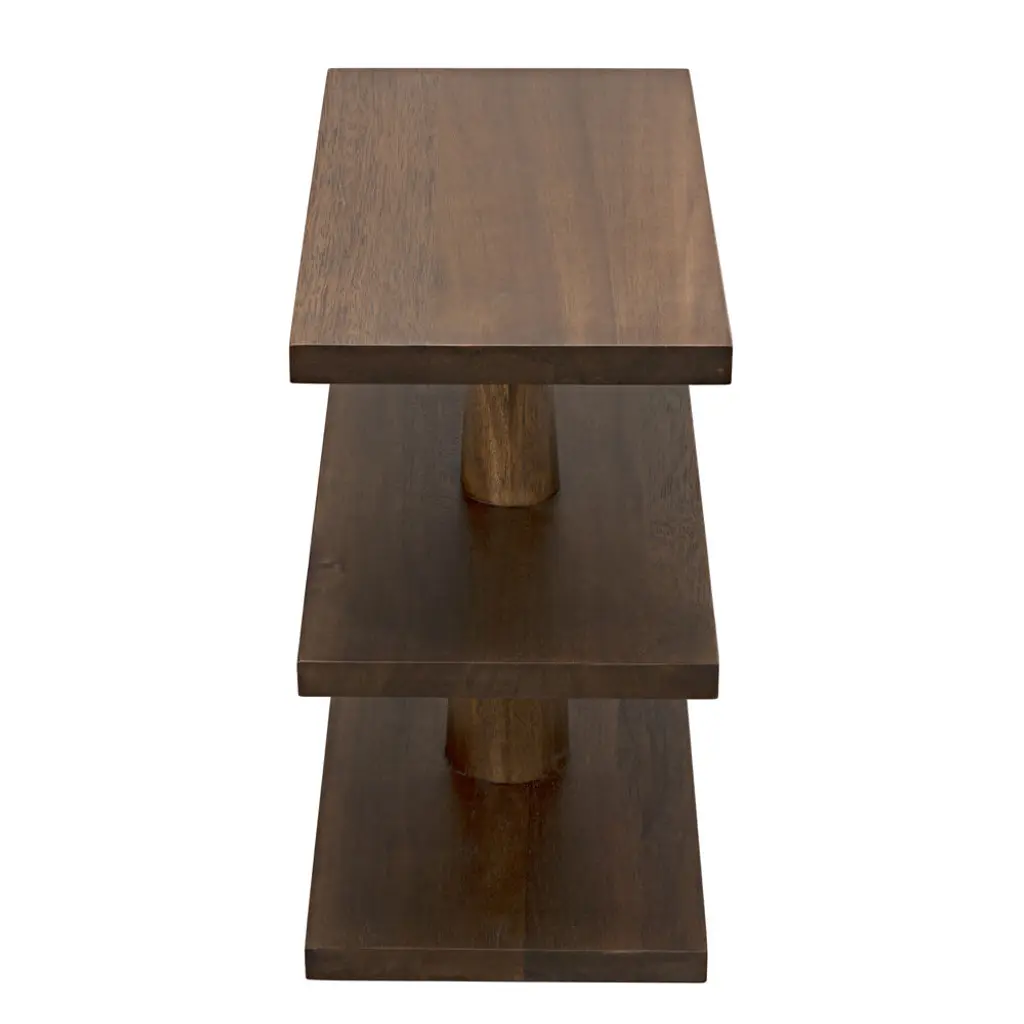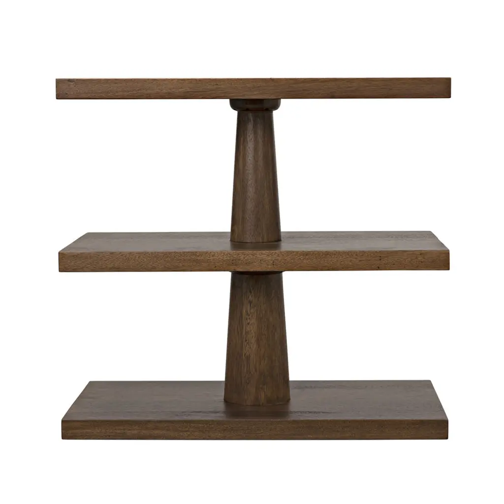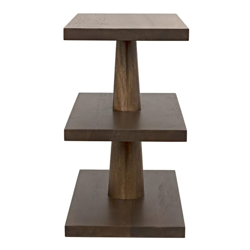 Like a toy put together by a very clever child, this charmingly primitive side table has been expertly handcrafted of walnut and hand-finished to celebrate the wood's natural stain. Three variegated shelves provide intriguing display options.