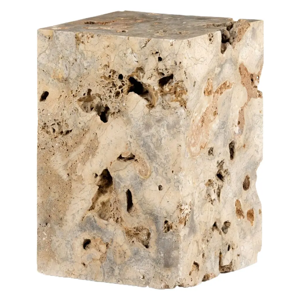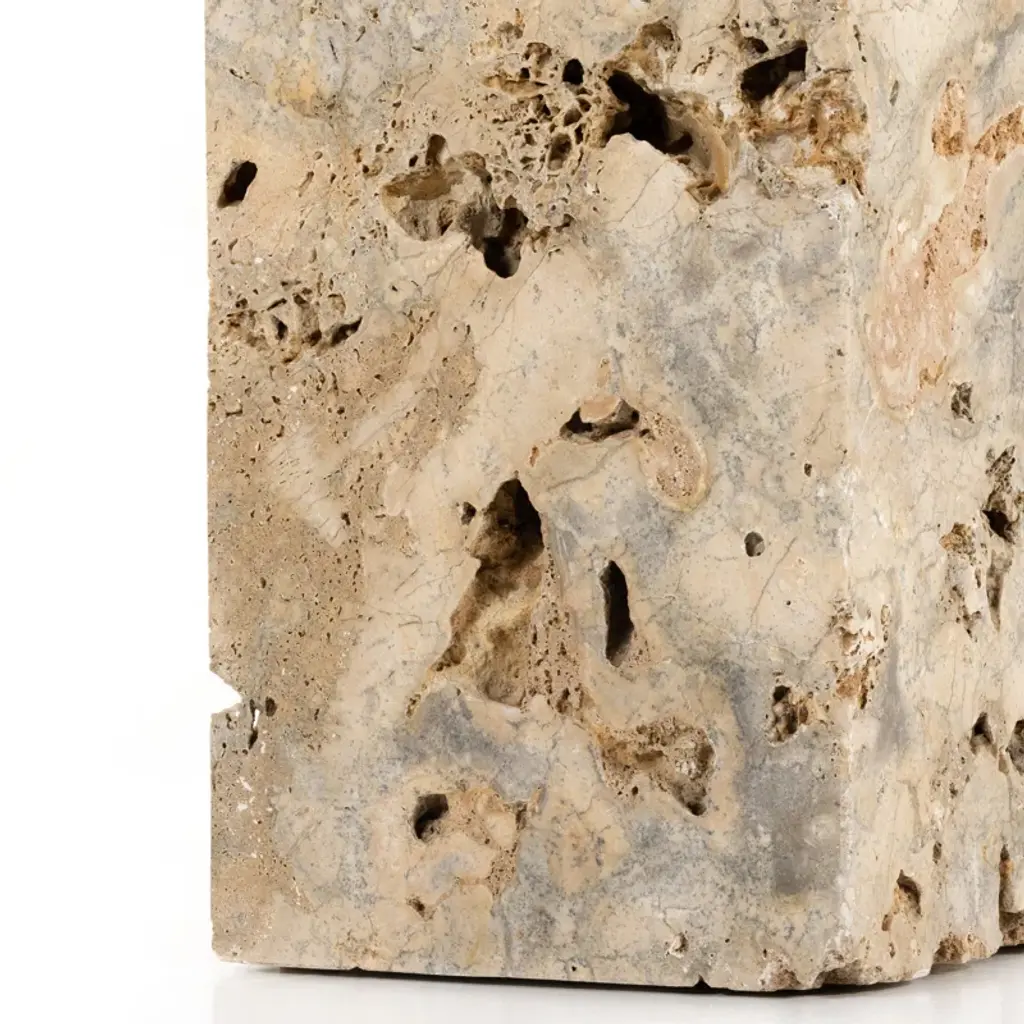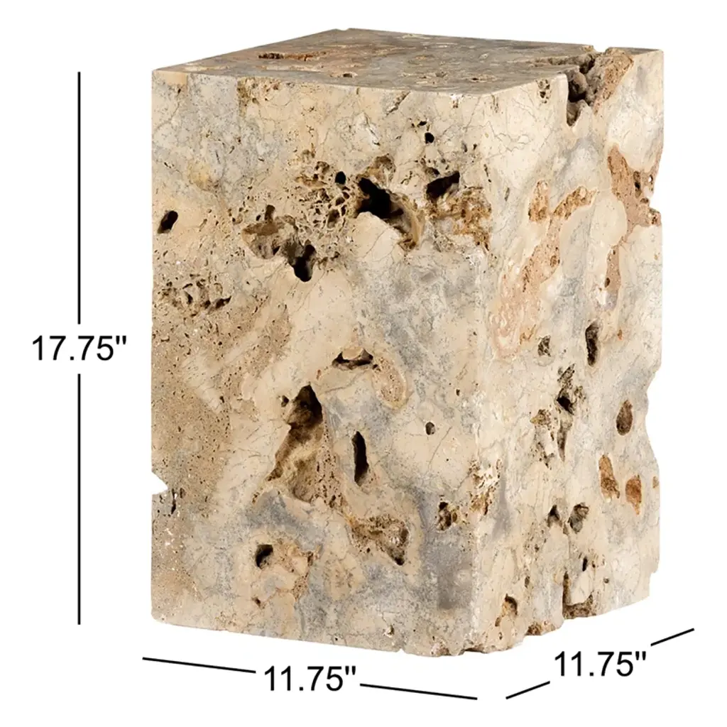 This modern end table features a dynamic square travertine top and base, bringing a touch of sophistication to your living room or bedroom. The natural grain color variation adds an organic element to your space. With its minimalist design, this table is perfect for displaying a lamp, a small plant, or your favorite decorative accents. Enjoy a fresh, contemporary look with this elegant piece that makes a great companion to any armchair or headboard.