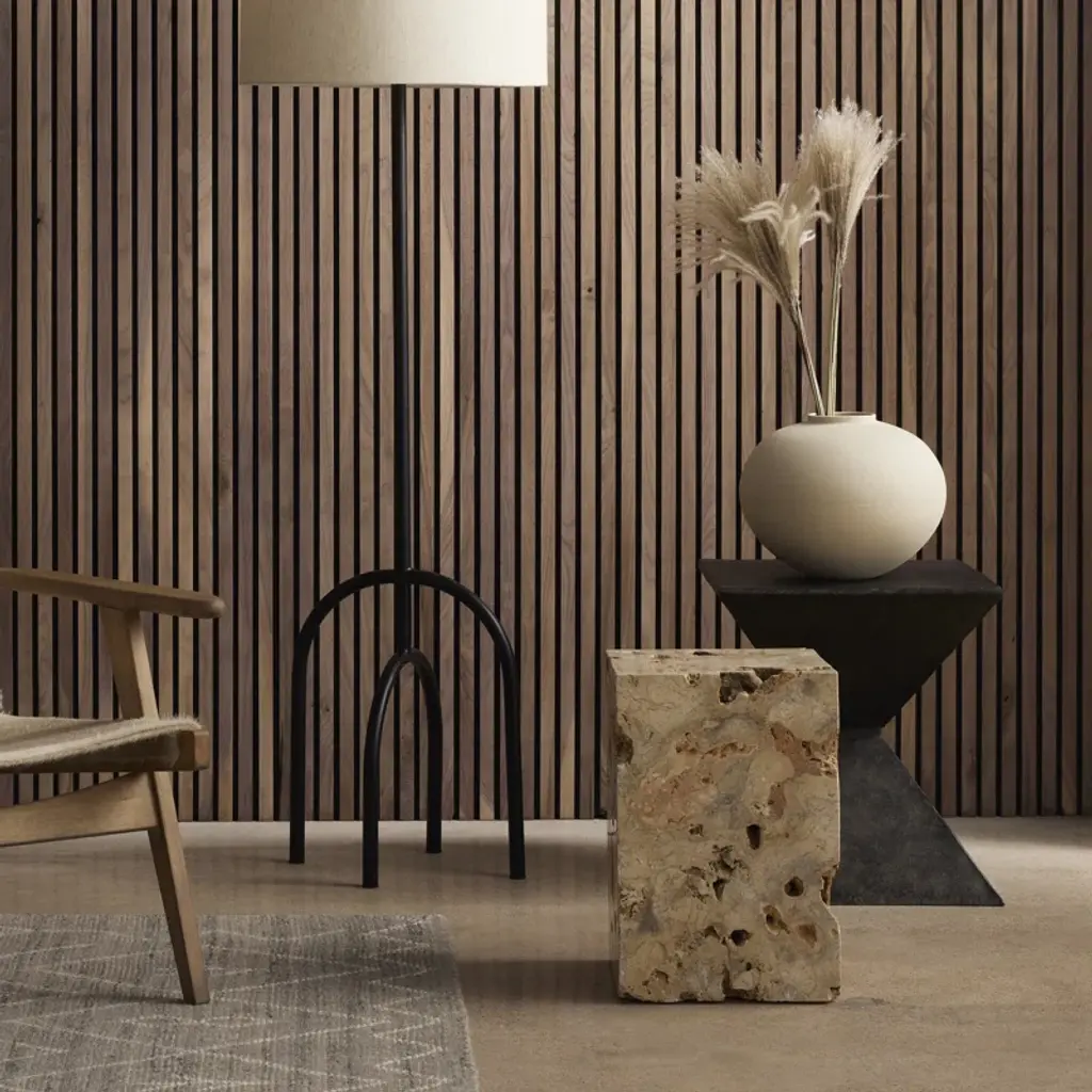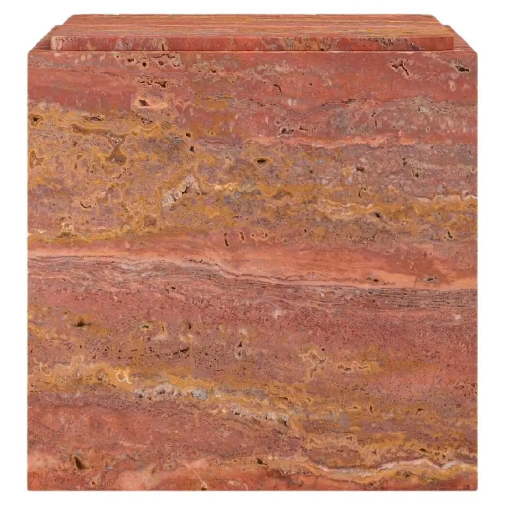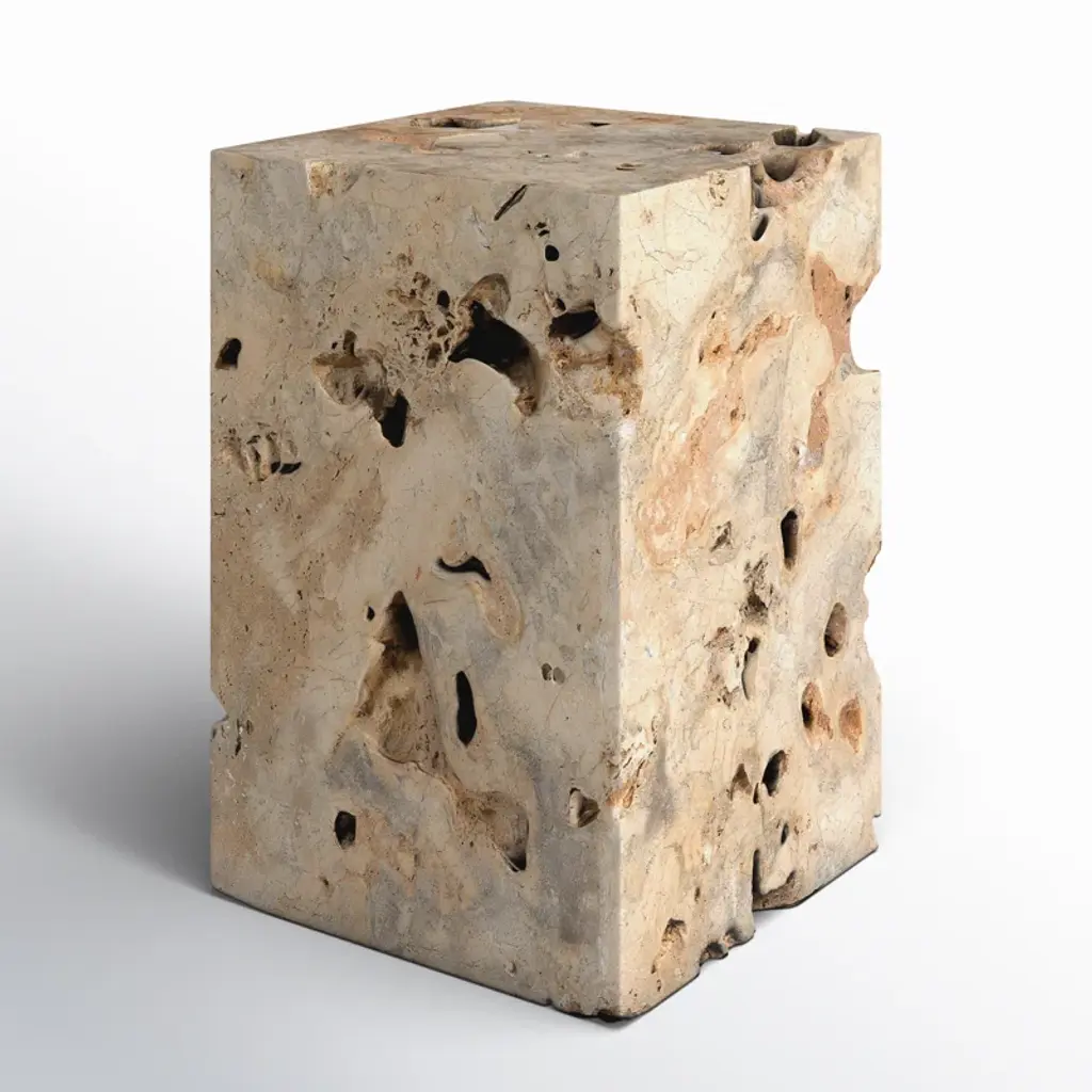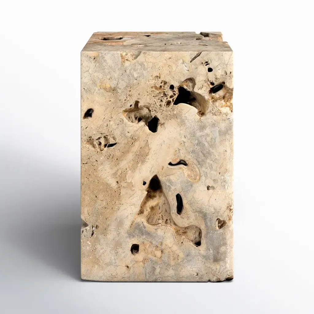This modern end table features a dynamic square travertine top and base, bringing a touch of sophistication to your living room or bedroom. The natural grain color variation adds an organic element to your space. With its minimalist design, this table is perfect for displaying a lamp, a small plant, or your favorite decorative accents. Enjoy a fresh, contemporary look with this elegant piece that makes a great companion to any armchair or headboard.
