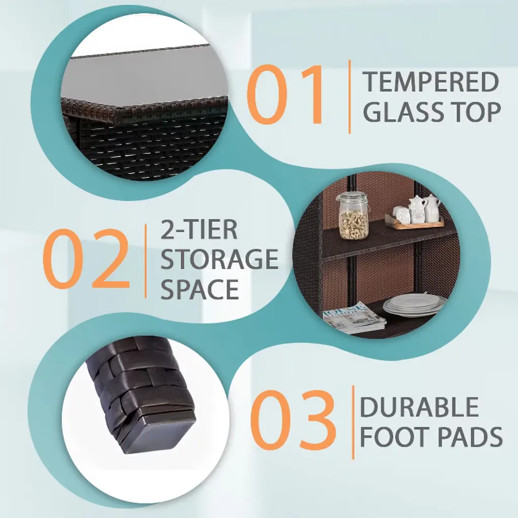FDW Patio Bar Set is a stylish and functional outdoor furniture piece that adds a touch of elegance to any space. This long-lasting patio wicker bistro set is made with premium rattan and a strong steel frame. Convenient storage shelves let you keep your bar items organized on the accompanying glass-topped bar table. You and your visitors can sit comfortably on the two bar stools since they are equipped with detachable cushions. This patio bar set is a terrific addition to any house since it is simple to install and has a wide range of applications, making it ideal for both inside and outdoor entertaining.