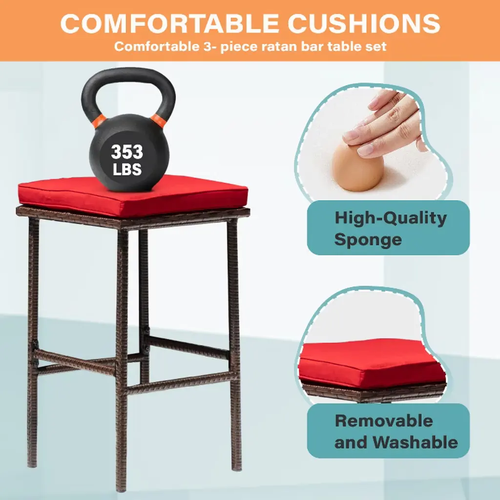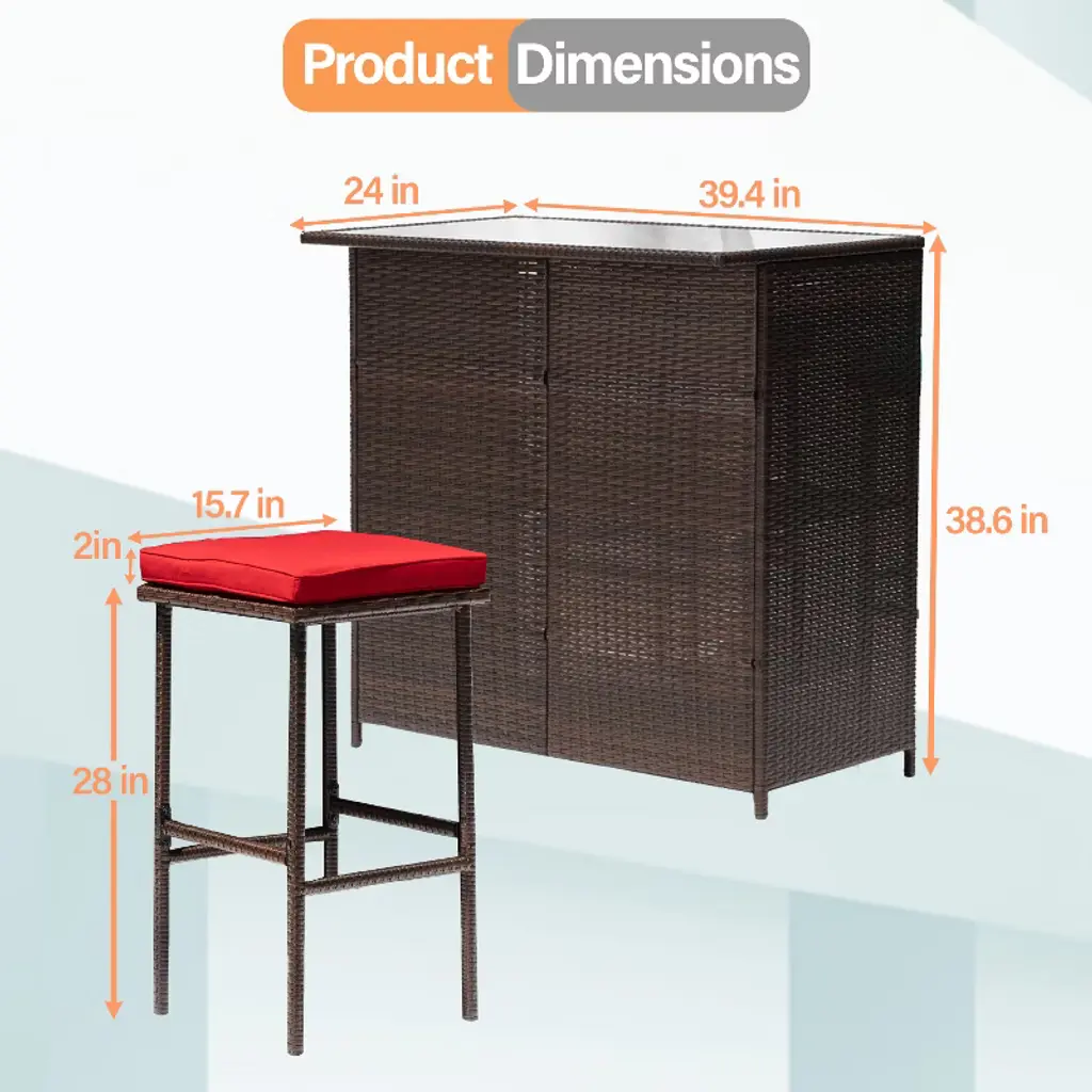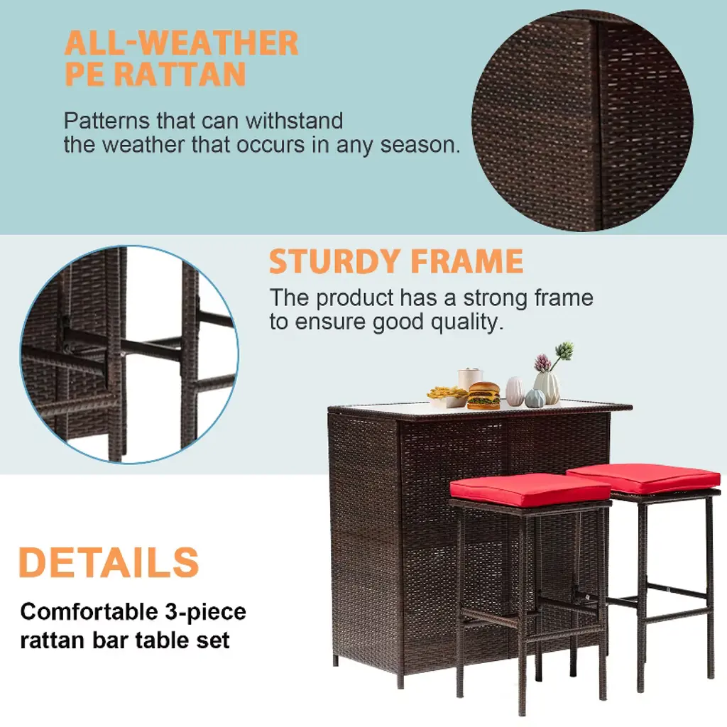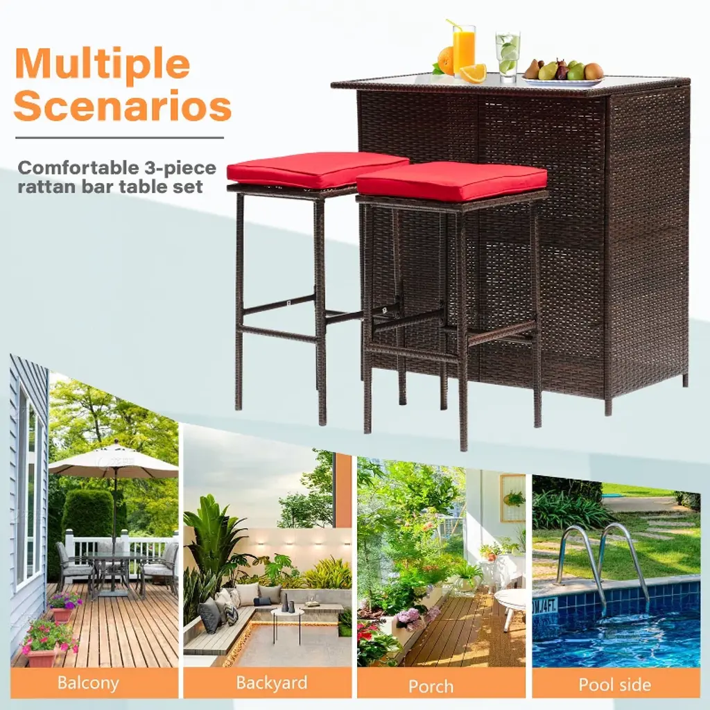 Fdw 3 Piece Bar Set Patio Furniture Sturdy Frame Bar Height Table With Two Stools Glass Top And Storage Shelves Perfect For Balcony Pool Side, Red