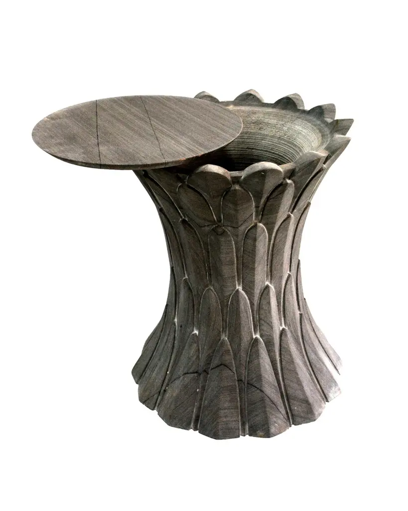 "Introducing the Feathers Art Deco Side Table in Agra Grey Stone - a mesmerizing art deco side table handcrafted in India. Designed by Stephanie Odegard, this art deco side table draws inspiration from the timeless beauty of Art Deco design, resulting in a stunning blend of aesthetics and craftsmanship.Measuring 14"" x 14"" x 17"" in size, this art deco side table showcases meticulous attention to detail. It is expertly crafted from locally sourced Agra Grey Stone, known for its durability and natural elegance. The stone is skillfully hand-carved by artisans, who have tastefully incorporated an intricate leaf motif reminiscent of Art Deco style.The Feathers Art Deco Side Tables are available in various other exquisite stones, including Agra White Marble, Jaisalmer Stone, Rainbow Teak-wood Stone, Katni Stone, Black Beslana, and Agra Grey. Each stone option adds its own unique character and aesthetic appeal to these Art Deco Side Tables, allowing you to choose the perfect pieces to complement your interior design.To achieve a more contemporary and light appearance, the arrangement of the carved leaf motif has been thoughtfully toned down, giving the art deco side table a refined and sophisticated look. The semi-matte finish further enhances the beauty of the Agra Grey Stone, adding a touch of understated elegance.The Feathers Art Deco Side Table serves as both a functional furniture piece and a captivating work of art. It effortlessly elevates any space, be it a living room, bedroom, or hallway, with its exquisite design and cultural significance. Inspired by the temple carvings in and around Udaipur, this table encapsulates the rich artistic heritage of India.Stephanie Odegard's passion for blending traditional craftsmanship with contemporary aesthetics is evident in every aspect of this art deco side table. Immerse yourself in the allure of Art Deco design and experience the beauty of Indian craftsmanship with the Feathers Art Deco Side Table in Agra Grey Stone. Add a touch of timeless elegance to your home with this remarkable piece that will undoubtedly be a conversation starter in any room."