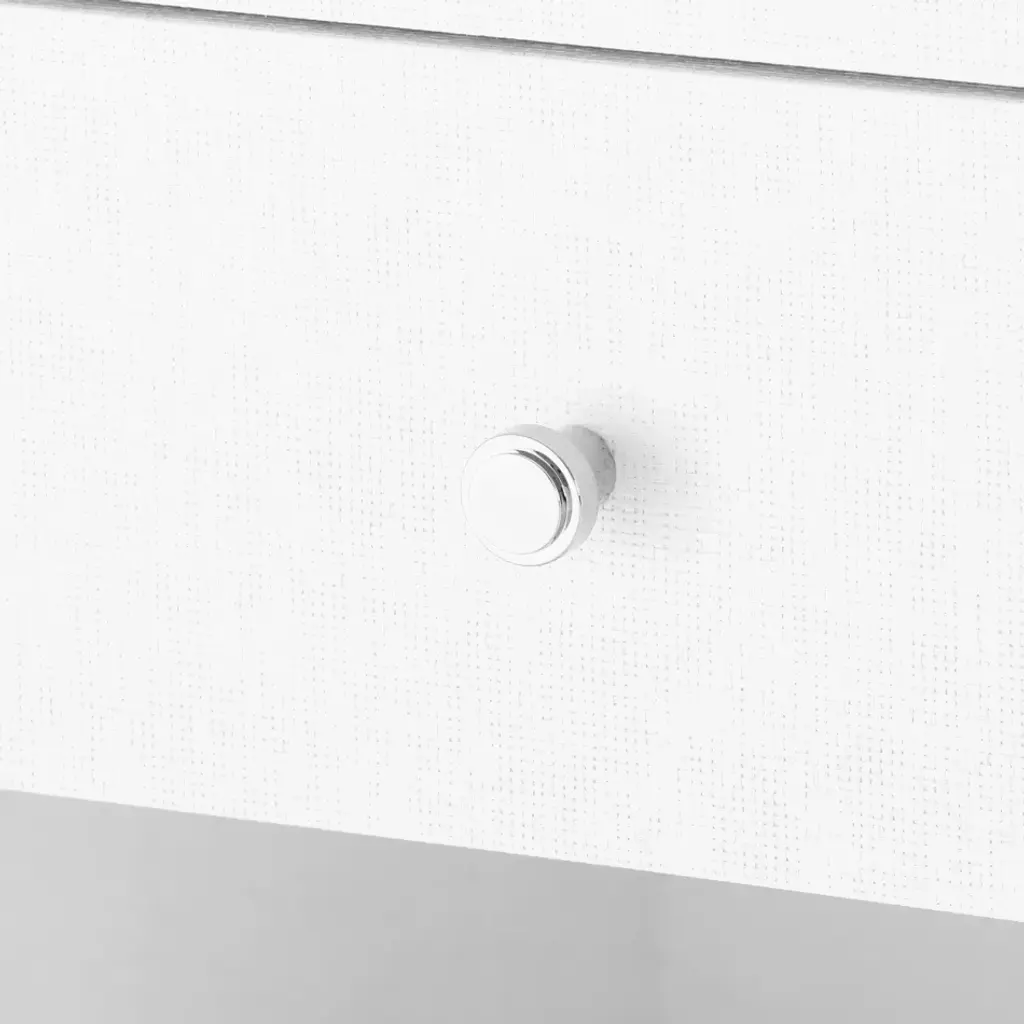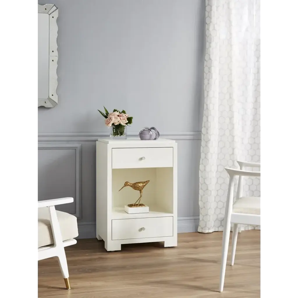 Flaunting crisp lines and a contemporary approach, the Fedor 2-Drawer Side Table updates a classic silhouette with sculptural surprises, most notably an airy concave center which calls for customization—the perfect place to spotlight your favorite decorative statue or stack of coffee table books. Its layered platform top provides another opportunity for open display, while two soft-closing drawers allow for useful storage. Material-wise, the Fedor is outfitted in white lacquered grasscloth, a rich textural feature complemented by the shine of its nickel finished hardware. All around, the Fedor is a lovely furnishing offering both style and function.