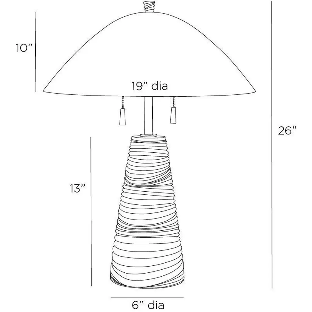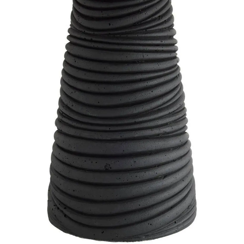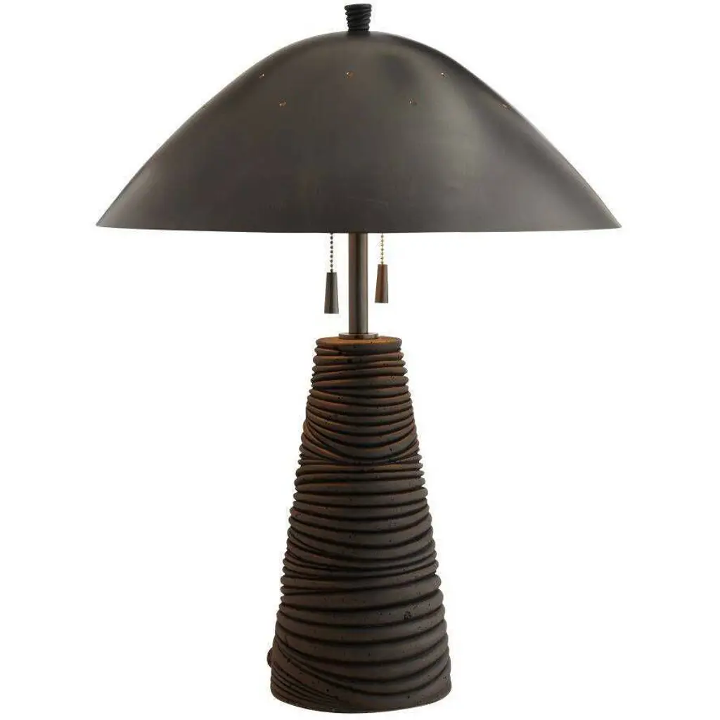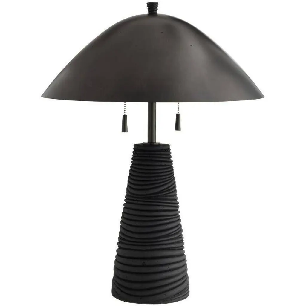 Crafted of black lava stone composite, the Fender has an eroded, ridged surface that lends textural intrigue. A helmet-like shade of bronze-plated steel reflects light to lend a moody vibe to any surface. Matching swirl texture finial and double bronze pull chains.