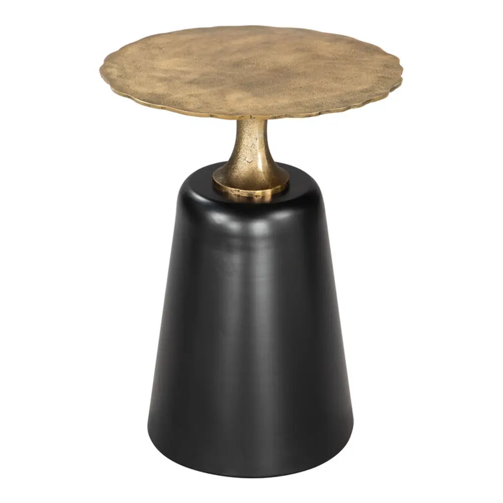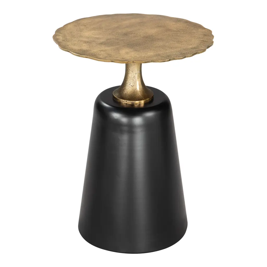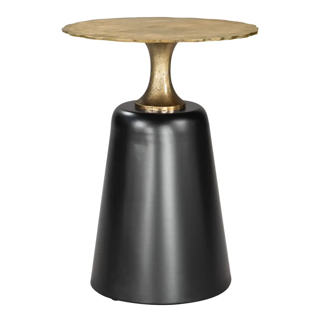 Crafted of iron by artisans in India, the Fenner two-tone side table features a golden round top that blooms above a conical black base. The sculptural gold metal surface of this contemporary side table creates a sophisticated contrast with the wide tapered frame. Durable yet lightweight, this minimalist end table is a compact icon for modern homes that serves as a space-saving pedestal for your favorite home decor.