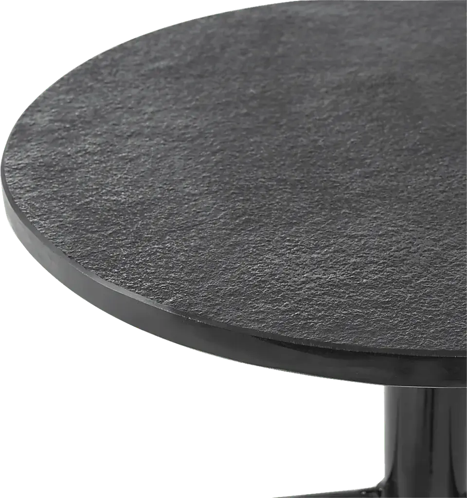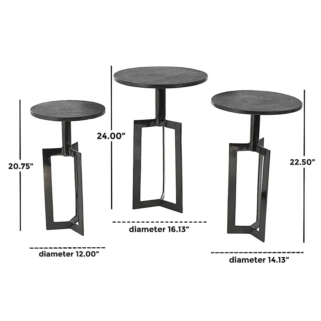 The Ferni accent table is designed with a free-spirited charm where vibrant hues, eye-catching patterns, and whimsical accents transform your space and showcase your personality. Crafted from high-quality aluminum, this black side end accent table sets offers durability and a contemporary aesthetic, showcasing a sleek and cohesive design. This table features a modern and versatile color palette with its matte black finish, providing a chic addition to any eclectic living space. A great feature of this aluminum set of 3 accent tables is the harmonious fusion of a round tabletop shape with a rectangular triangle base, creating a design that adds an eclectic touch to any space. Each black aluminum metal accent table measures 16.13L x 16.13W x 24H, 14.13L x 14.13W x 22.50H, and 12L x 12W x 20.75H inches, and collectively weighs 38.5 lbs. Customer assembly is required.