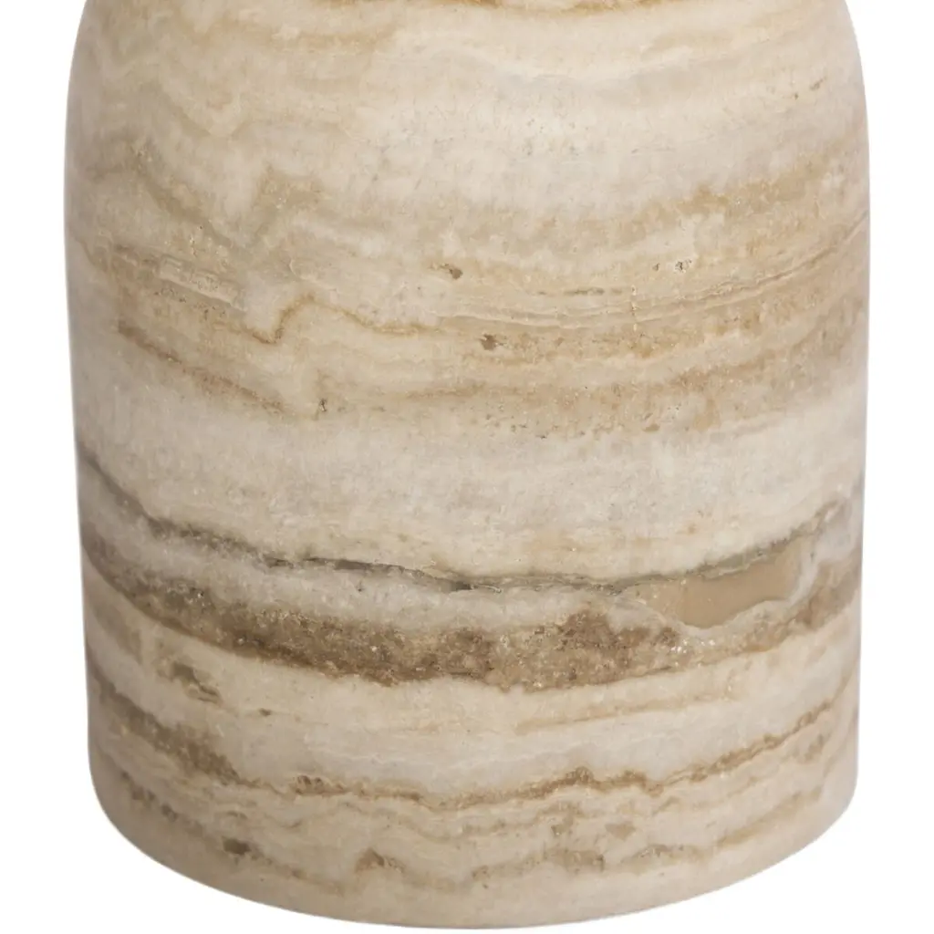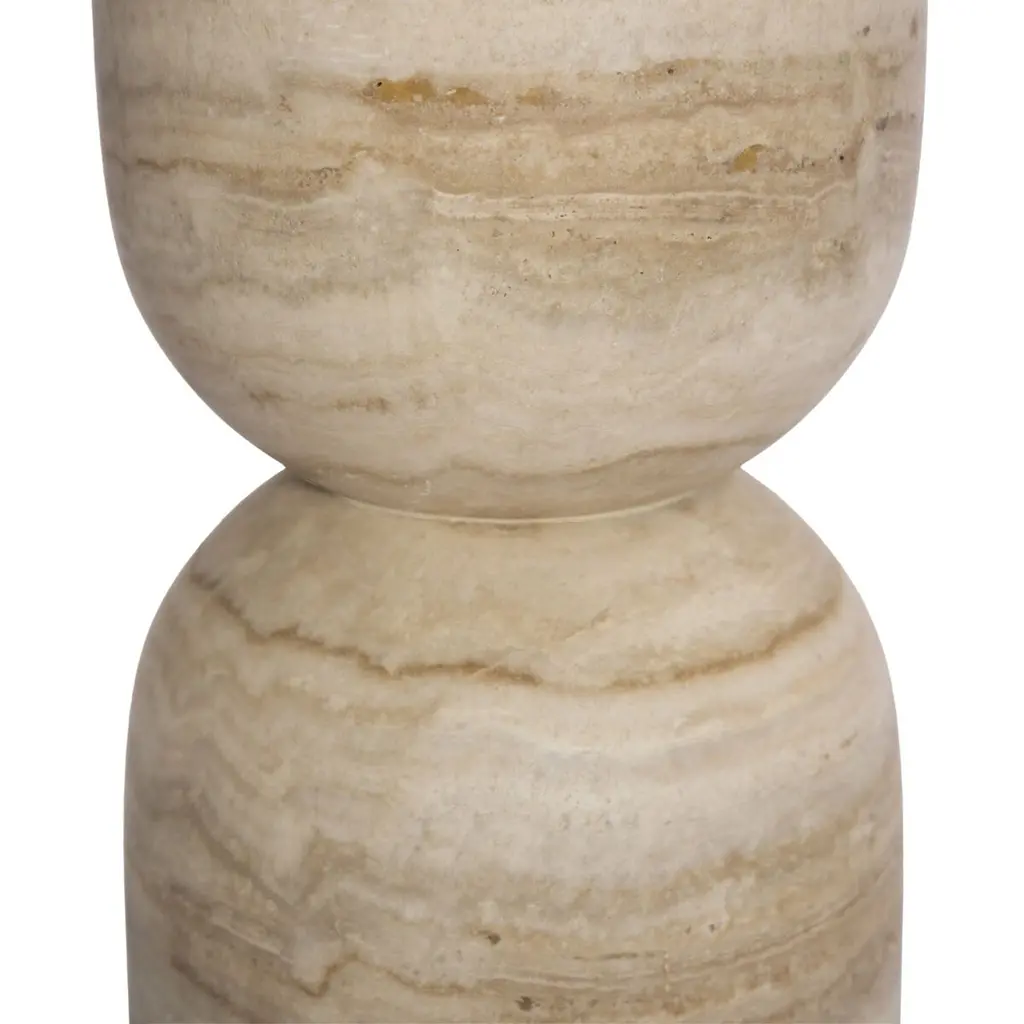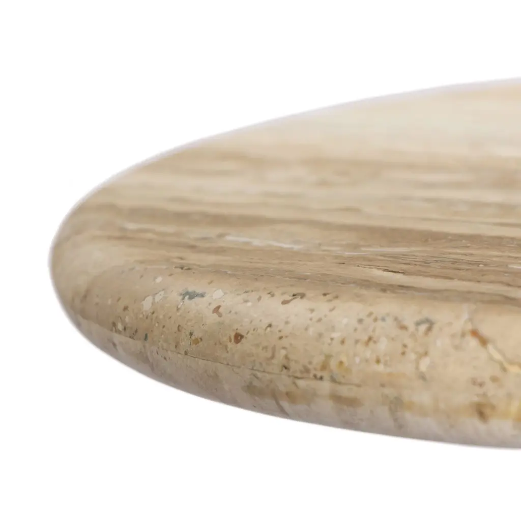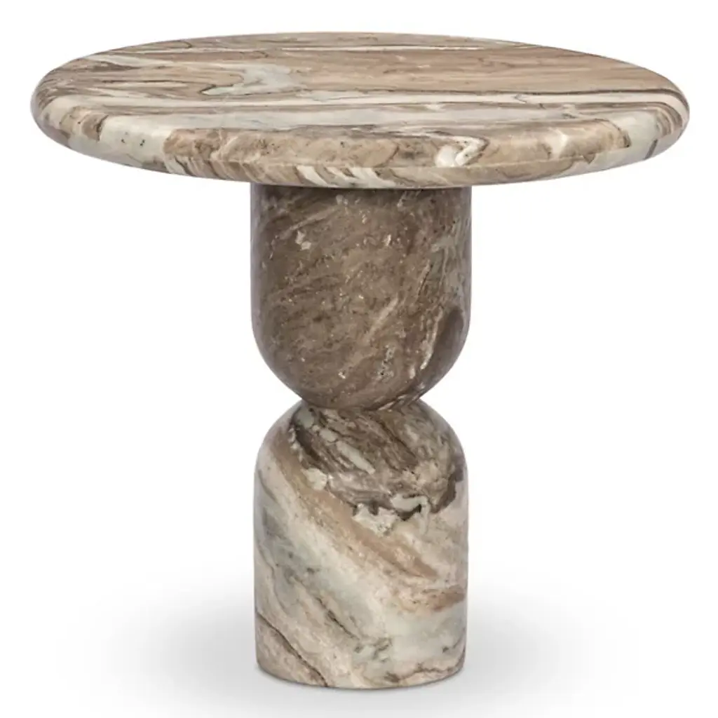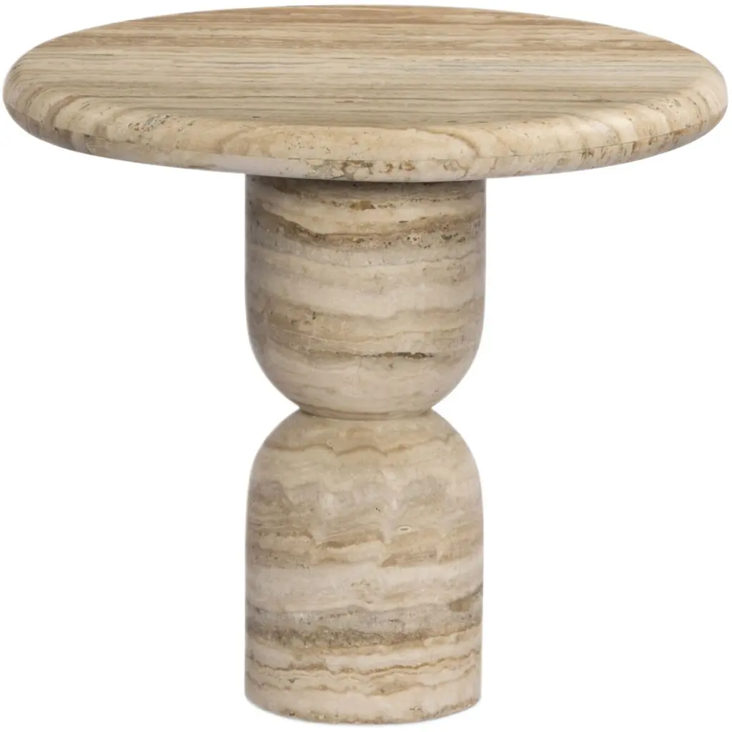 A simple, sculptural end table. Soft curves define the movement in the silhouette and veining of Travertine, accented by various shades in this natural material. A design collaboration by Amber Lewis and Four Hands.
