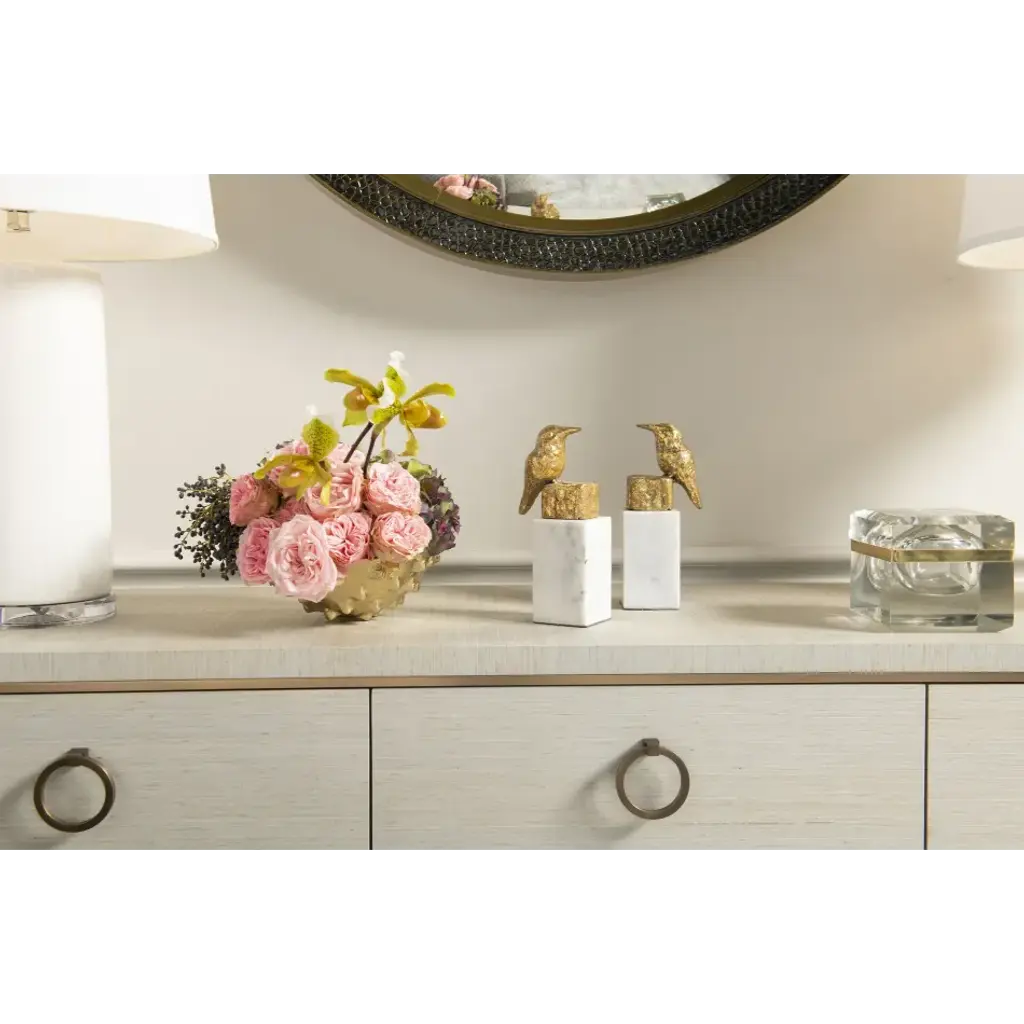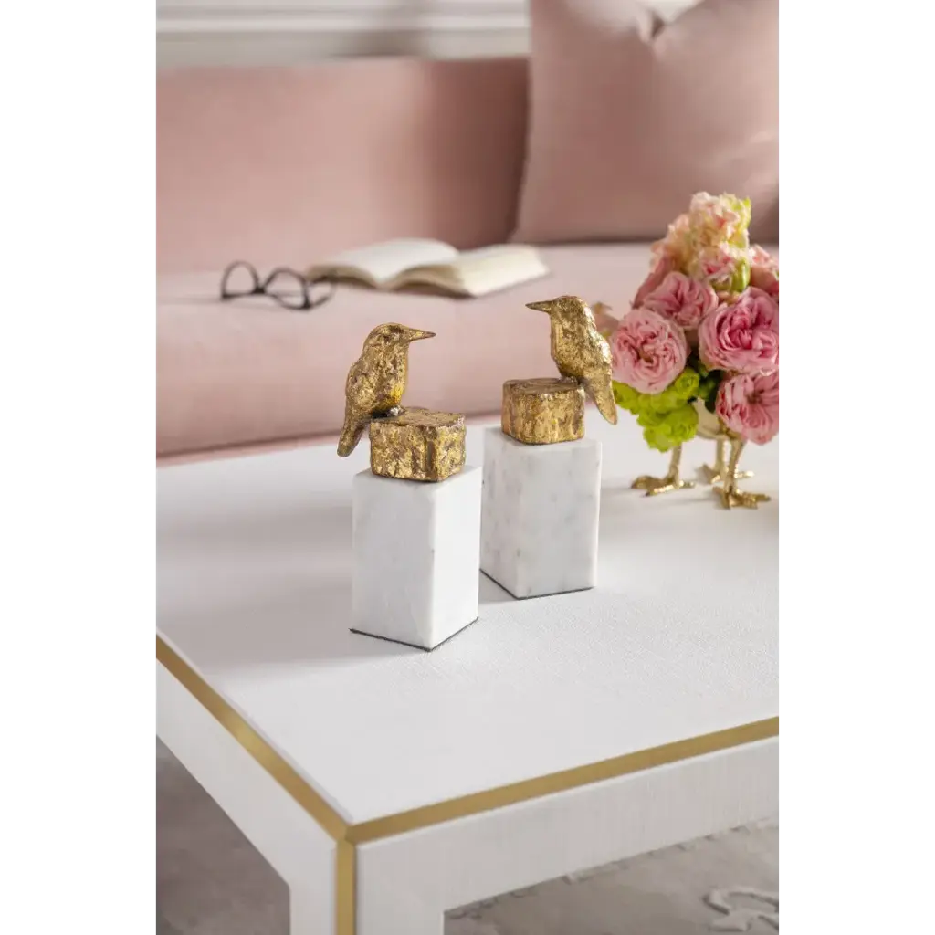 Juxtaposed with their delicate forms, the raw, elemental finish of our Finch Statues provides the petite pair of birds an unexpected boldness. It’s impossible not to admire their charming presence or gilded display, perched lightly on contrasting blocks of the same gold leaf. Elongated white marble bases give the decorative pair a distinctly sculptural feel, like magical miniature monuments for your desk, side table, console, or bookshelf. Place together or create a symmetrical motif on either side of a long tabletop or mantel, or across two side tables flanking a sofa.