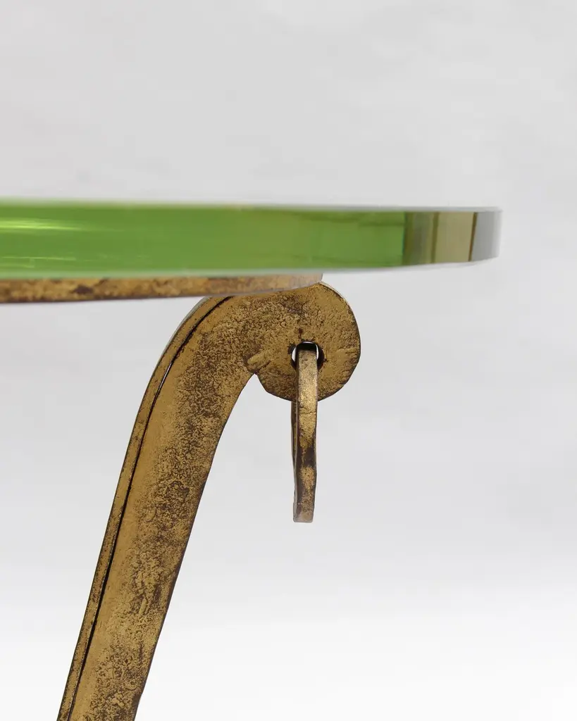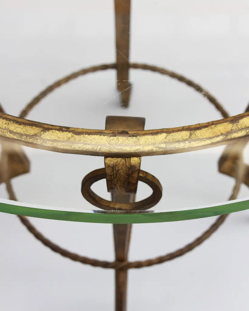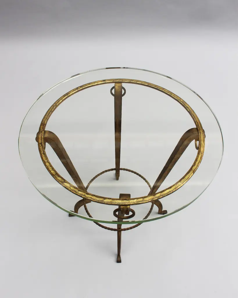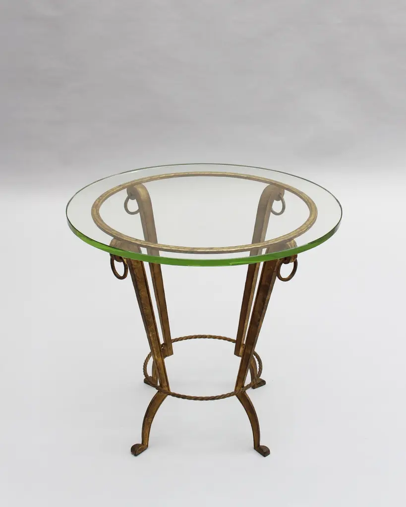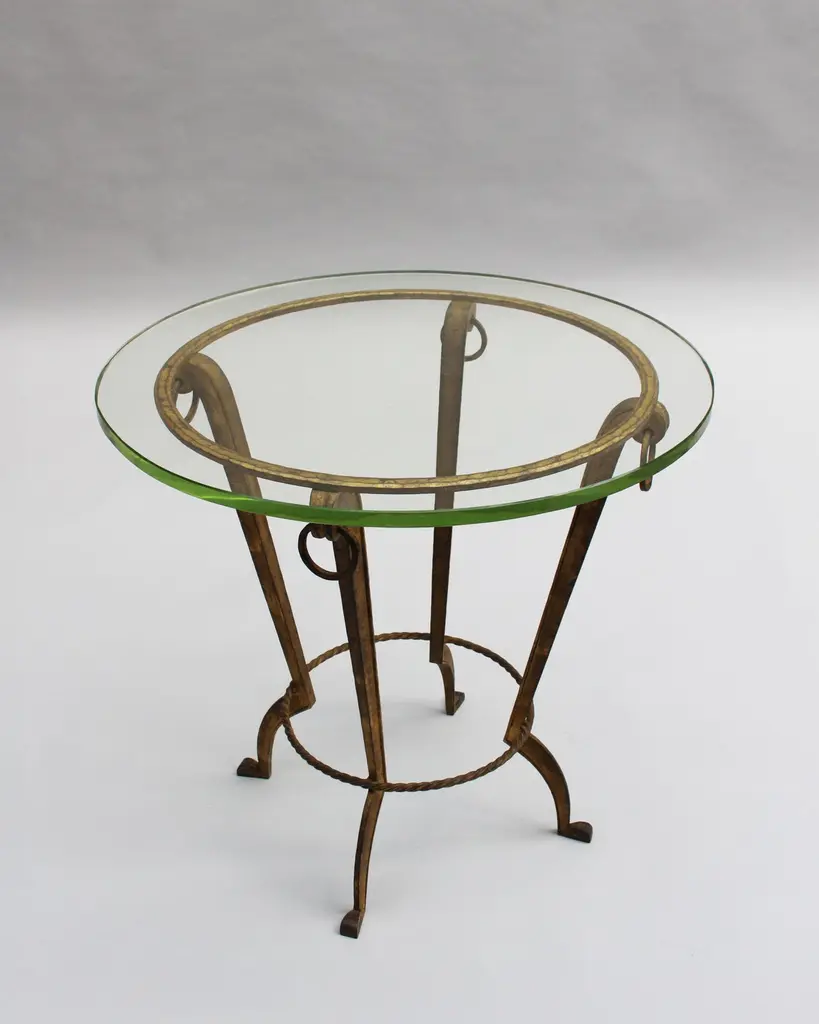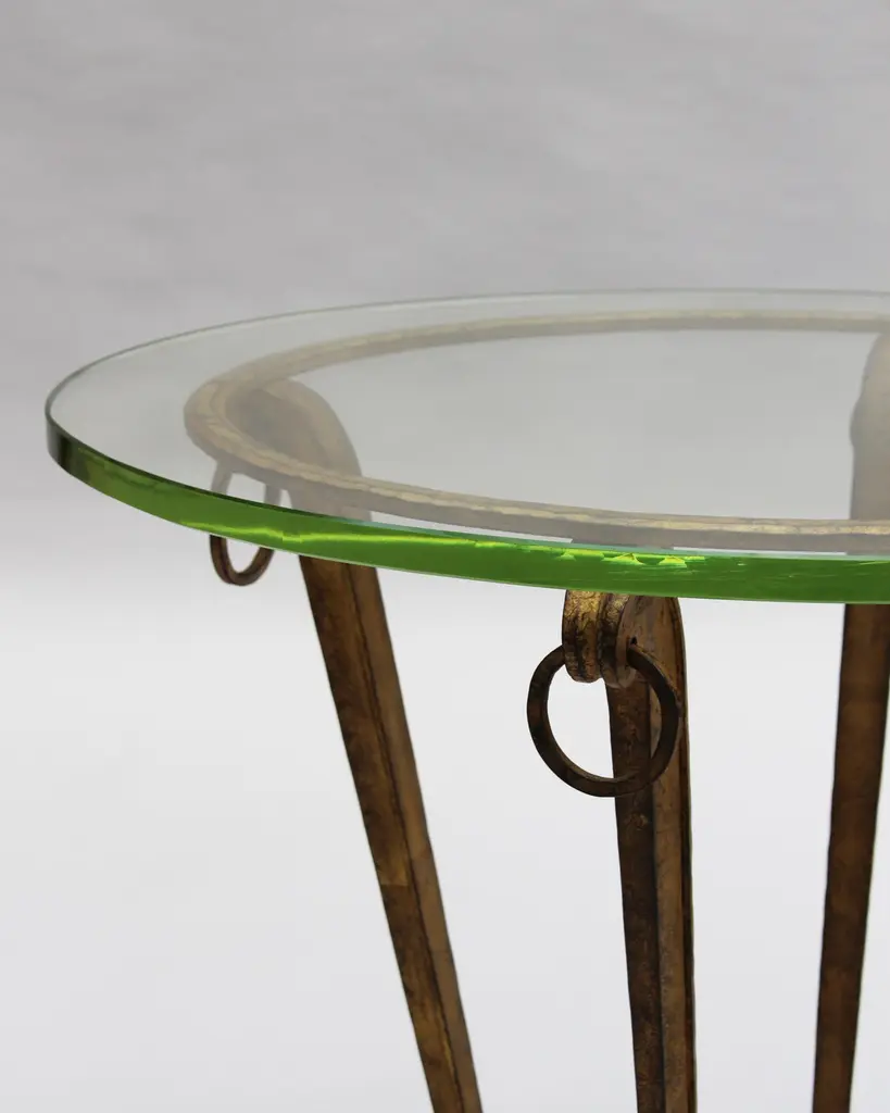 Maison Ramsay - A fine French 1940s gueridon / side table with a gilded patinated wrought iron base that supports a round glass slab top.