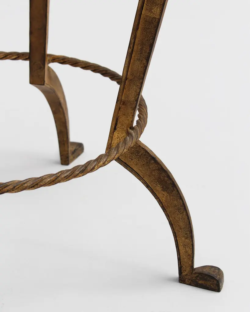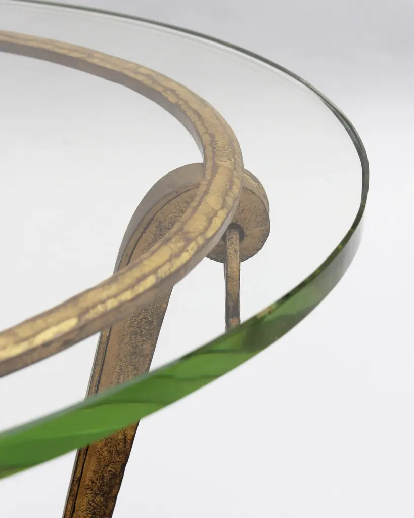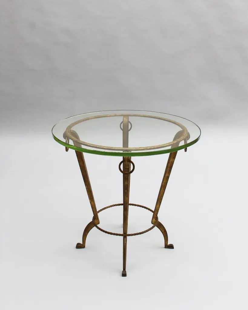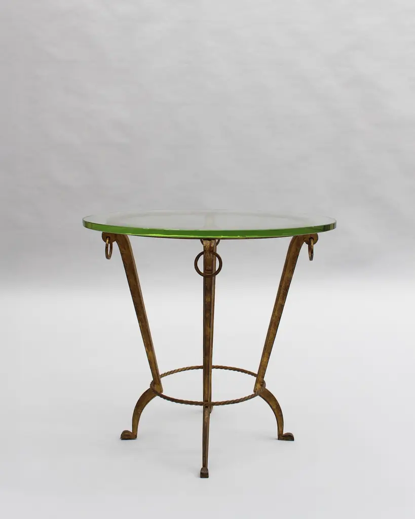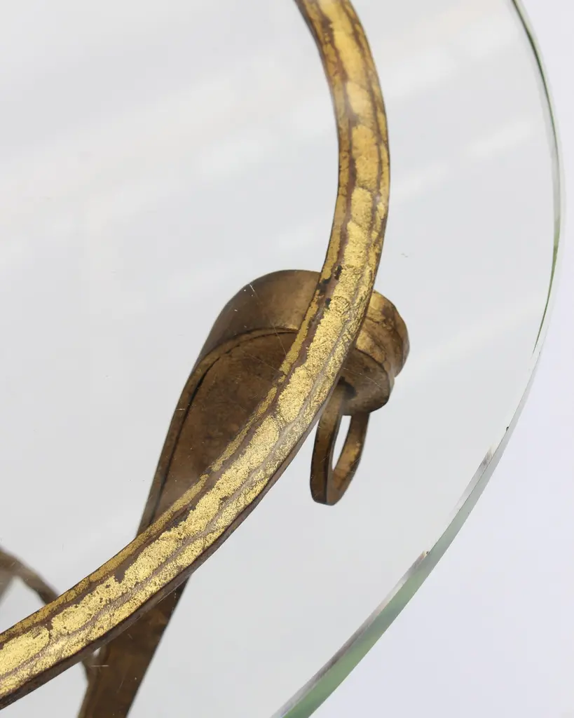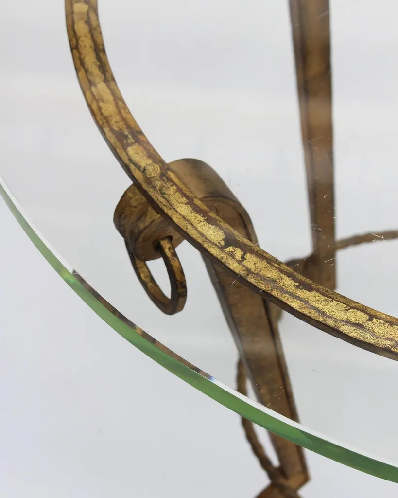 Maison Ramsay - A fine French 1940s gueridon / side table with a gilded patinated wrought iron base that supports a round glass slab top.