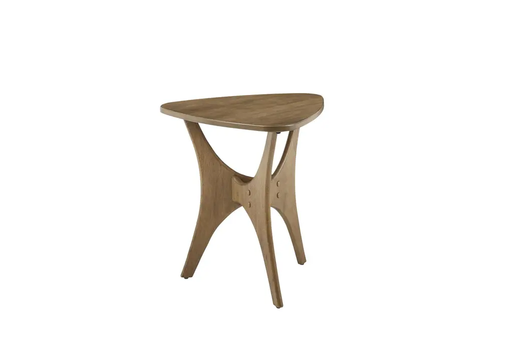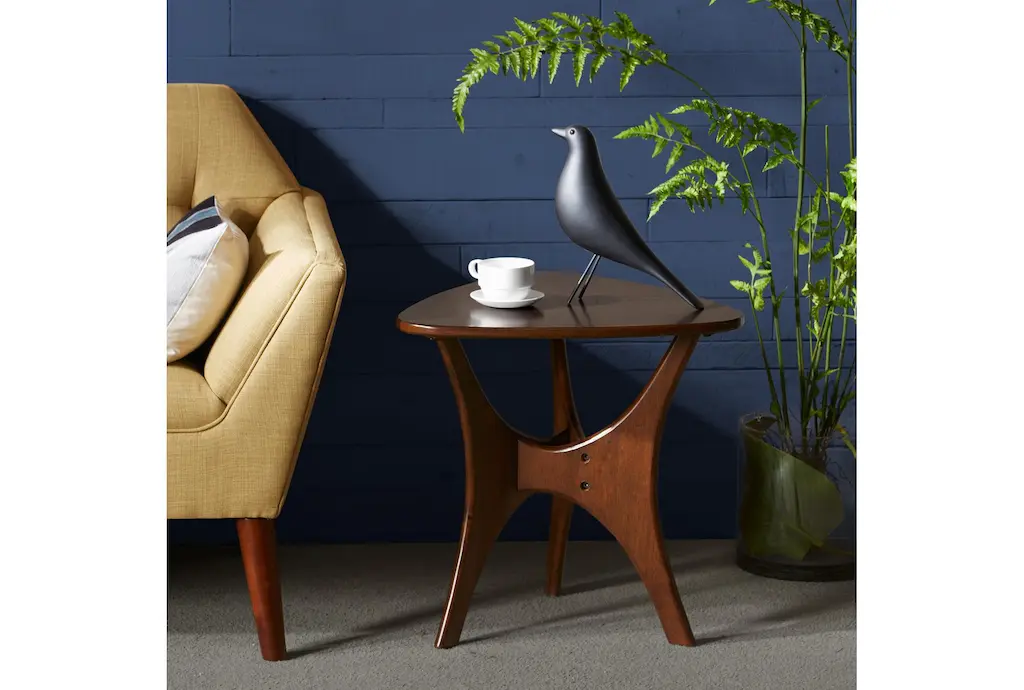 The Finnegan Side Table is a mid-century modern style piece made of engineered wood with birch veneer, featuring a curved design and arriving fully assembled. Its pecan wood finish complements any living room decor. This design also serves as the perfect bedside table.