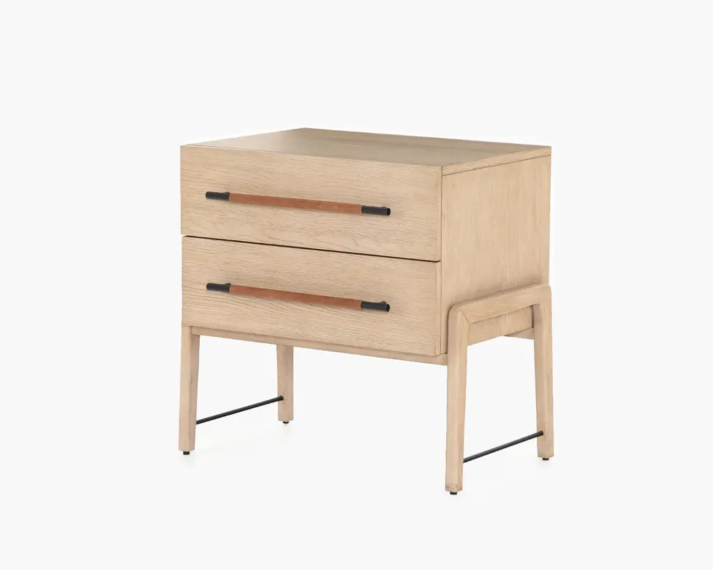 Light-finished oak forms a clean silhouette for dual drawers with iron hardware wrapped in tan top-grain leather. 27.25"w x 19.5"d x 26"h. Shipping box: 31.2"W x 22.6"D x 32.5"H, 75lbs. Assembly not required Receives Threshold delivery